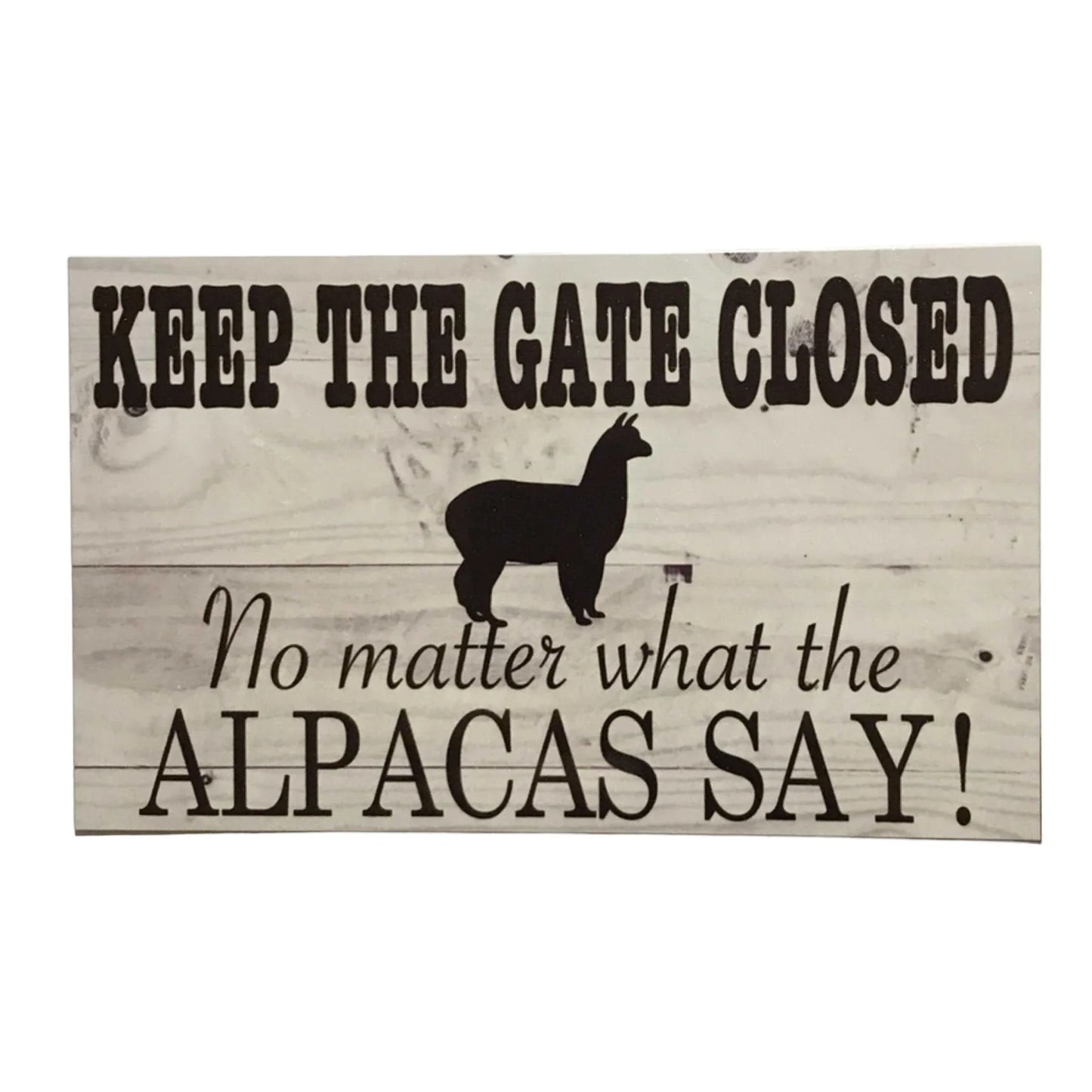Secure your property by keeping the gate closed with our Alpaca Keep The Gate Closed Alpacas Say Sign! Never give in to the persuasive Alpacas - this sign is a must-have for any pasture owner.