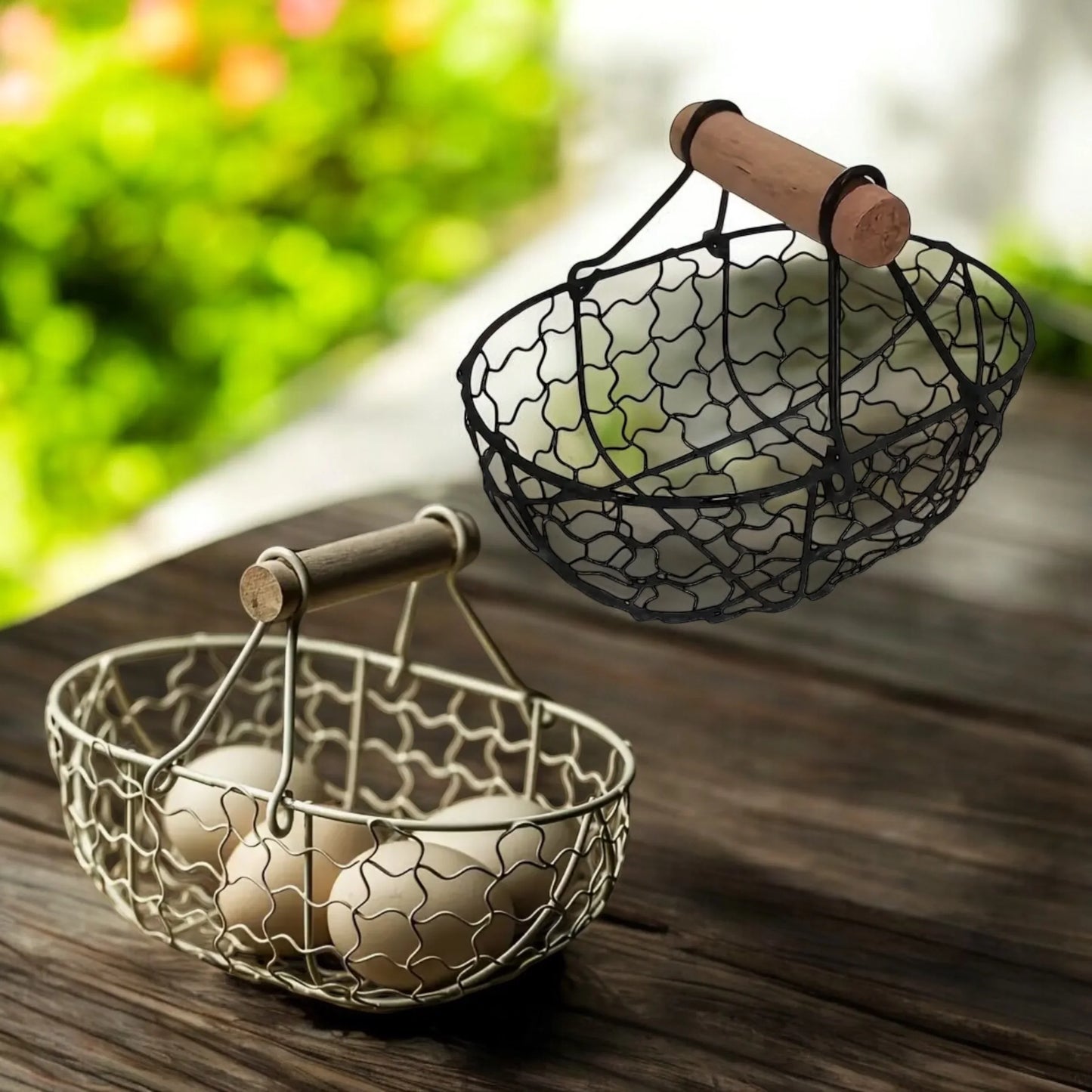 Discover the versatility and charm of these cute basket metal with wood handle! With a country farmhouse-inspired basket its perfect for displaying your eggs, fruits, vegetables, soaps, and more. Use it in the bathroom, kitchen, pantry, garden, or any room in your home for a touch of rustic elegance. Transform your space into a homesteading paradise with this must-have rustic country style organizer.