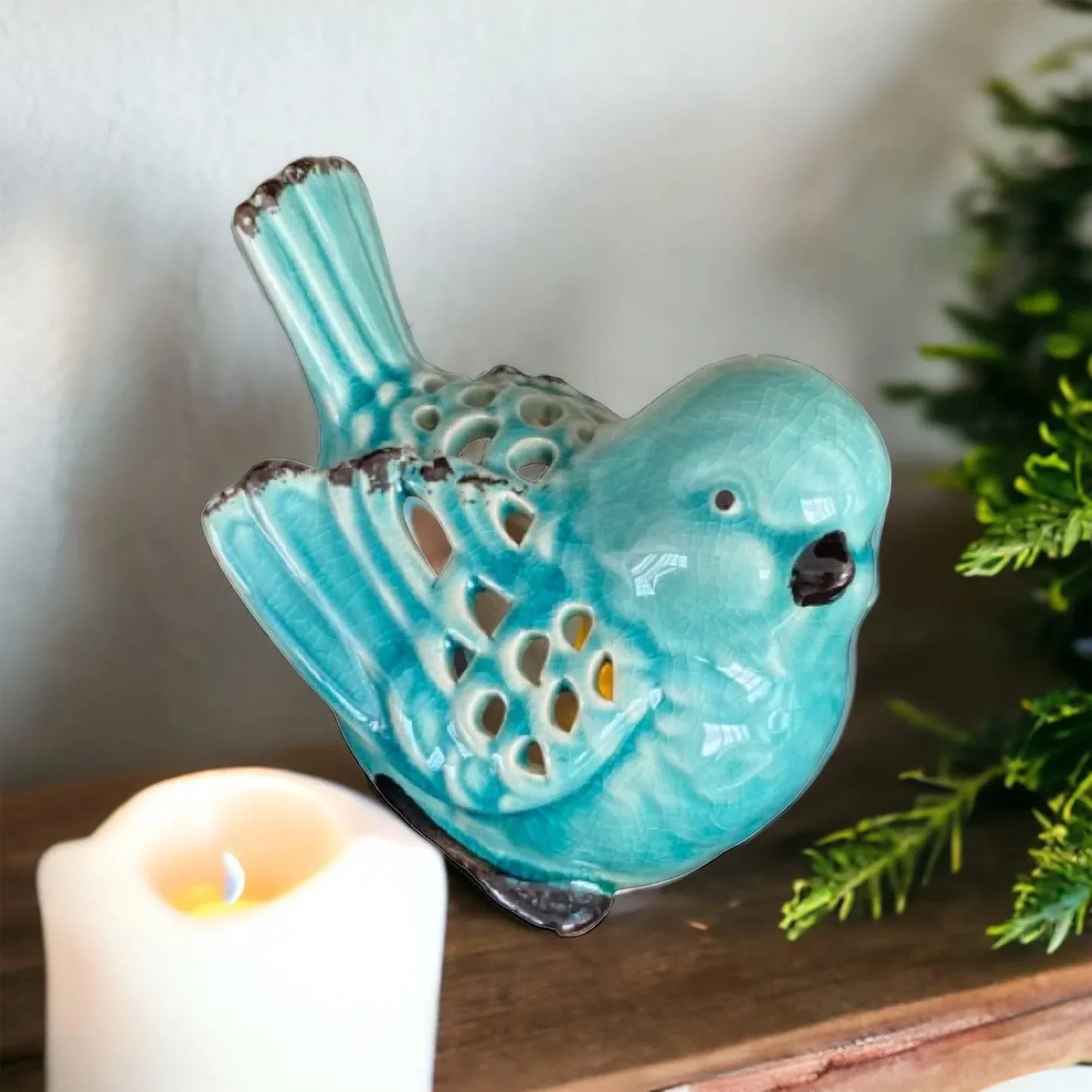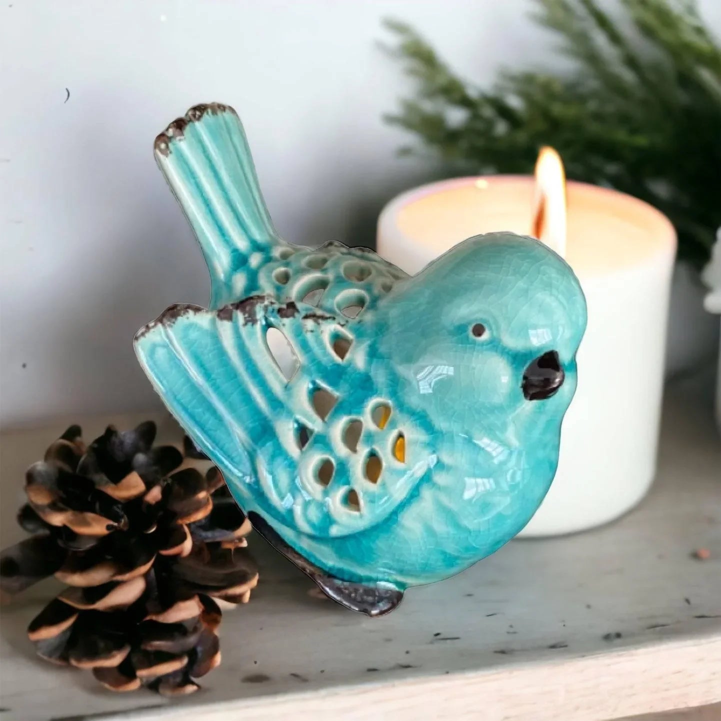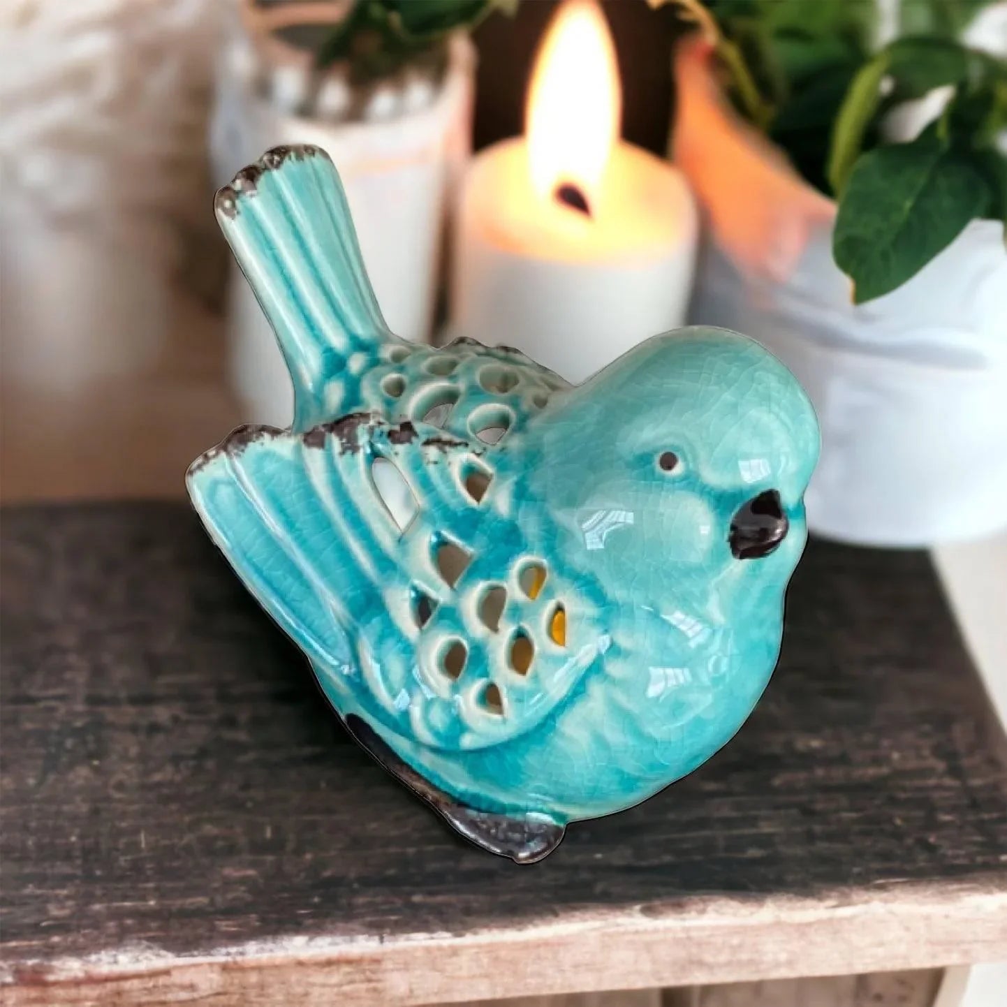 Behold this enchanting ceramic bird candle holder! It measures 11.5cm in size - perfect for setting the perfect ambiance in your home or garden. This delightful décor piece makes a great present for any bird-enthusiast, adding a touch of endearing charm to any space!