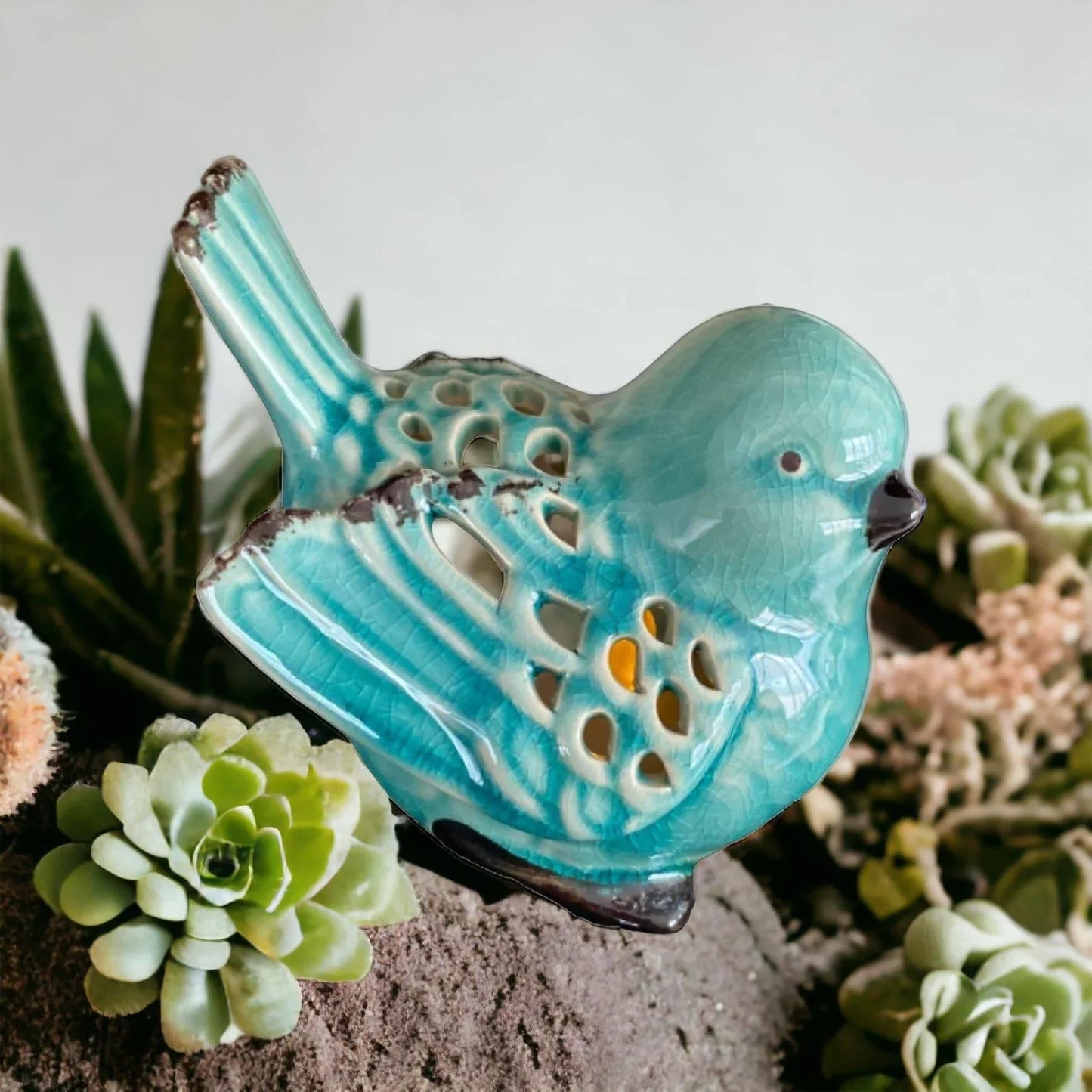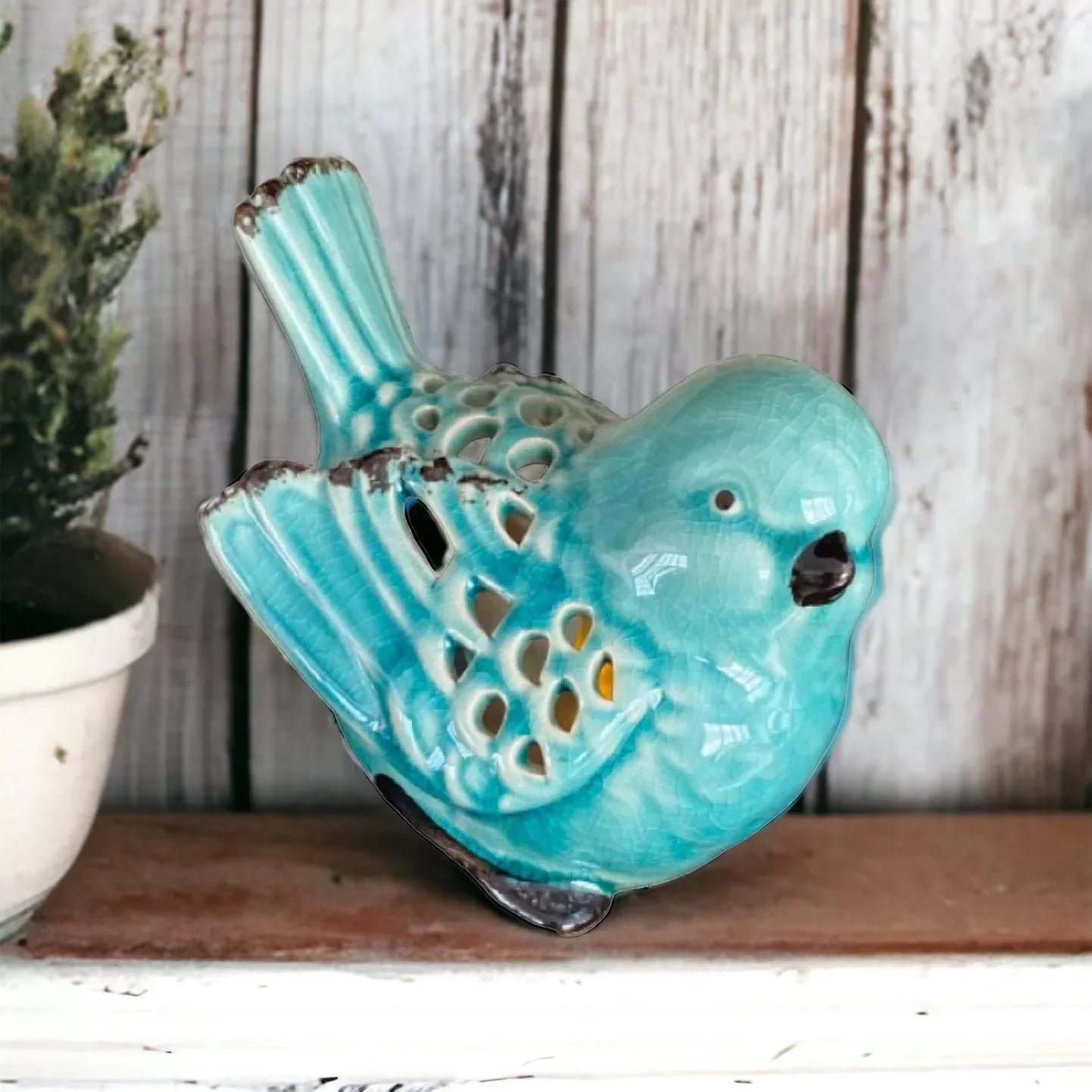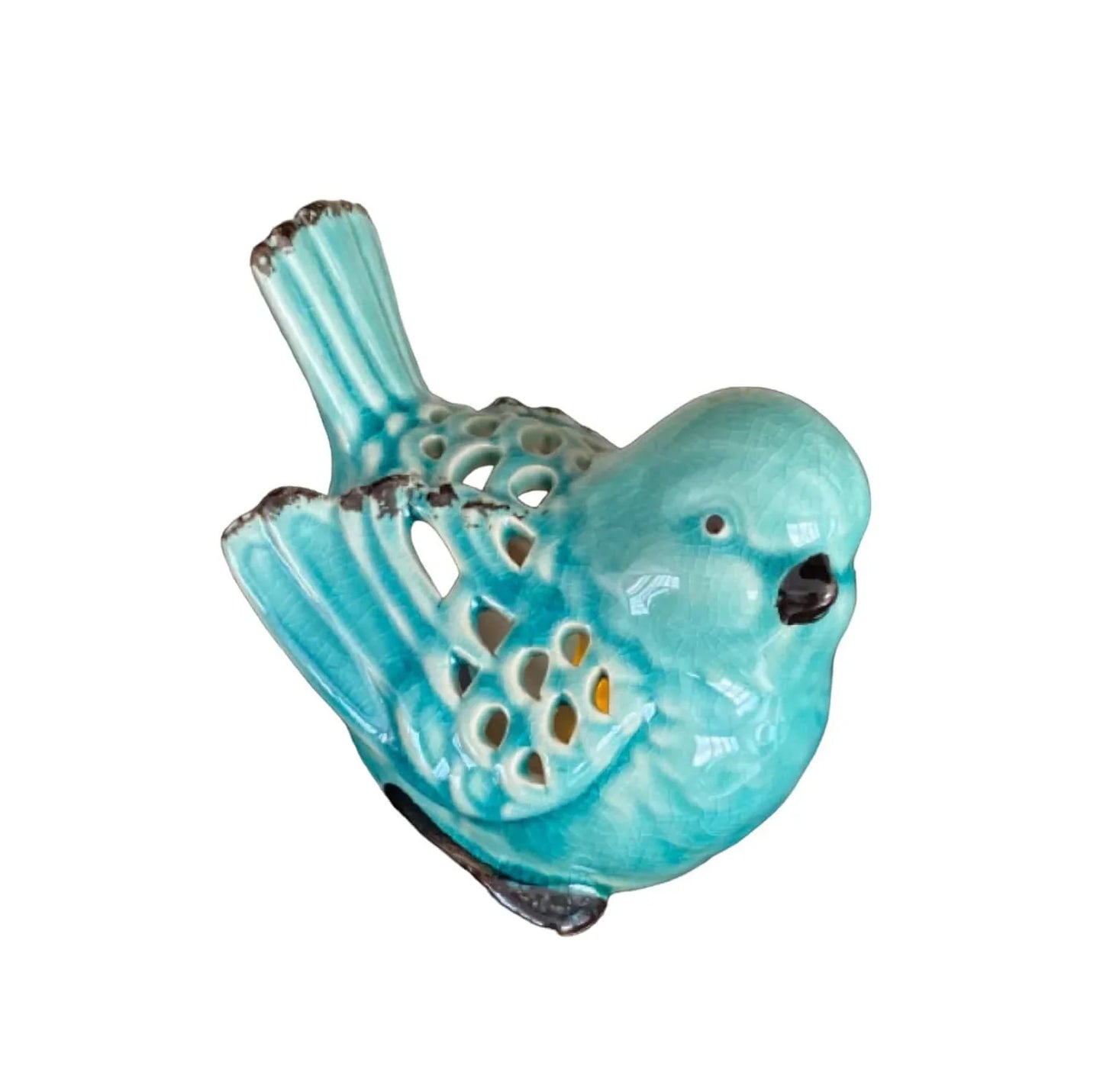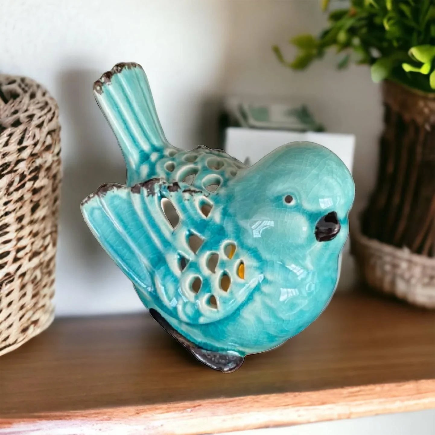 Behold this enchanting ceramic bird candle holder! It measures 11.5cm in size - perfect for setting the perfect ambiance in your home or garden. This delightful décor piece makes a great present for any bird-enthusiast, adding a touch of endearing charm to any space!
