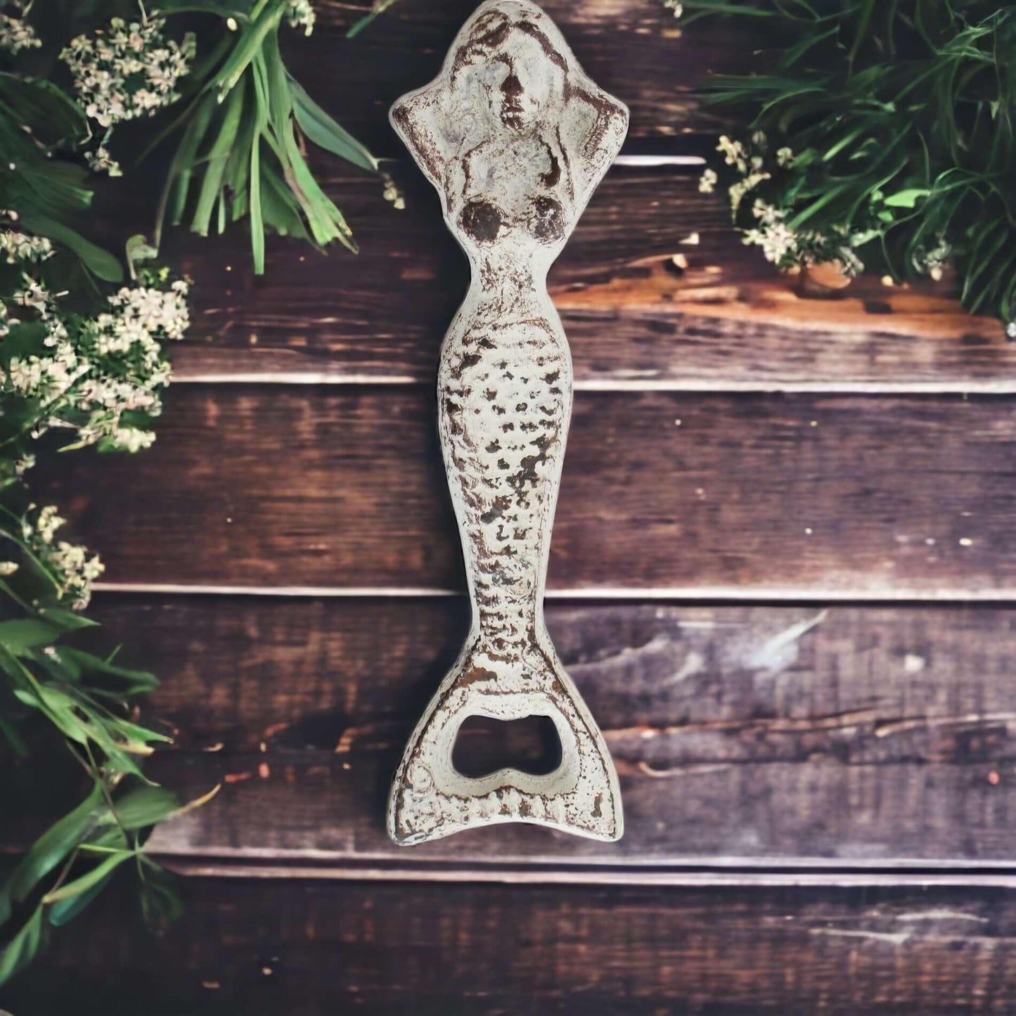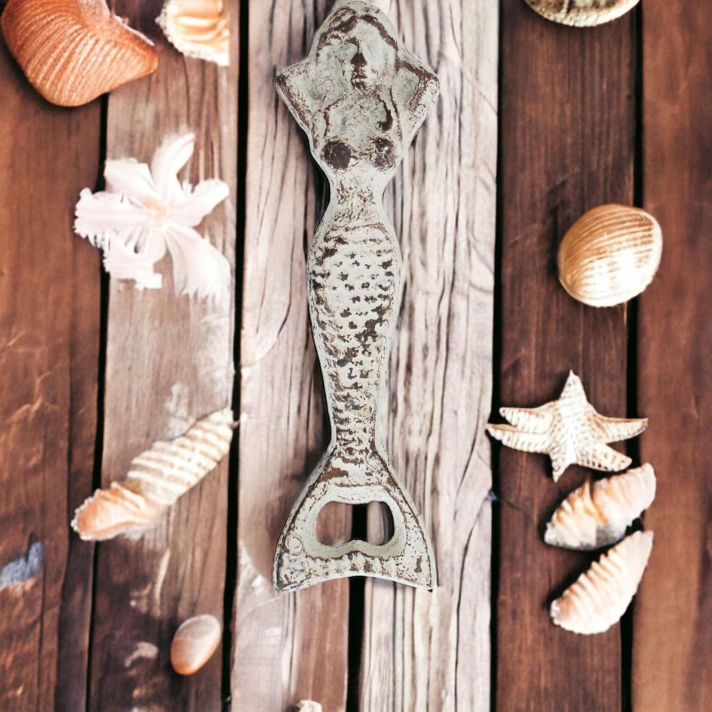 Show your love for mermaids with this charming bottle opener. Enhance your home's Coastal Beach House style with this stylish Cast Iron opener, measuring approximately 5 cm x 17 cm x 2 cm. It makes a great gift for any occasion.