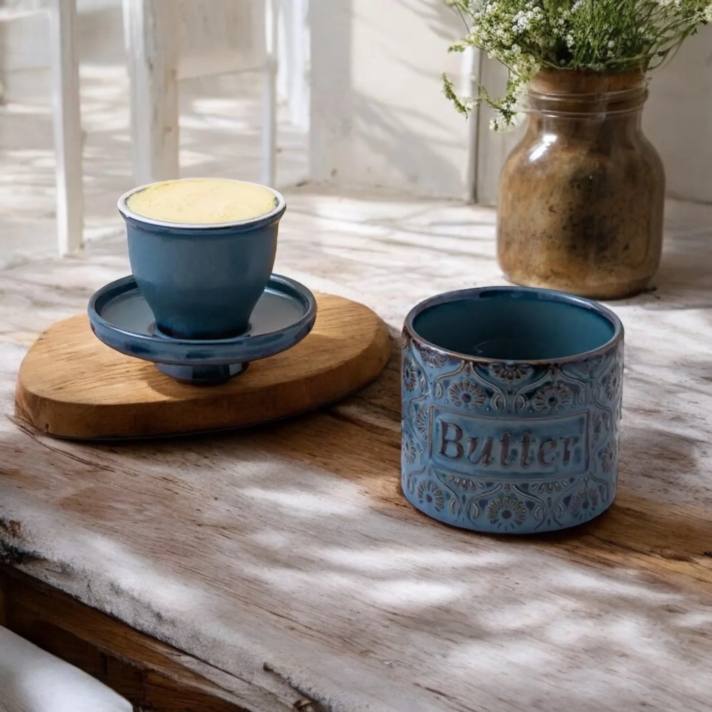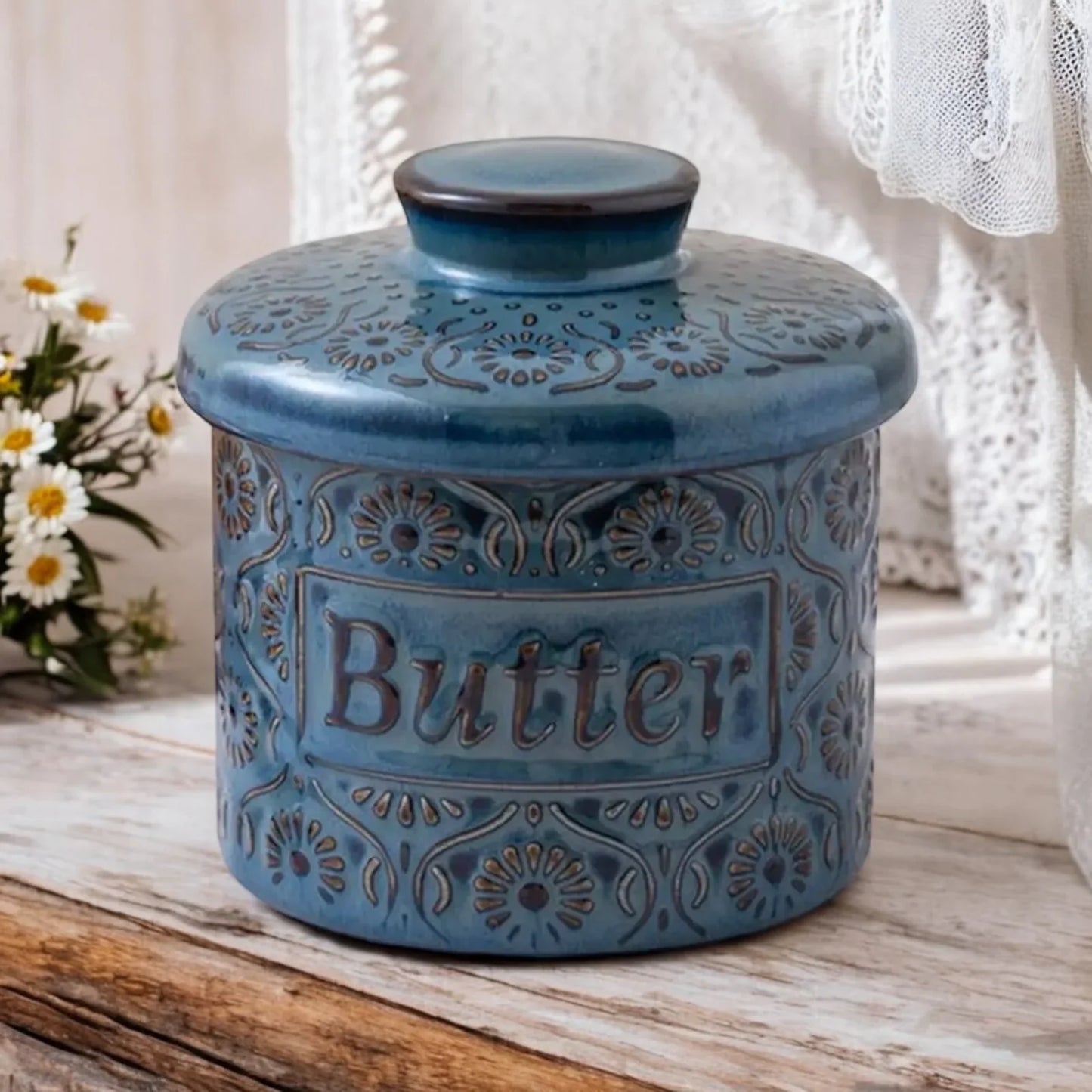 This exquisite Butter Crock Storage in a vintage blue color is crafted from high-quality ceramic, measuring approximately 11.5cm x 11.5cm x 11cm. Its unique design will add a touch of elegance to your kitchen and keep your butter fresh and spreadable. Don't miss out on this must-have for any Farmhouse to Coastal Style kitchen!