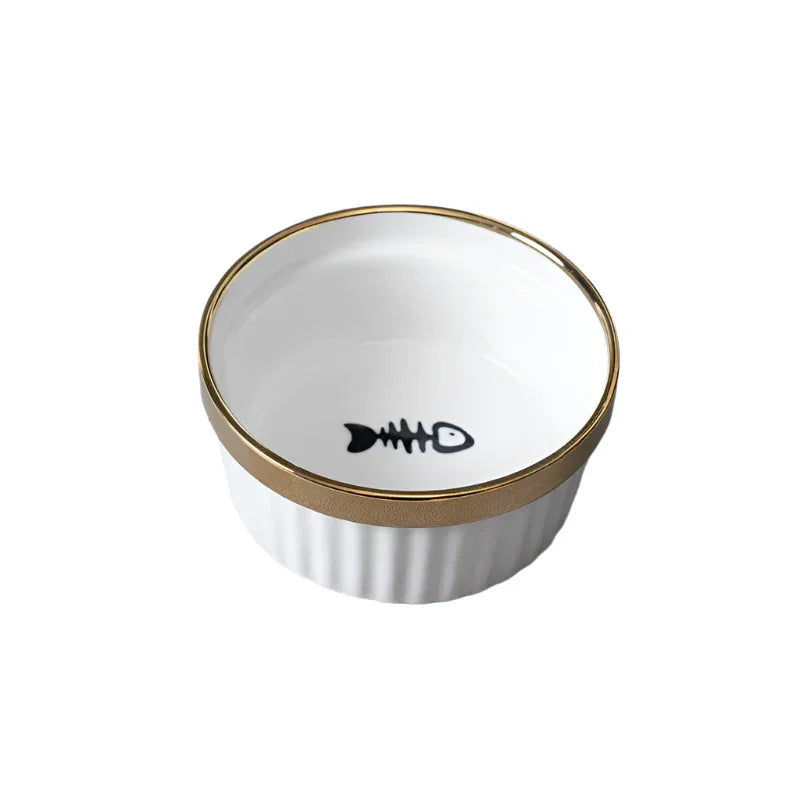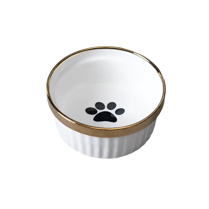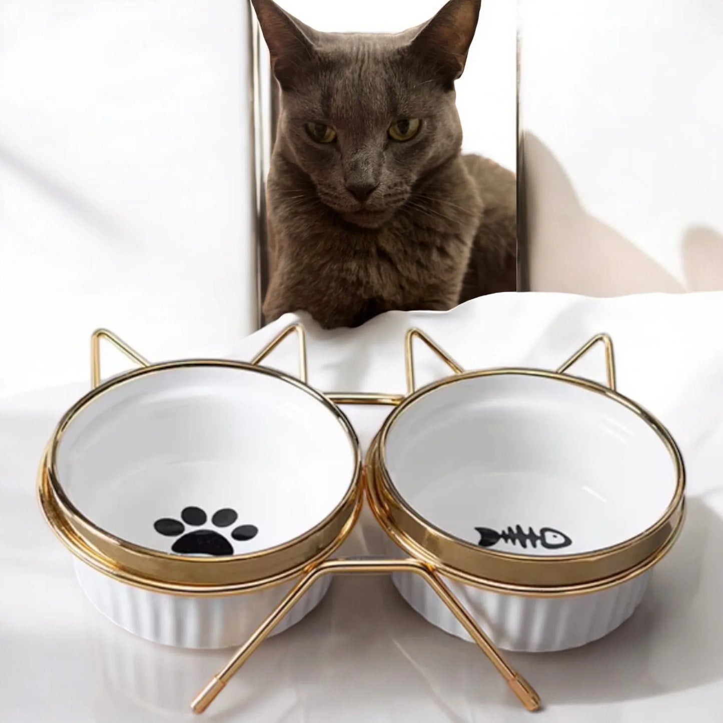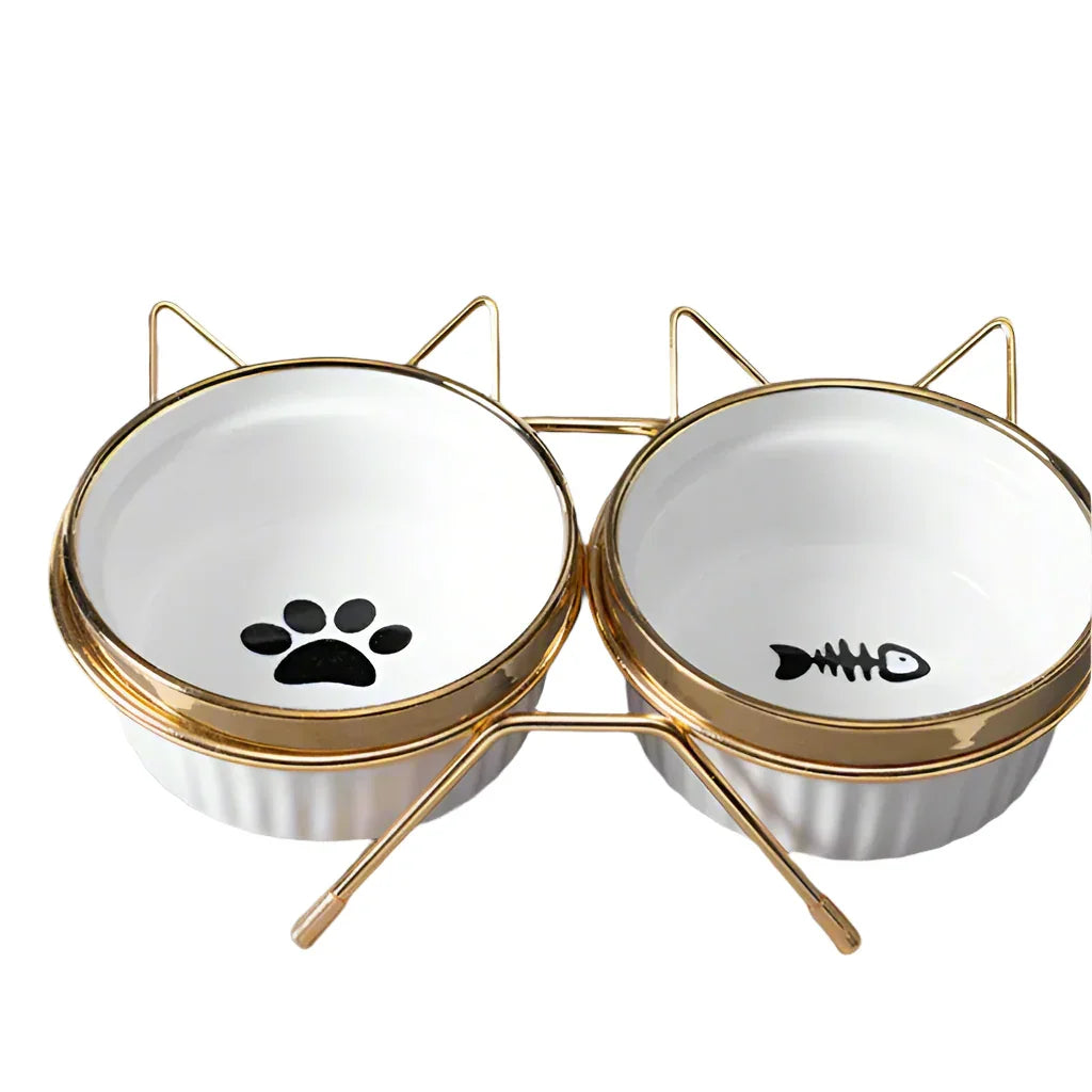 Pamper your feline friend with our elegant Cat Bowl with Stand Gold White! This set of double bowls is designed to elevate mealtime and prevent neck strain. The sleek metal stand and stylish ceramic bowls bring a touch of style to any home.