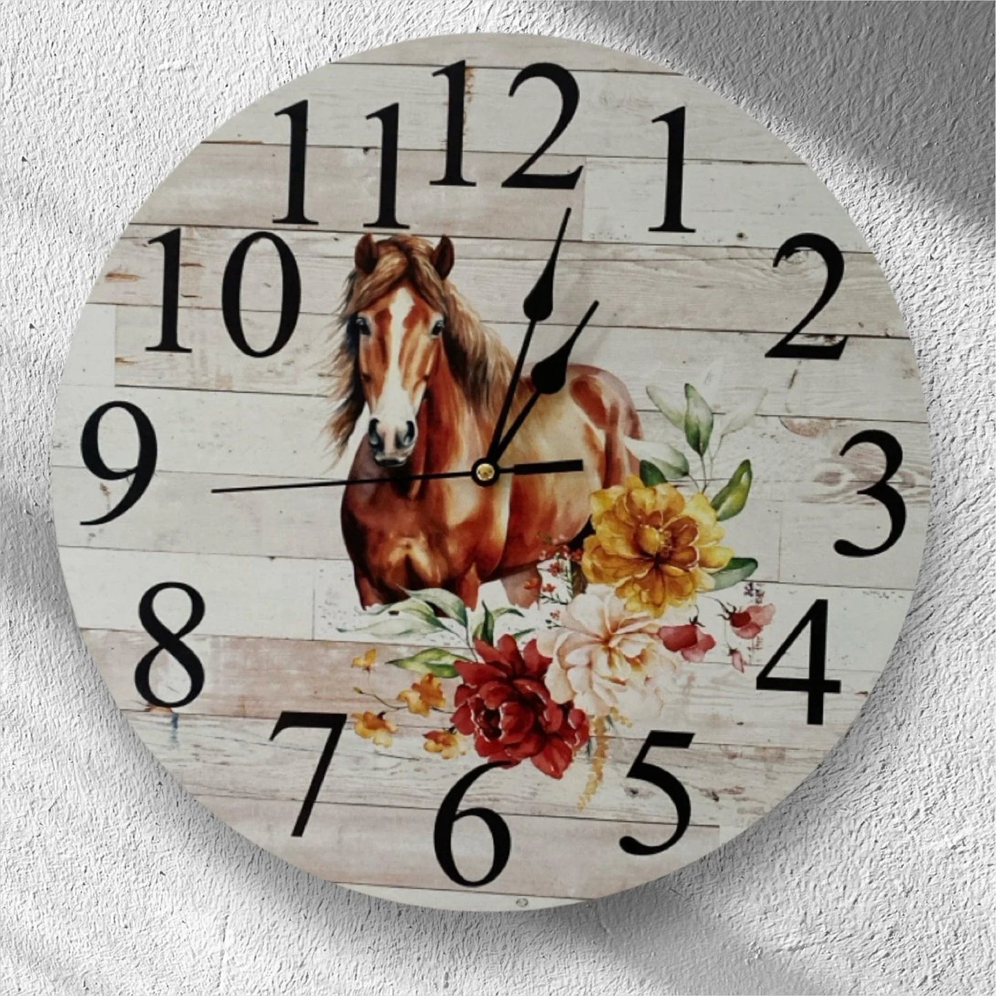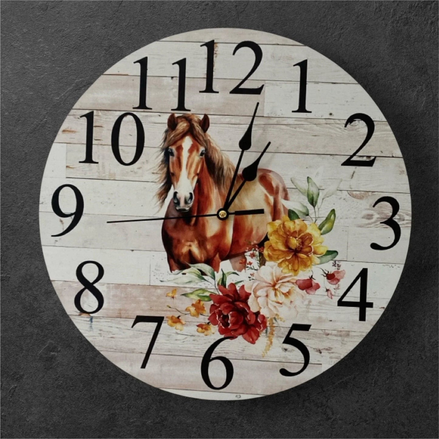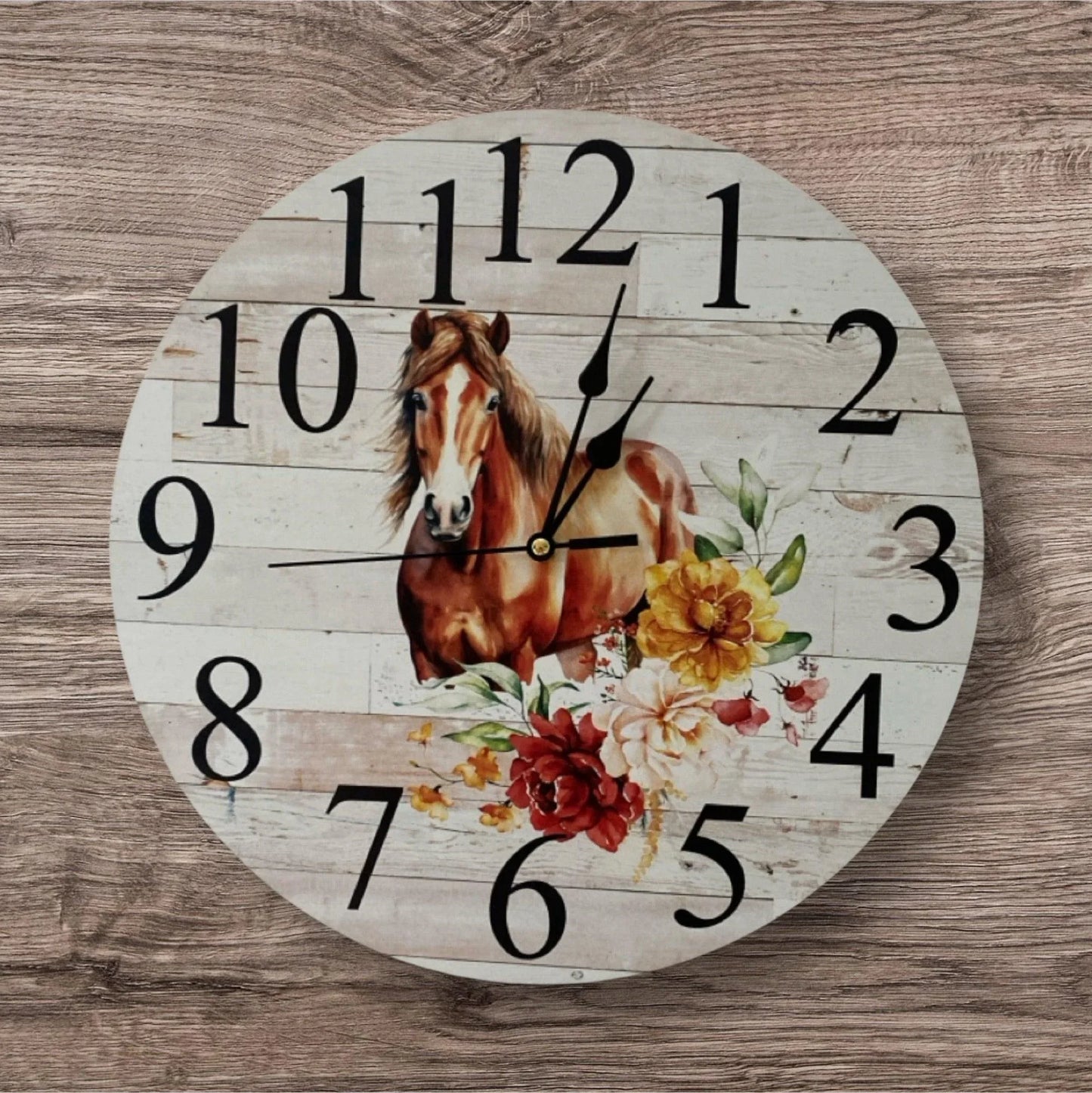 Embrace the rustic charm of our Aussie made Clock Wall barb Horse Floral, featuring a stunning timber design and a charming floral touch. Get that perfect country farmhouse feel in your home today! This Clock is handcrafted and uniquely designed by a passionate Husband and Wife duo in Australia so your supporting an Aussie Family!! With free delivery available across Australia, this Wall Clock is a must-have for any home or business, adding the perfect touch to your decor. Made from MDF wood, quality quartz clock mechanism which uses x 1 AA Battery (No Battery Included)