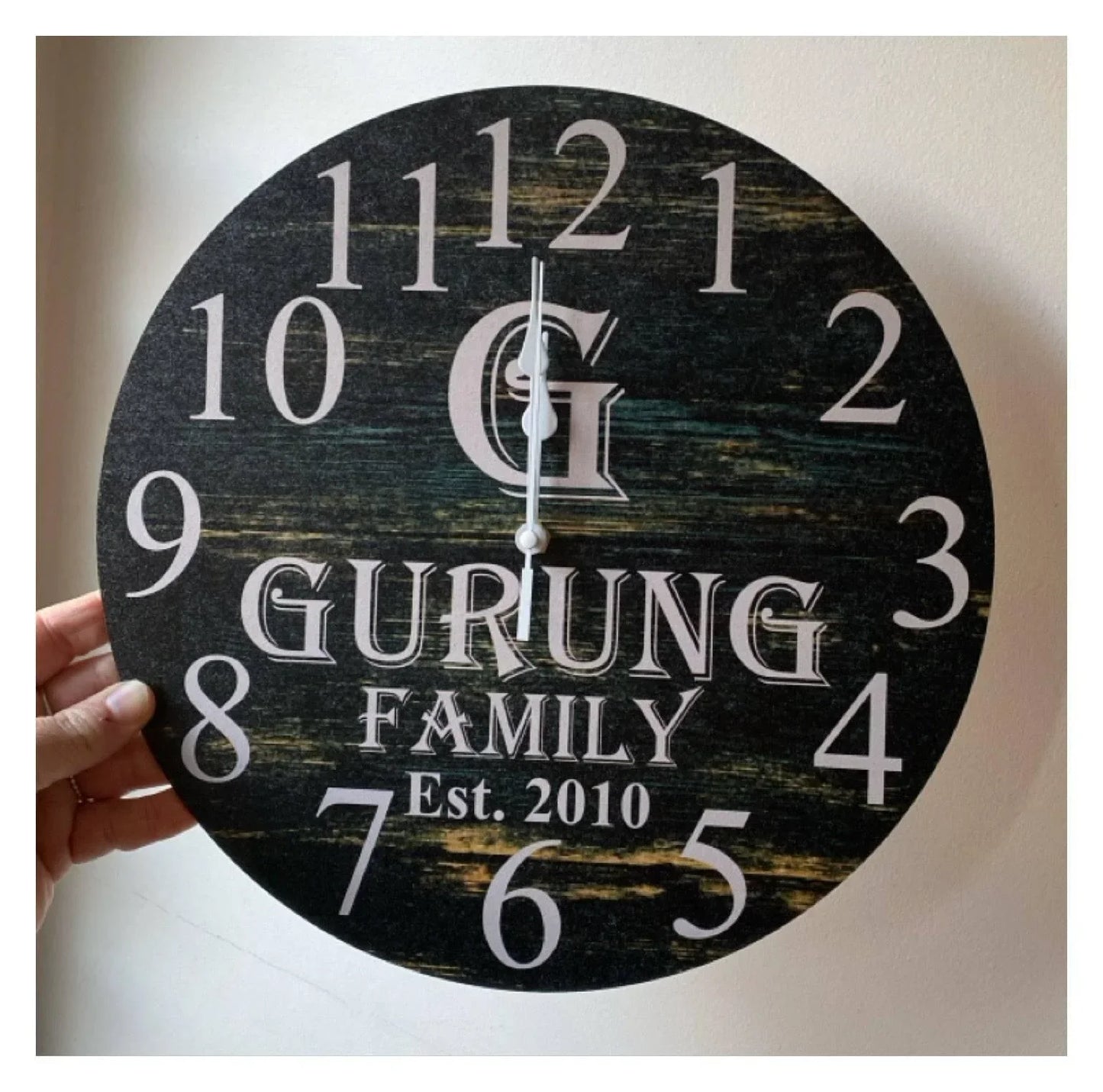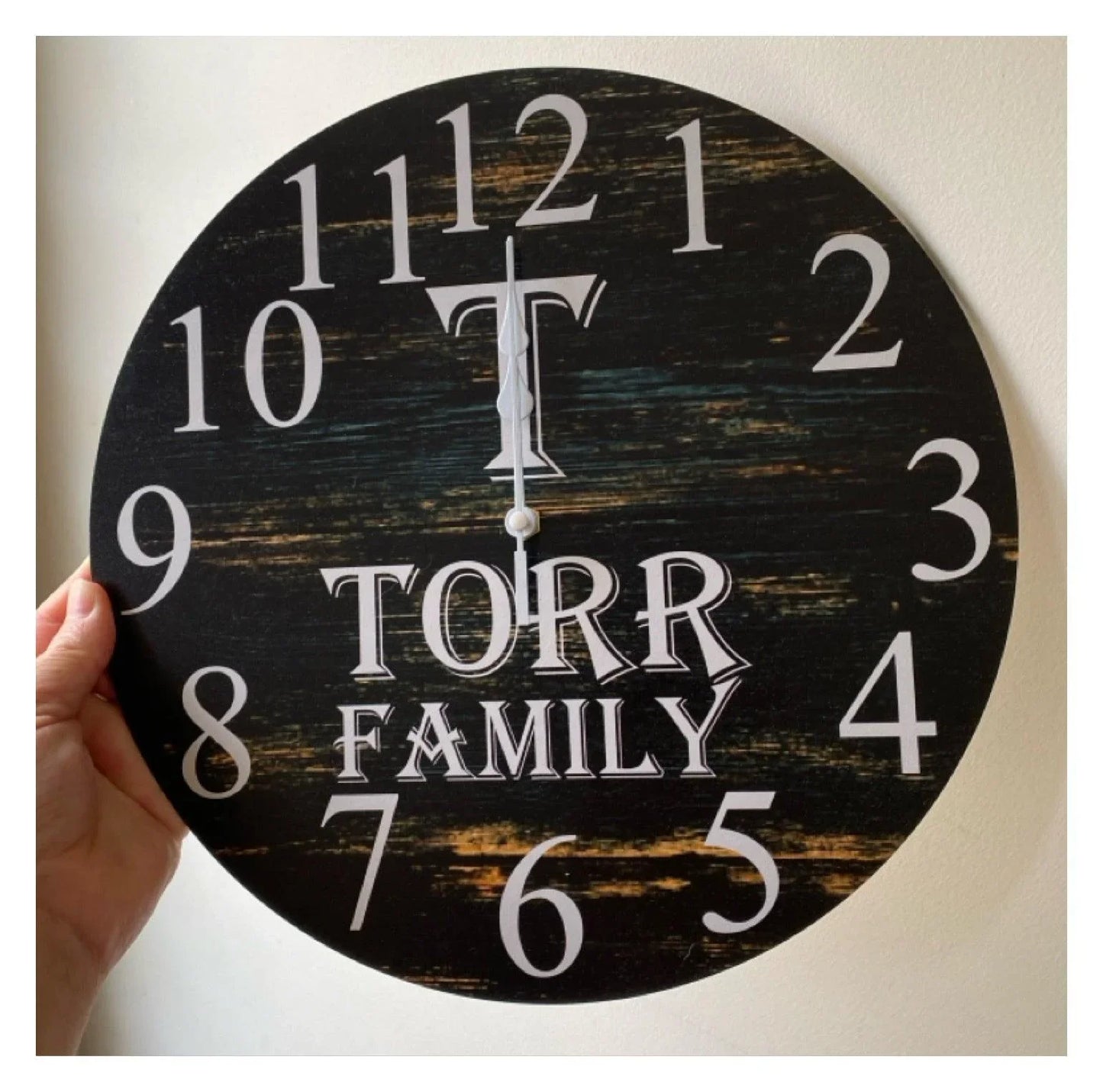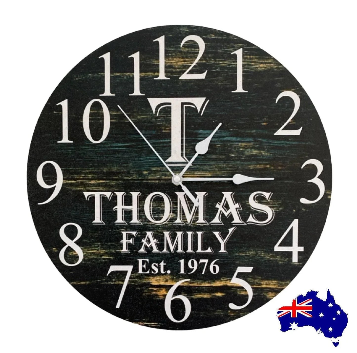 This stunning Customised clock is handcrafted and uniquely designed by a passionate Husband and Wife duo in Australia so your supporting an Aussie Family!! With free delivery available across Australia, this Wall Clock is a must-have for any home or business, adding the perfect personalised touch to your decor. Made from MDF wood, quality quartz clock mechanism which uses x 1 AA Battery (No Battery Included) this clock boasts an approximate size of 30cm wide, .3cm thick, and 30cm high.