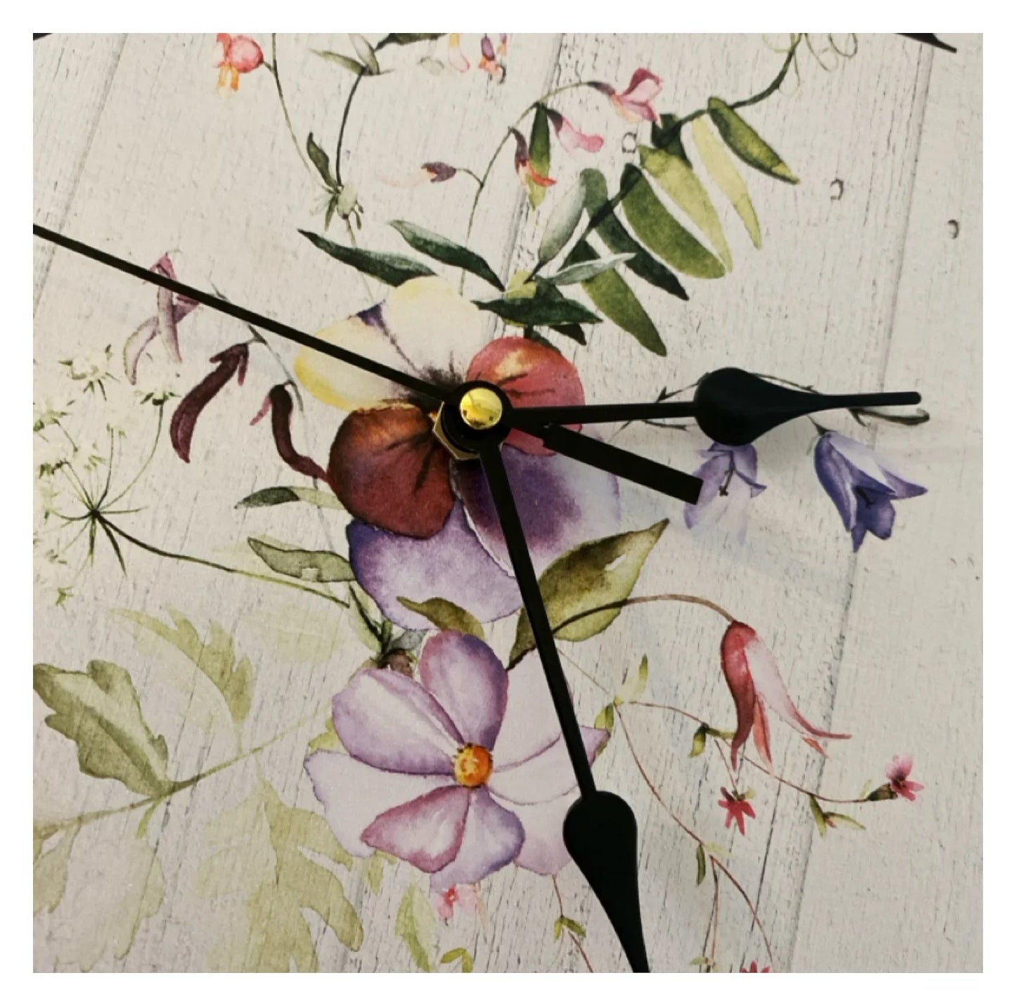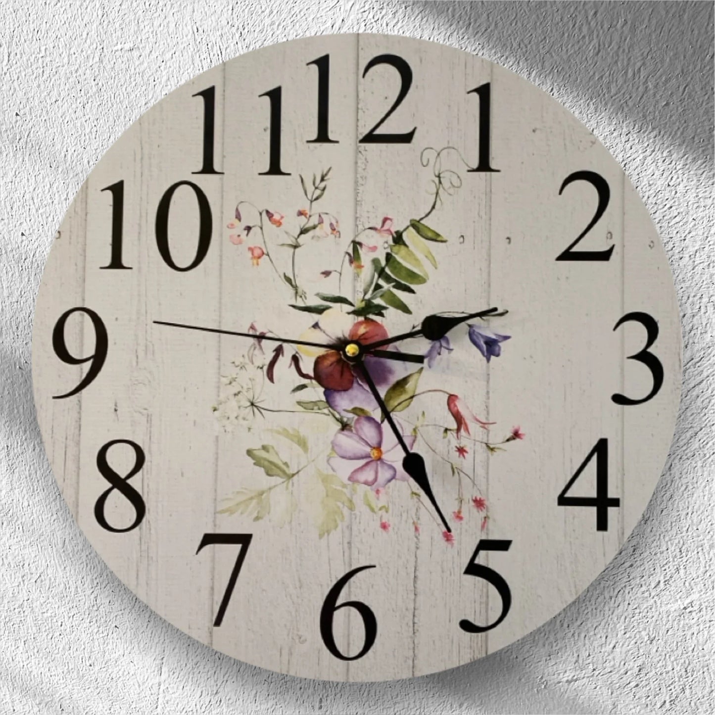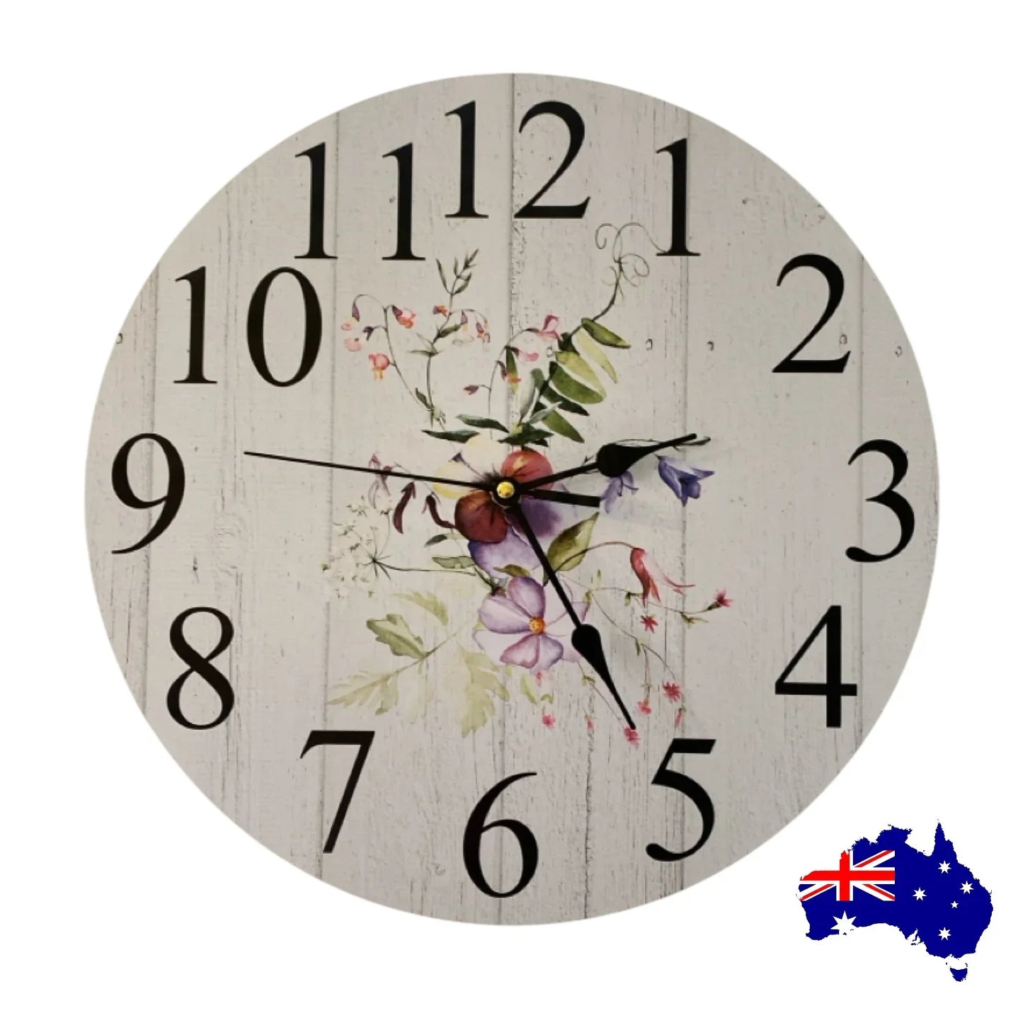 Embrace the beautiful floral flower garden charm of our Aussie made Clock Wall Wooden White Wash style, featuring stunning pansy, purple, pinks, green leaves, white tones design. Get that perfect cottage country farmhouse feel in your home today! This Clock is handcrafted and uniquely designed by a passionate Husband and Wife duo in Australia so your supporting an Aussie Family!! With free delivery available across Australia, this Wall Clock is a must-have for any home or business, adding the perfect touch to your decor. Made from MDF wood, quality quartz clock mechanism which uses x 1 AA Battery (No Battery Included)