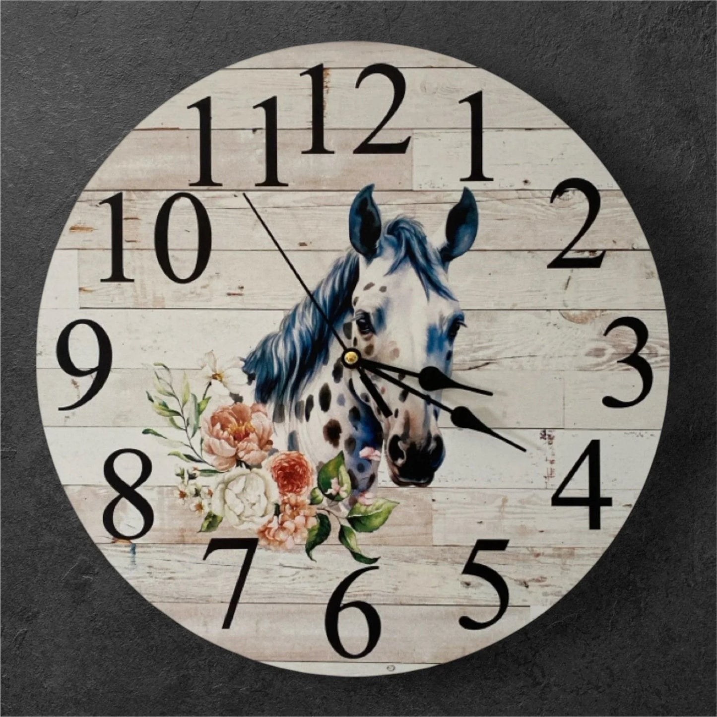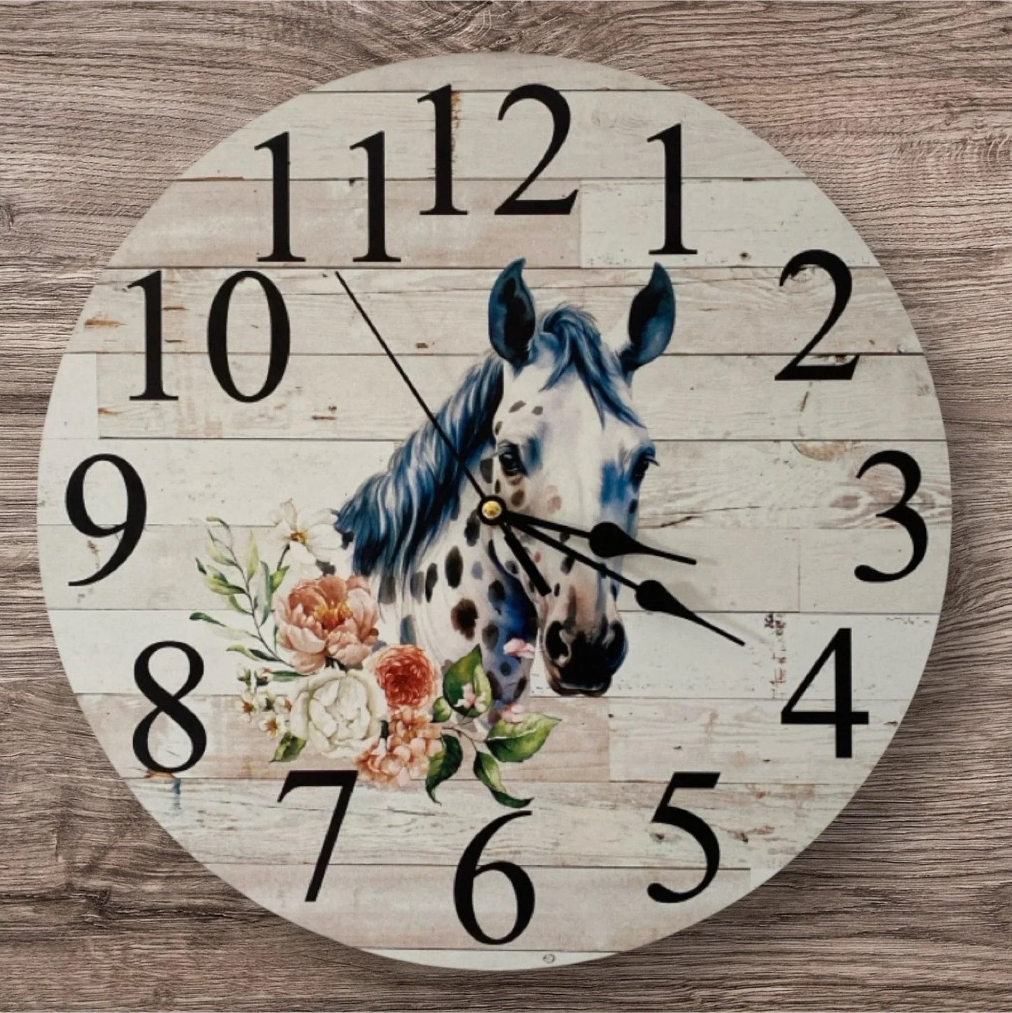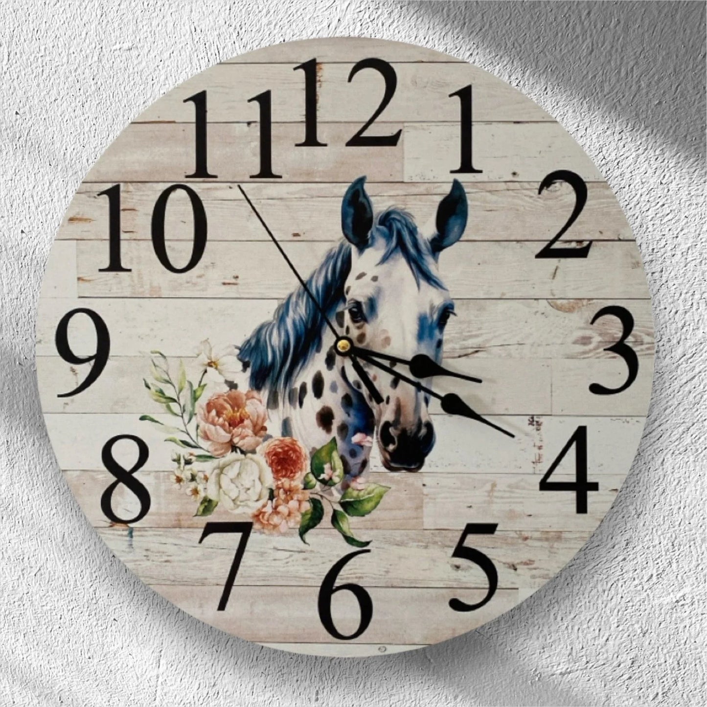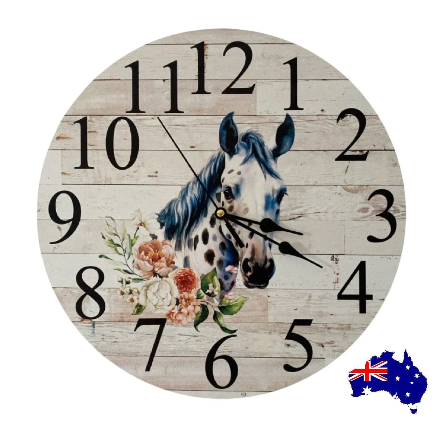 Embrace the rustic charm of our Aussie made Clock Wall Horse Floral Appaloosa, featuring a stunning timber design and a charming floral touch. Get that perfect country farmhouse feel in your home today! This Clock is handcrafted and uniquely designed by a passionate Husband and Wife duo in Australia so your supporting an Aussie Family!! With free delivery available across Australia, this Wall Clock is a must-have for any home or business, adding the perfect touch to your decor. Made from MDF wood, quality quartz clock mechanism which uses x 1 AA Battery (No Battery Included)