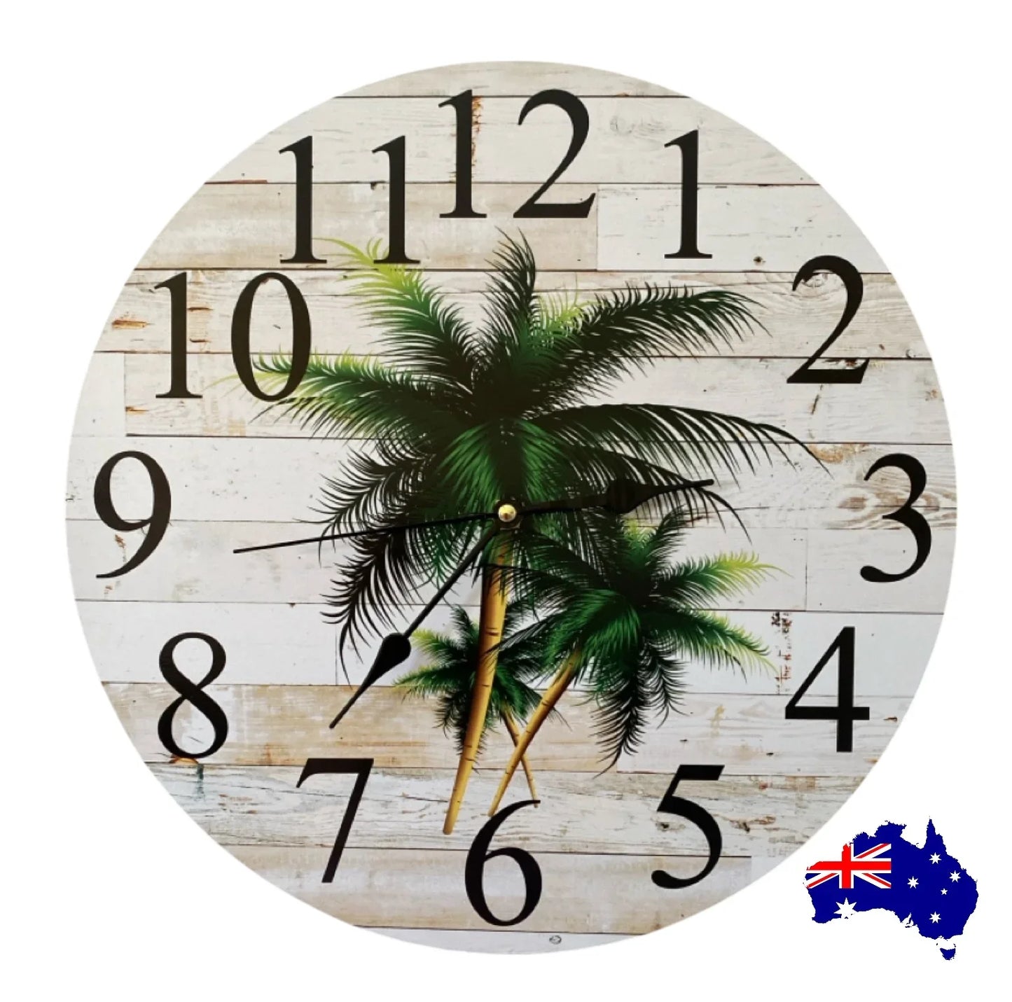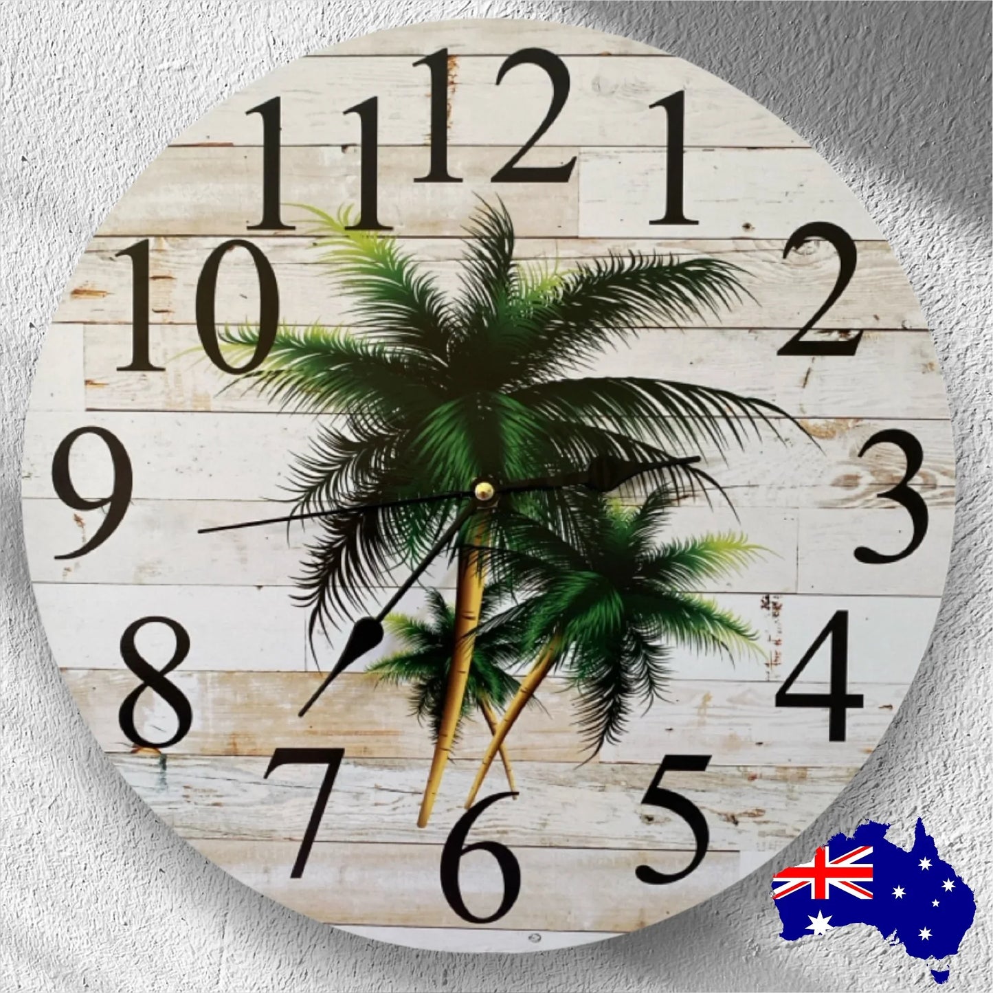 Clock Wall Palm Tree Beach Coastal 30cm 60cm Aussie Made