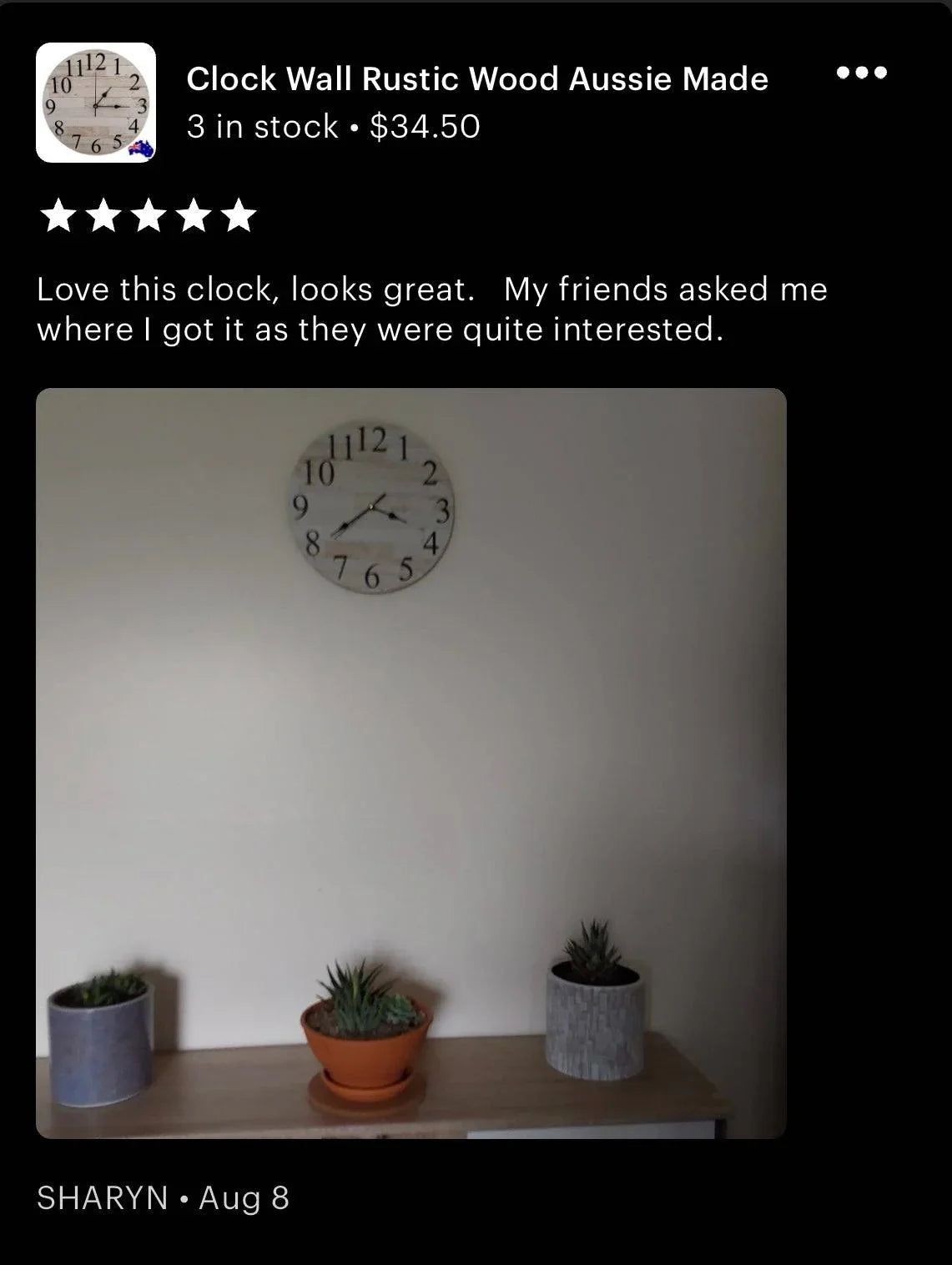 We love our new handmade clock. It fits our loungeroom perfectly. Running like a dream.