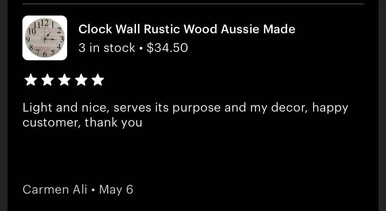 This stunning clock is handcrafted and uniquely designed by a passionate Husband and Wife duo in Australia so you’re supporting an Aussie Family!! With free delivery available across Australia, this Wall Clock is a must-have for any home or business, adding the perfect touch to your decor. Made from MDF wood, quality silent quartz clock mechanism which uses x 1 AA Battery (No Battery Included)