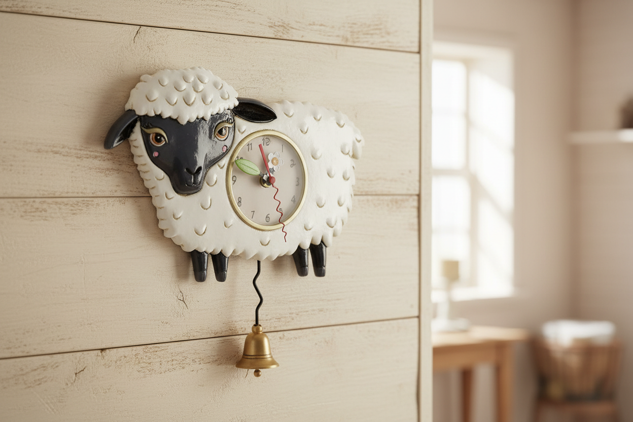 Bring farmhouse charm and whimsical character to your space with this delightfully quirky sheep wall clock. Hand-painted in polyresin with charming retro details, it's a conversation-starter that transforms any room into a cosy, personality-filled retreat. Whether you're decorating a country kitchen, bedroom, or looking for a memorable gift, this statement piece delivers instant warmth and nostalgic appeal. Operates on a standard AA battery (not included). Measures approximately 34cm wide by 27cm tall—the perfect size to command attention without overwhelming your wall.