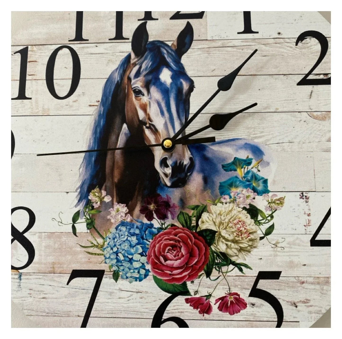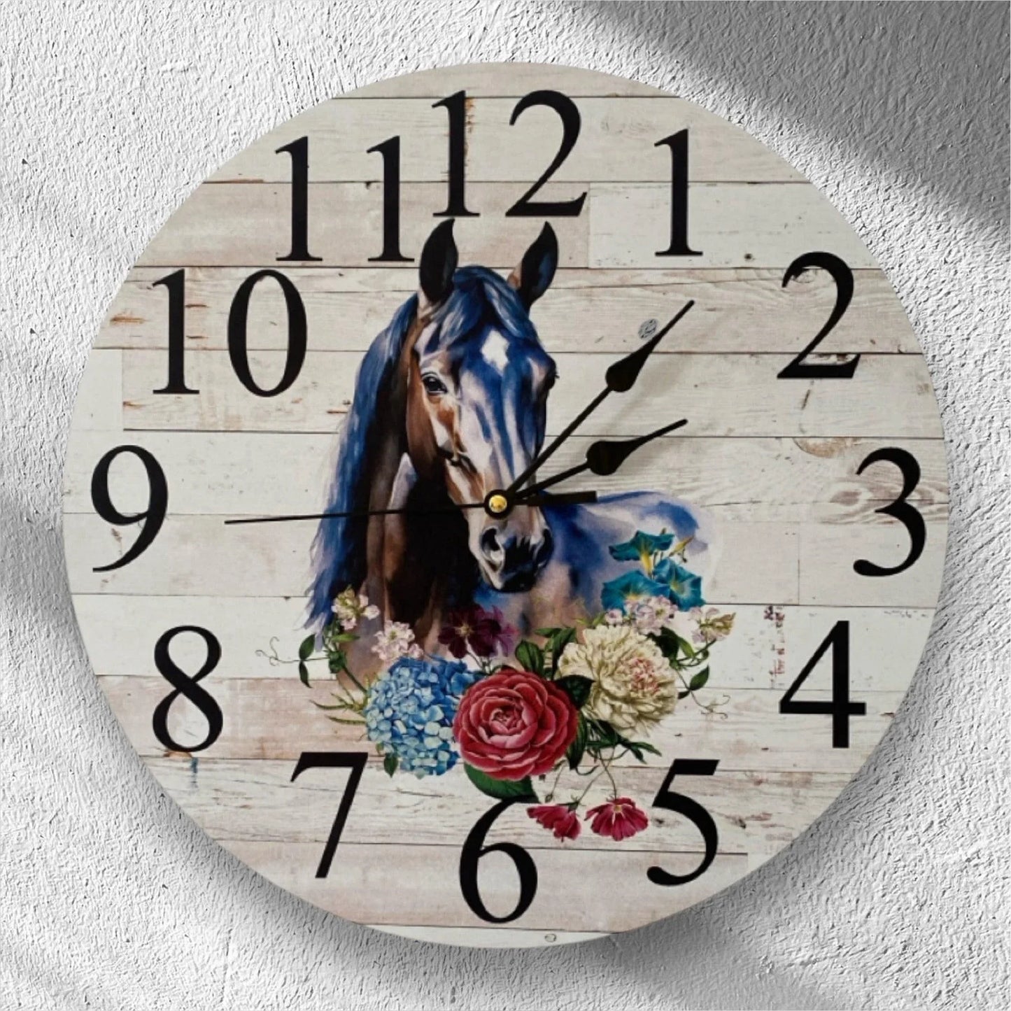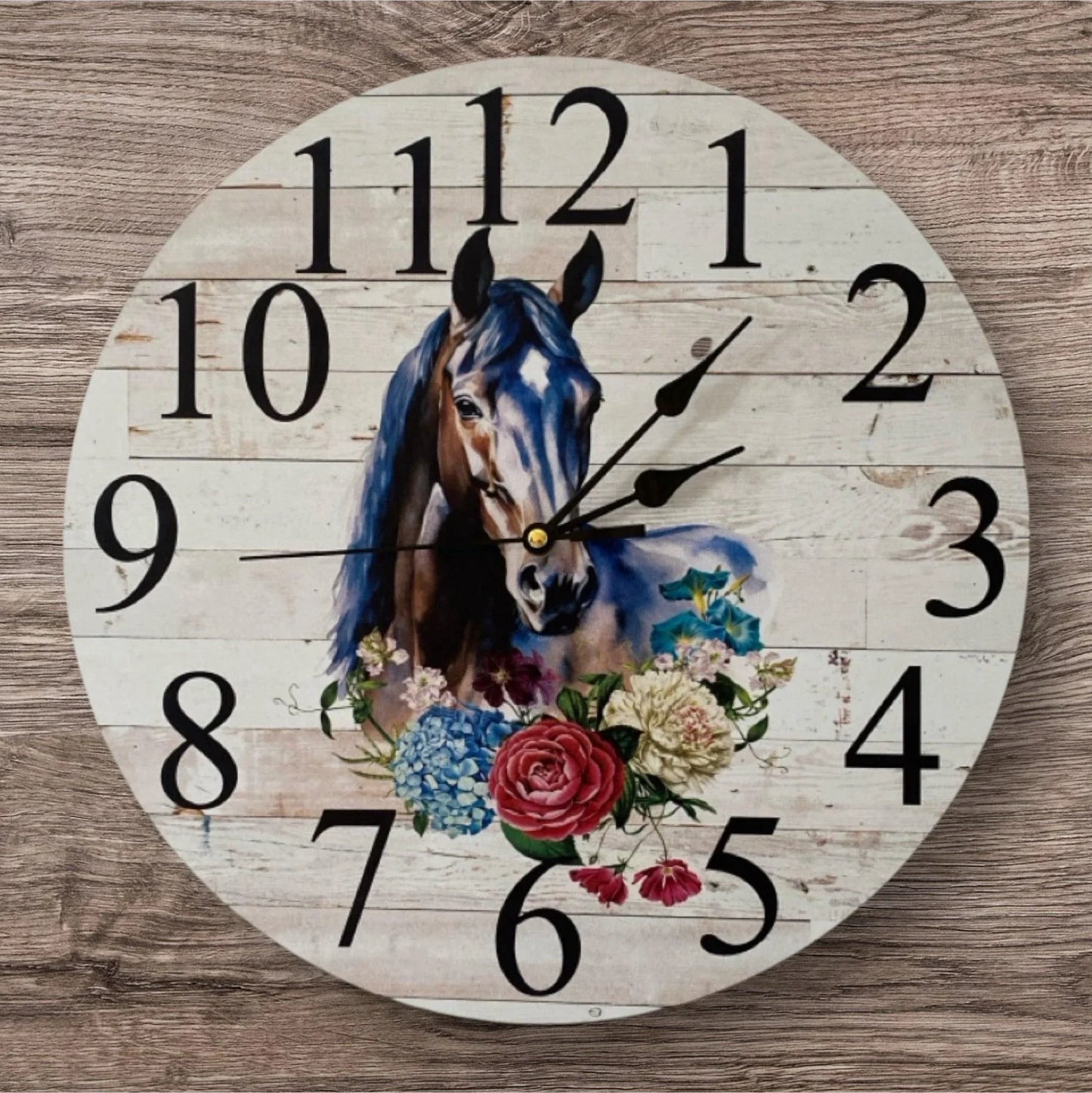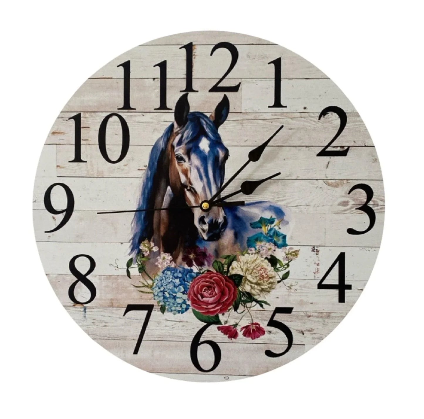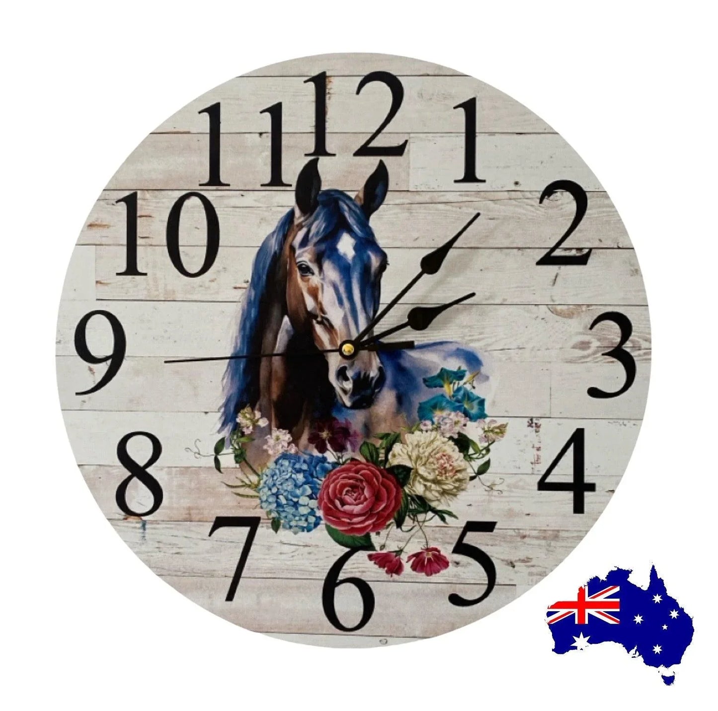 Embrace the rustic charm of our Aussie made Clock Wall Thoroughbred Horse Floral, featuring a stunning timber design and a charming floral touch. Get that perfect country farmhouse feel in your home today! This Clock is handcrafted and uniquely designed by a passionate Husband and Wife duo in Australia so your supporting an Aussie Family!! With free delivery available across Australia, this Wall Clock is a must-have for any home or business, adding the perfect touch to your decor. Made from MDF wood, quality quartz clock mechanism which uses x 1 AA Battery (No Battery Included)