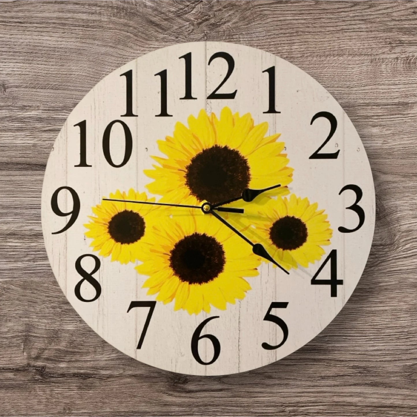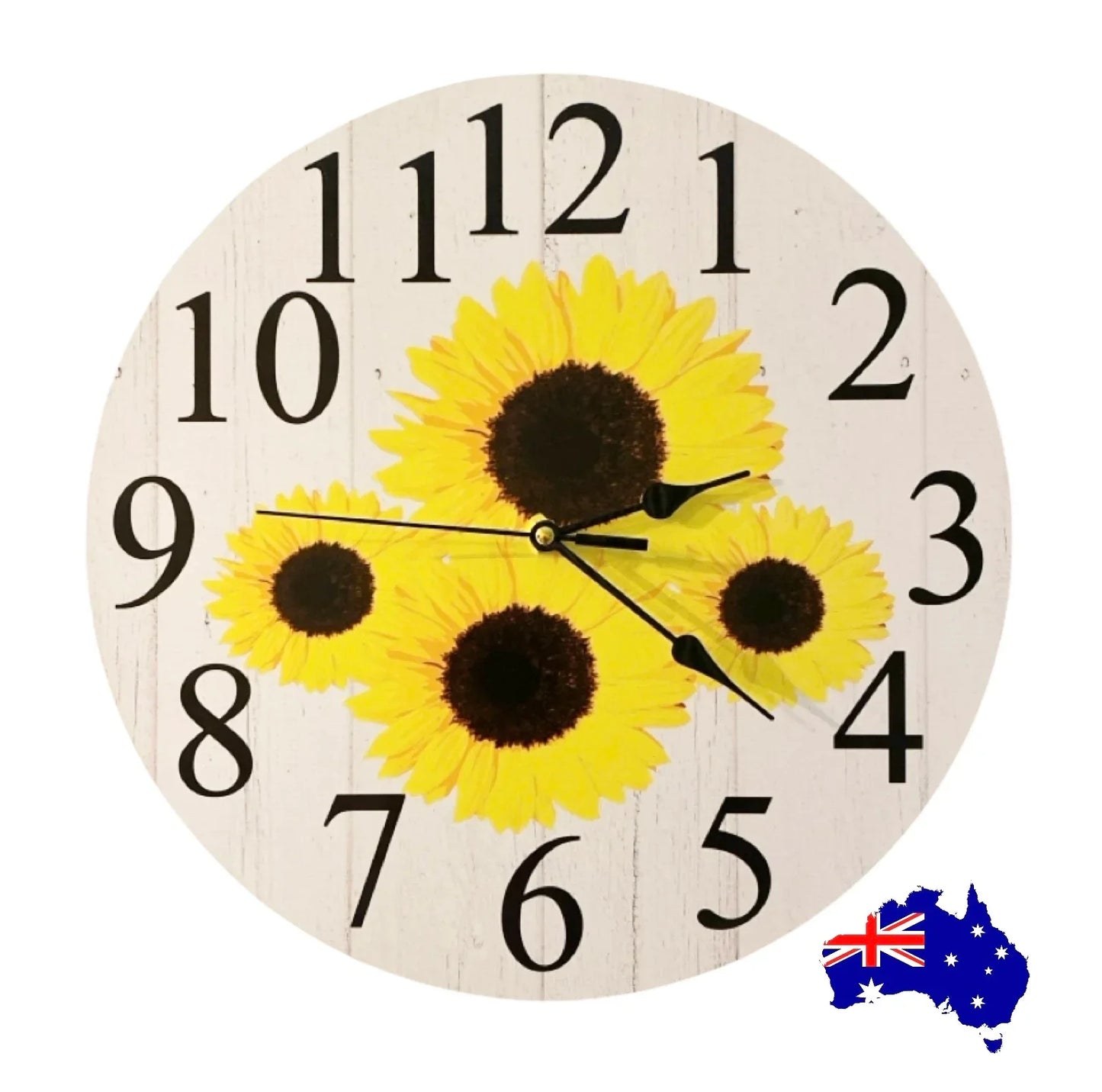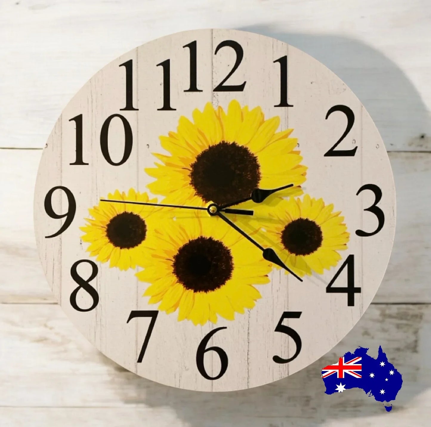 Embrace the rustic charm of our Aussie made Clock Wall Wooden Sunflower, featuring a stunning sunflower floral design. Get that perfect country farmhouse feel in your home today! This Clock is handcrafted and uniquely designed by a passionate Husband and Wife duo in Australia so your supporting an Aussie Family!! With free delivery available across Australia, this Wall Clock is a must-have for any home or business, adding the perfect touch to your decor. Made from MDF wood, quality quartz clock mechanism which uses x 1 AA Battery (No Battery Included)