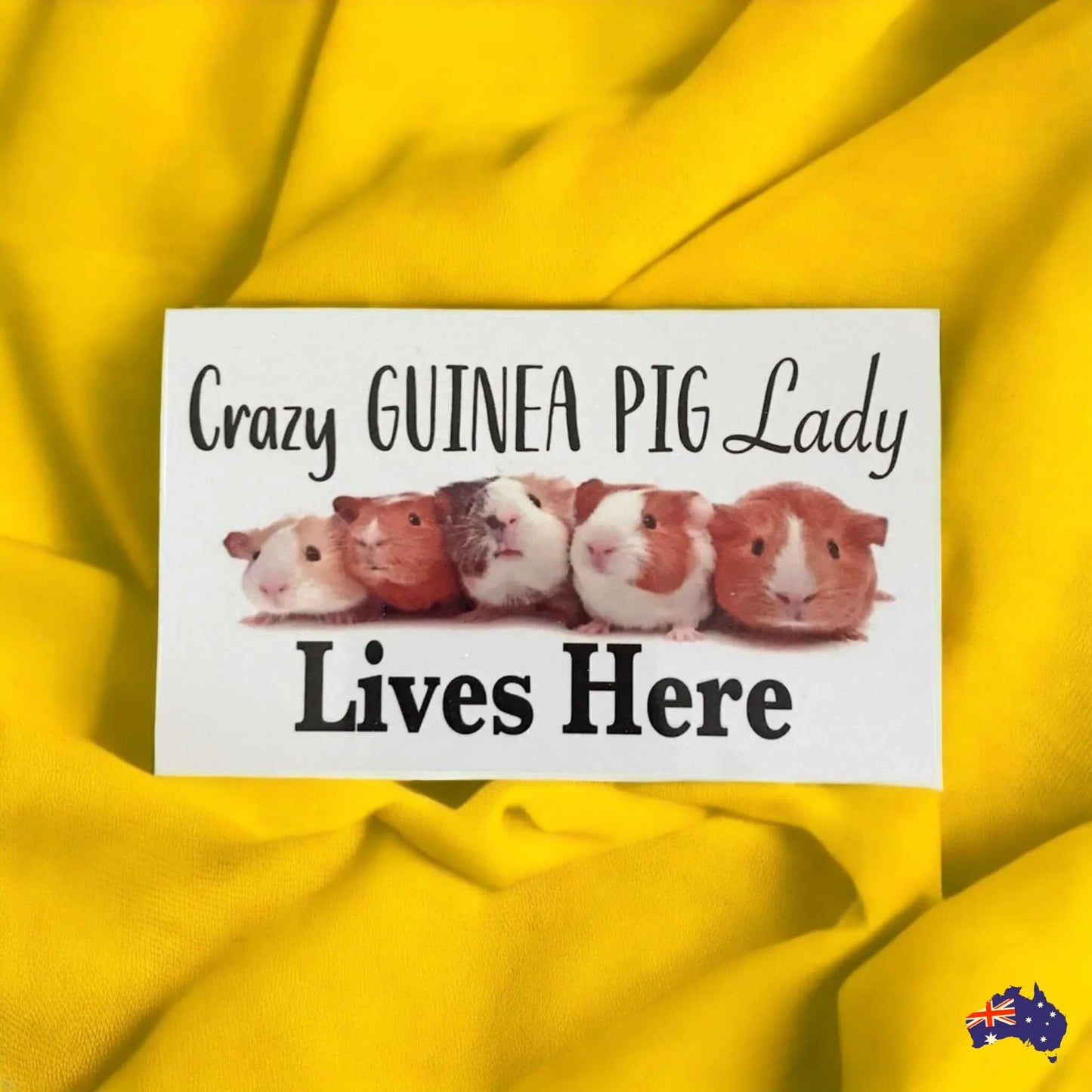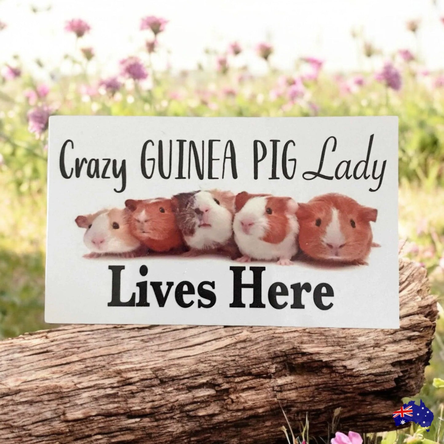 A Crazy Guinea Pig Lady Lives Here Sign Let your love for guinea pigs shine with this beautiful, Aussie Made sign! It's the perfect way to show off your dedication and create a welcoming atmosphere for all your fellow guinea pig lovers. Proudly display your passion and let everyone know that a crazy guinea pig lady lives here!