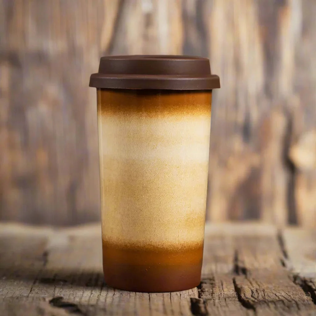 Experience the perfect on-the-go beverage with our Cup Mug Travel Earth with Silicone Lid. Each stoneware coffee cup is uniquely crafted by hand, making it one-of-a-kind with variations in size, earthy natural colour tones color, and markings. You will receive a cup similar to the mug pictured, but no two are alike. Add a touch of color to your home collection by removing the lid. With a 100% silicone lid, this cup holds up to 350ml of your favorite drink. Approximate size is 8.5cm wide x 14.2cm tall. Enjoy your favorite tea, coffee, cacao, or any other beverage in style and eco-friendly convenience.
