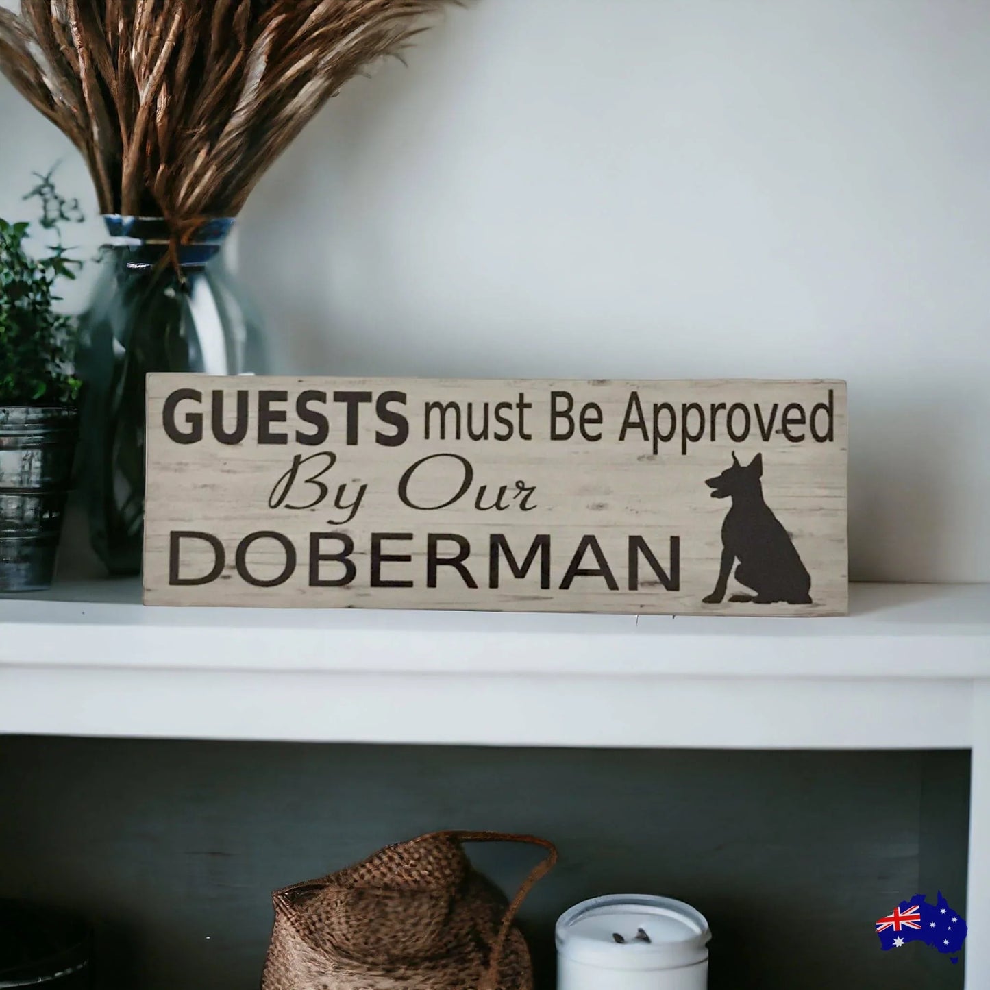 This sign adds humor and charm to your home while reminding guests that the Doberman takes his role as gatekeeper seriously! Approval must be granted before entering. Ha!