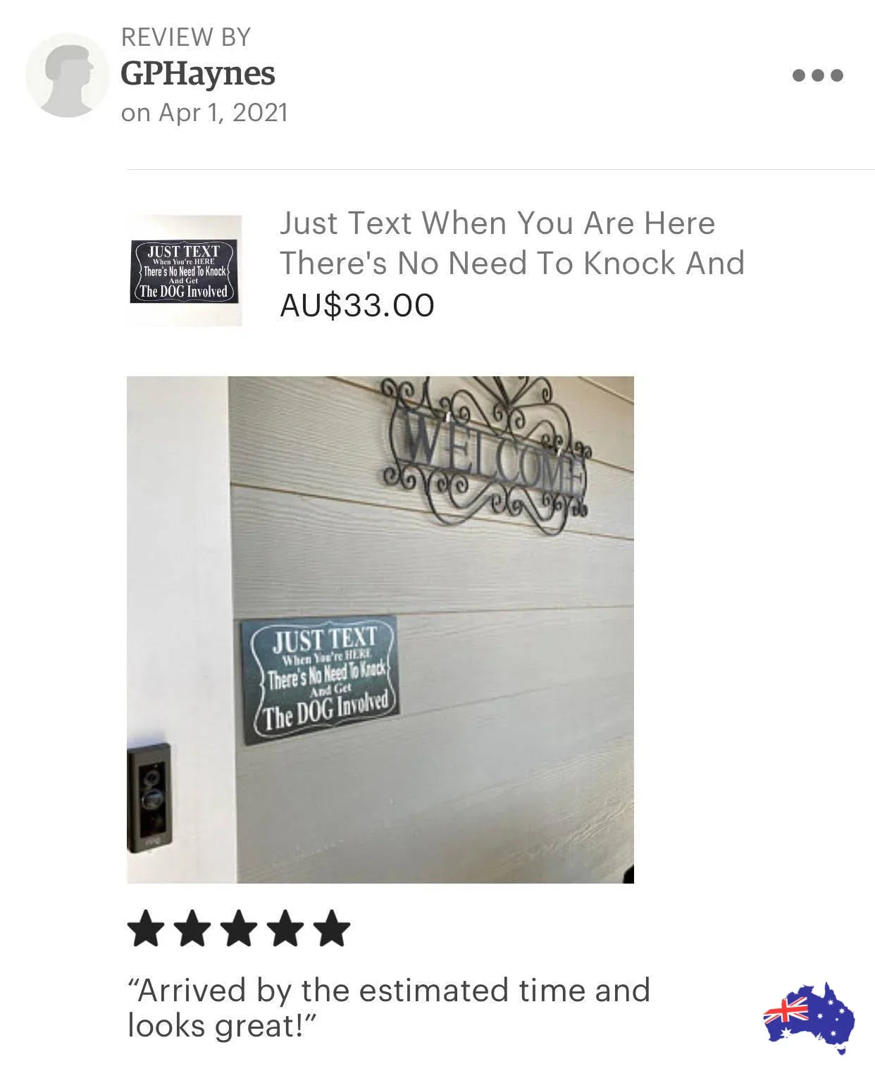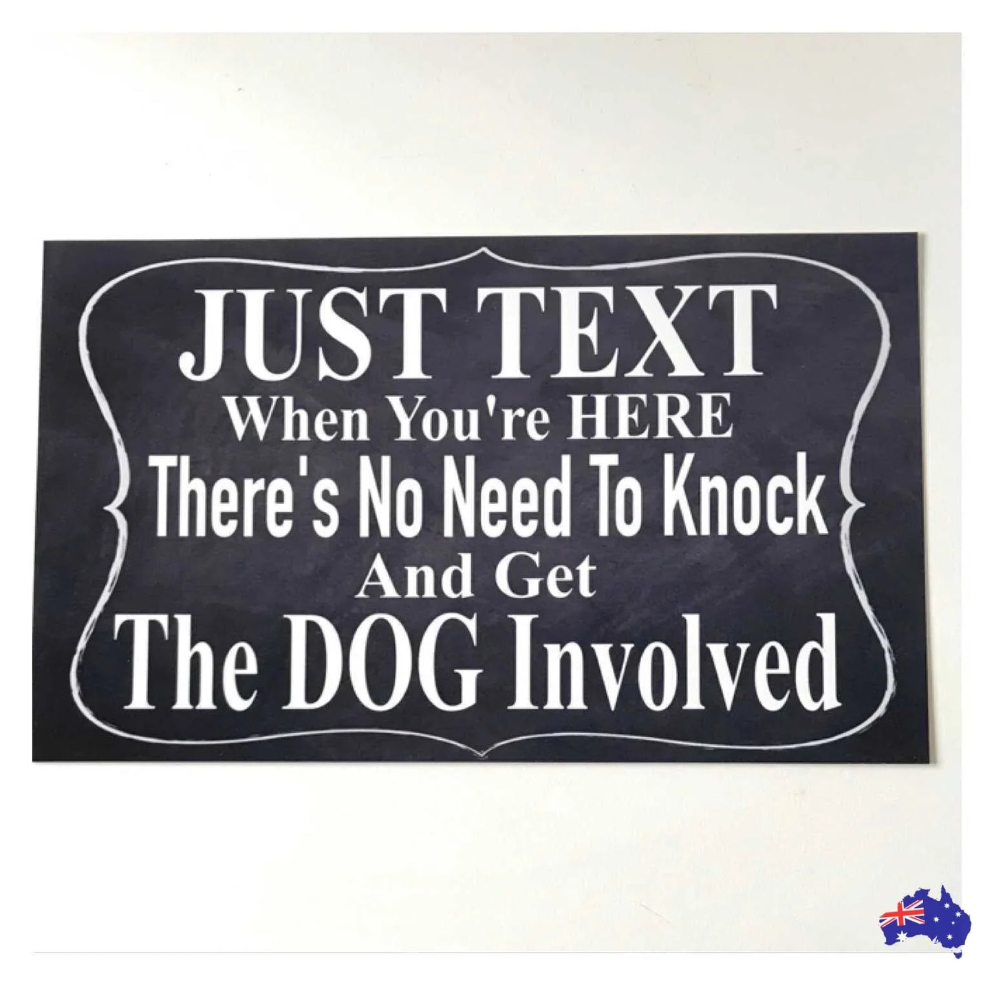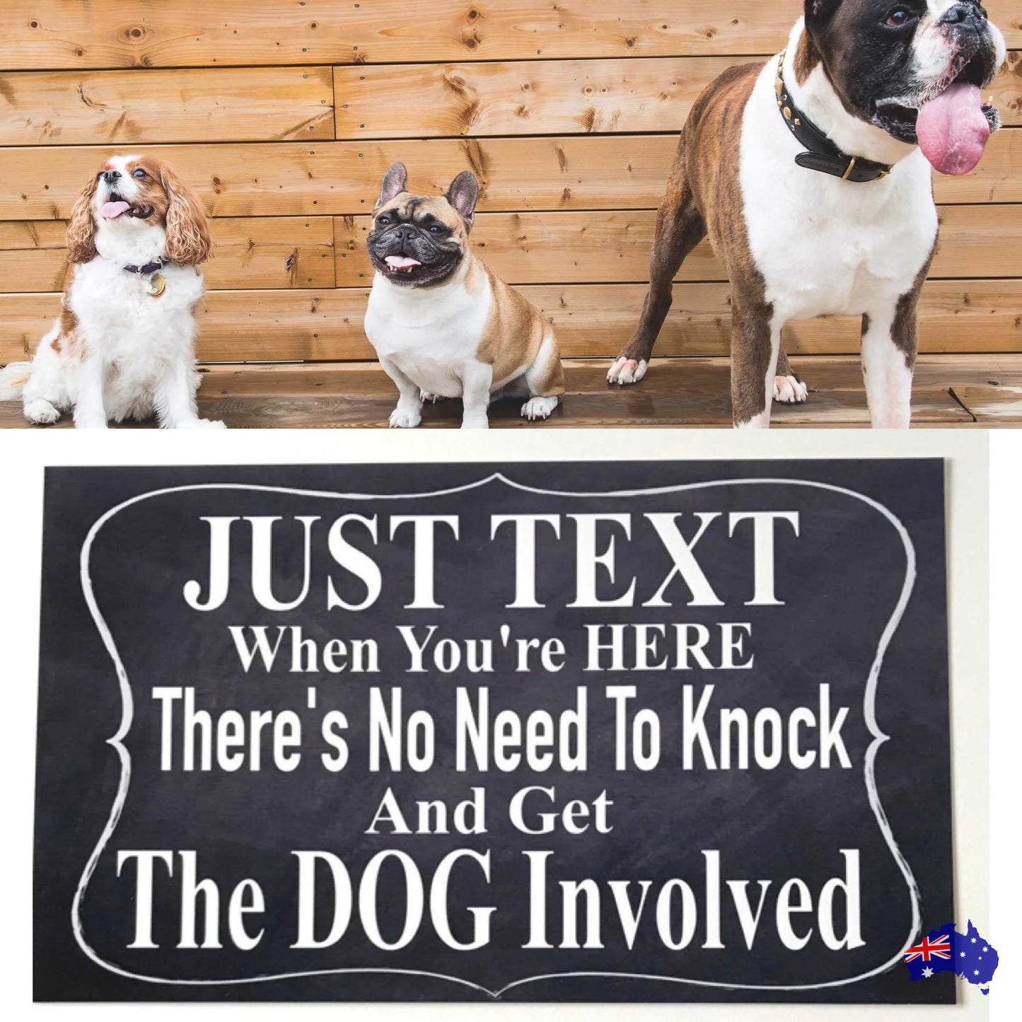 Get the Dog Just Text When You’re Here Dogs Sign for your front door! No need to knock, simply text when you arrive and your dog will stay out of the way. Your guests will appreciate knowing they don't have to worry about your furry friend.