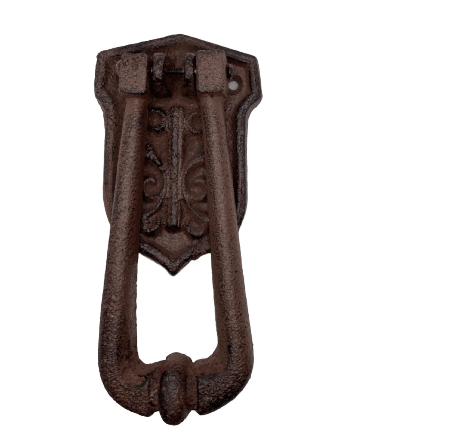 This lovely door knocker has a rustic vintage antique feel the perfect for any front door. Approximate Size is 30cm x 8cm x 18cm Made from heavy Cast Iron Please note no screws are included