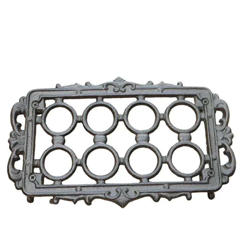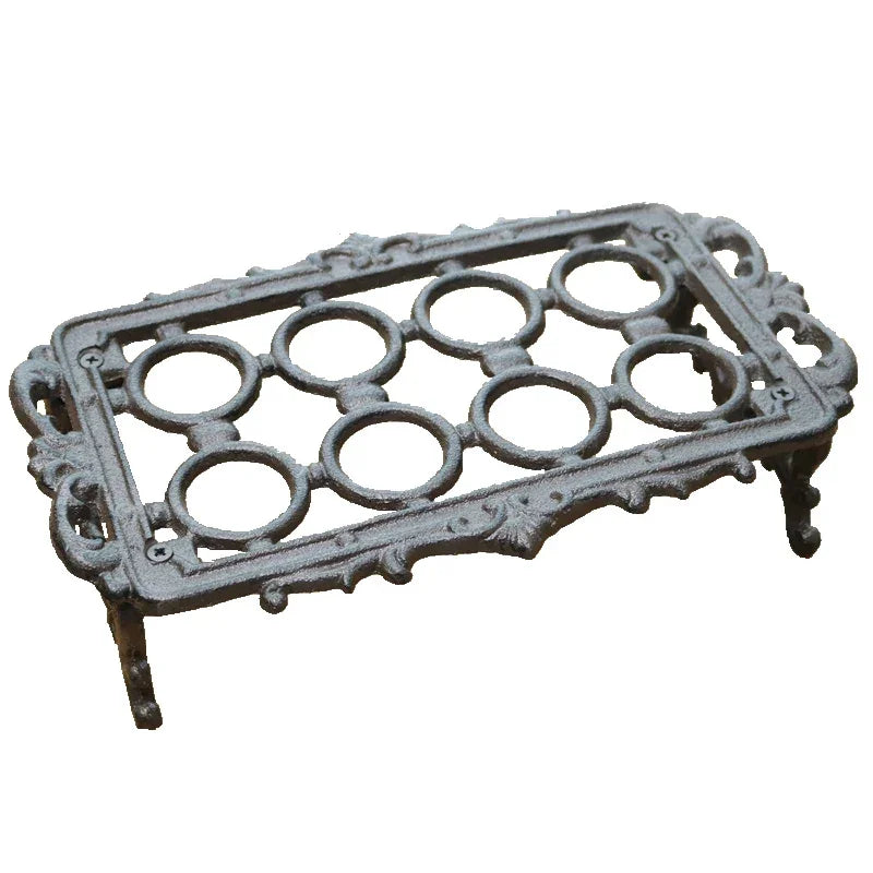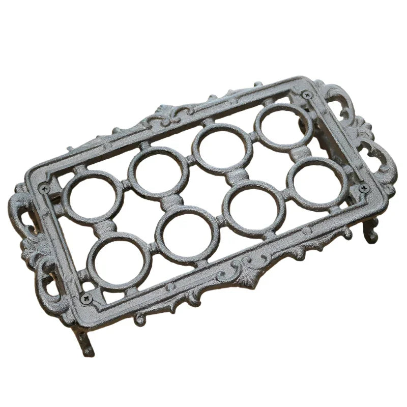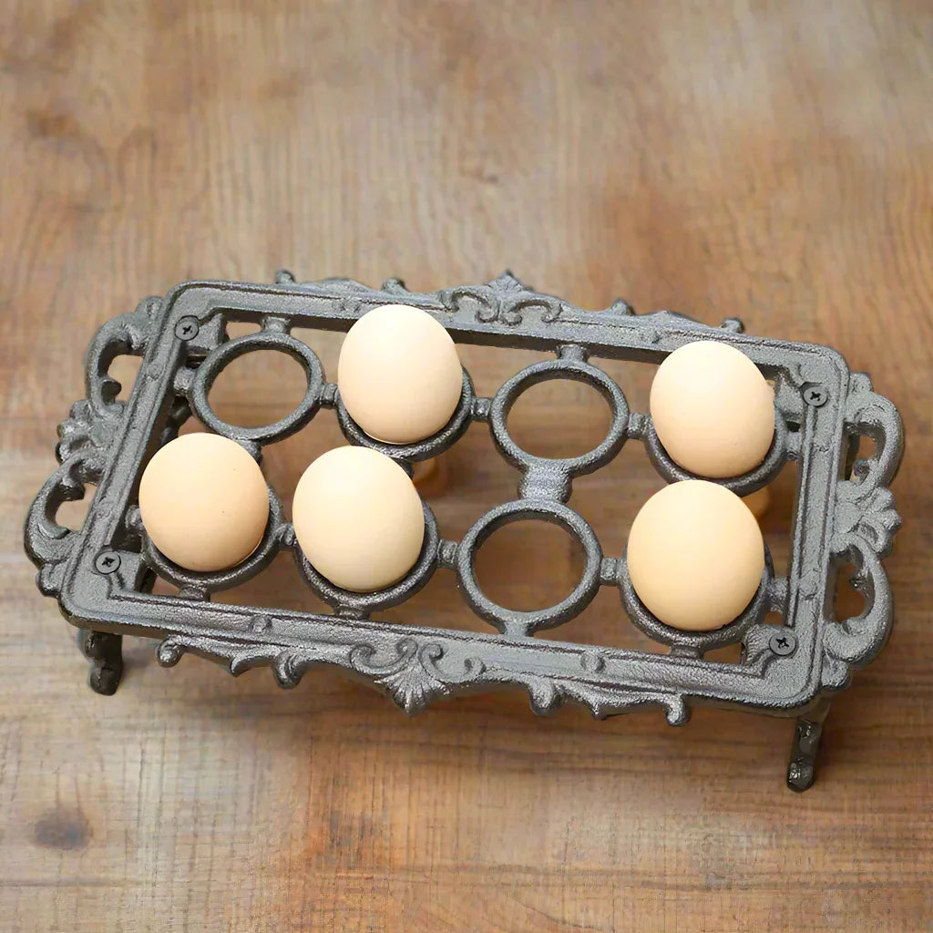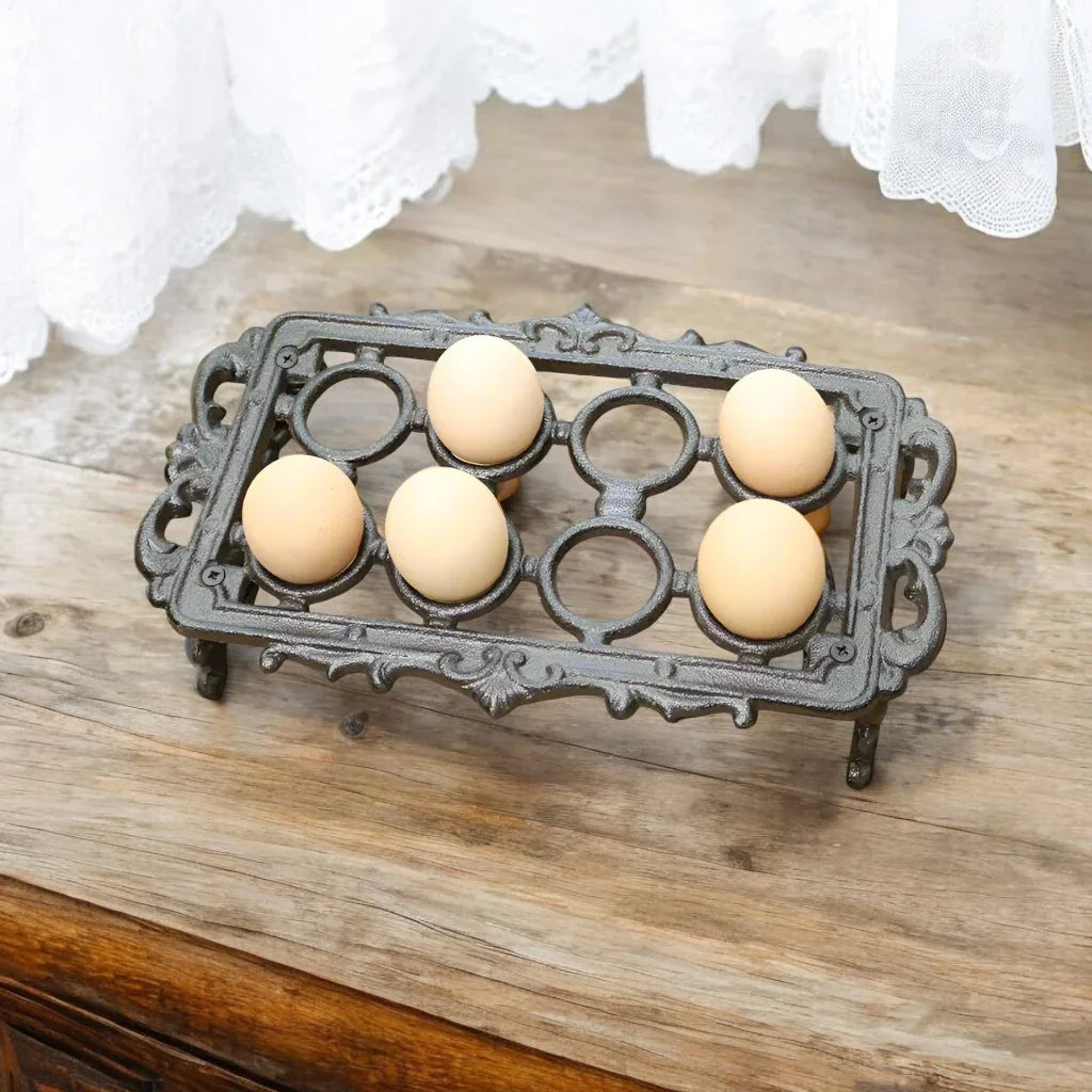 Experience the French Provincial Country antique charm of this sturdy heavy cast iron egg holder in your home! This super charming rack holds 8 eggs. The perfect gift for any chicken enthusiast. Bring a touch of country charm and practicality into your home.