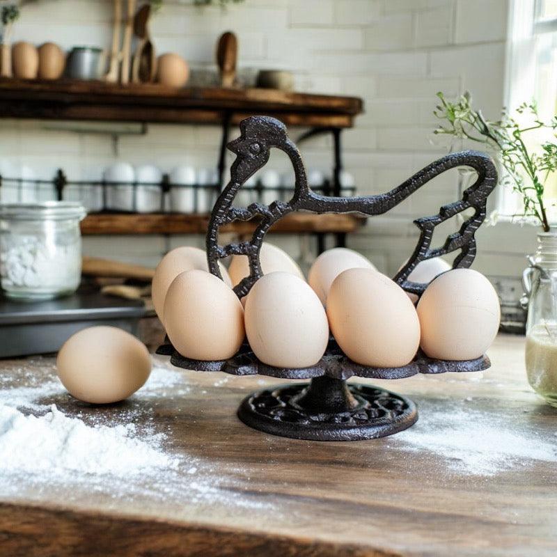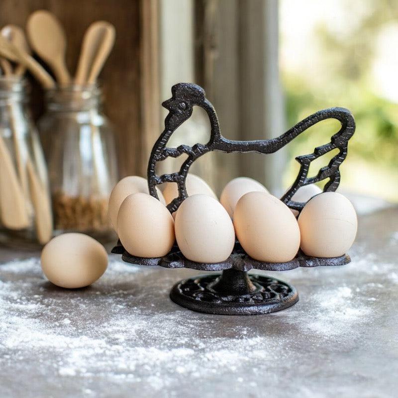 Experience the rustic charm of this sturdy cast iron egg holder in your home! This super charming hen that holds 8 eggs. The perfect gift for any chicken enthusiast. Elevate your kitchen decor with these charming cast iron egg holders! Crafted with heavy cast iron, these egg holders are the ideal gift for any chicken lover. Bring a touch of country charm and practicality into your home with these versatile and durable egg holders.