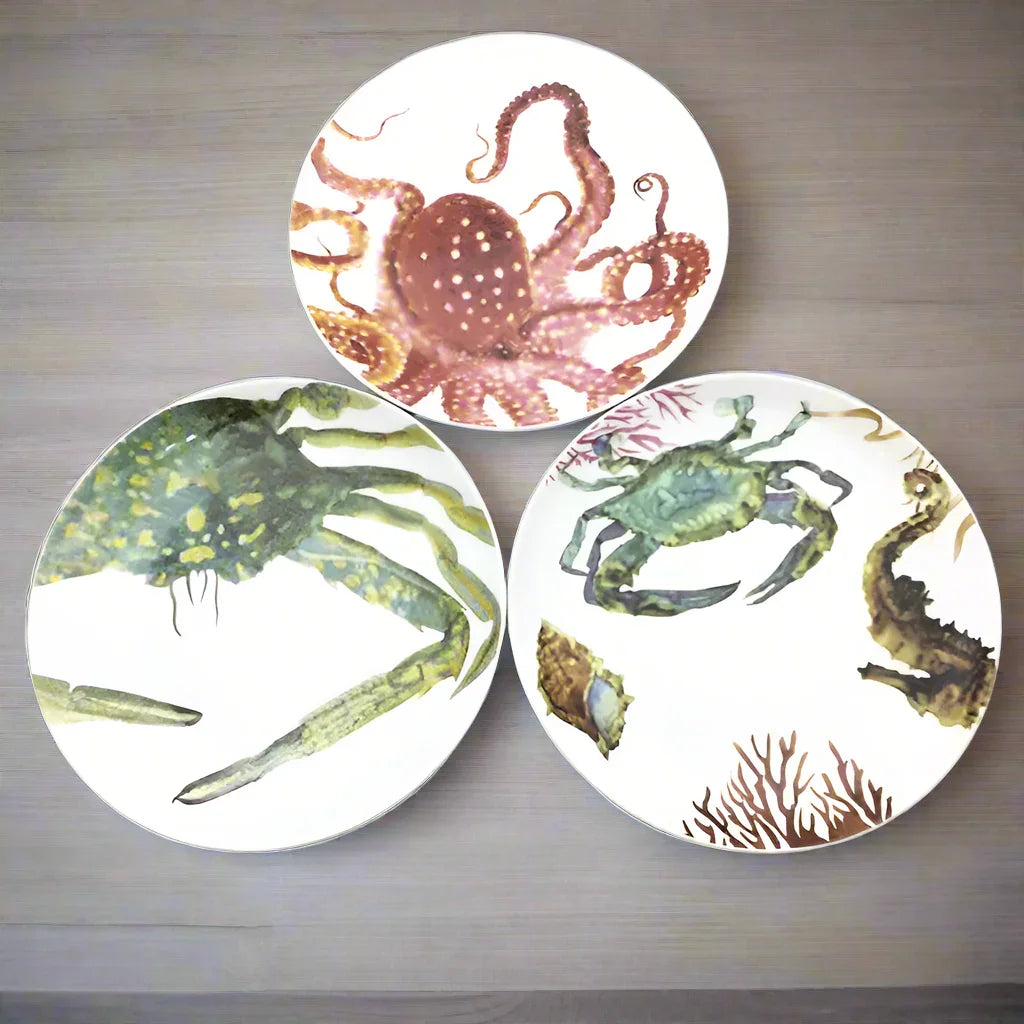 Add a touch of ocean-inspired charm to your home with these stunning hand painted ceramic plates. From wonderful fish seahorse to crab and octopus, this diverse collection is sure to elevate your next seafood coastal beach house table decorations. Approximate Size is 20cm