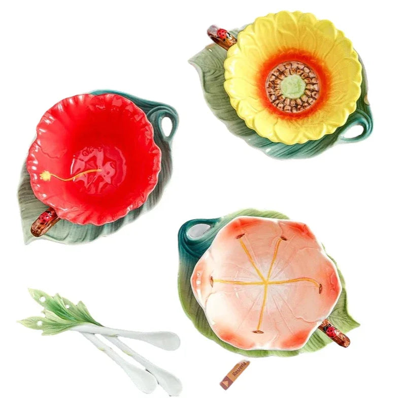 Bring joy to your daily tea or coffee ritual with these stunning Flower Cup Leaf Saucer Spoon sets. Featuring colorful floral patterns, leaf-shaped saucers, and ceramic leaf spoons, these sets make a beautiful addition to your collection or a thoughtful gift for a loved one. Choose from a variety of vibrant colors or collect them all!