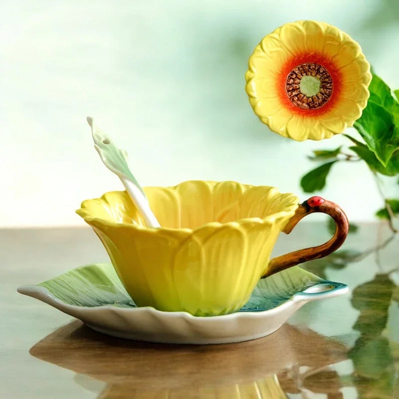 Experience the joy of sipping your favorite hot tea or coffee beverage from this charming Flower Cup Leaf Saucer Spoon Yellow set. With its vibrant floral design, leaf-shaped saucer, and ceramic leaf spoon, it's the perfect addition to your collection or as a thoughtful gift for a loved one.