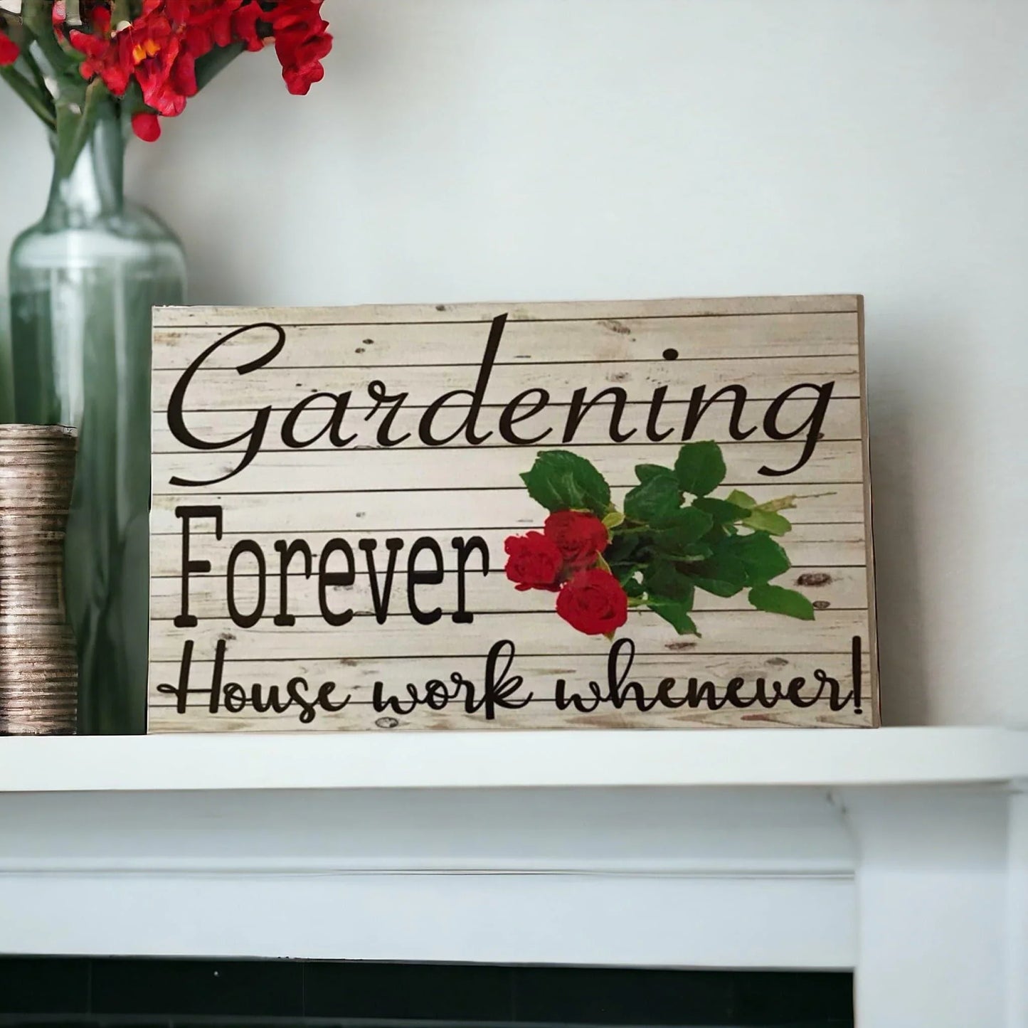 "Experience the joy of gardening with the Gardening Forever House Work Whenever Sign! This powerful sign will inspire you to keep up with your gardening tasks, whenever you have a spare moment. Add it to your home and embrace the beauty and satisfaction of a well-tended garden!"