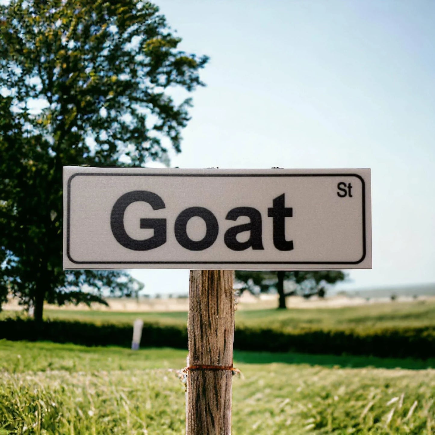 Introducing the Goat Street Sign - a must-have addition for any animal lover's home! This charming sign adds a touch of personality to your property and showcases your love for these playful creatures. Order yours now and bring the joy of goats to your neighborhood!