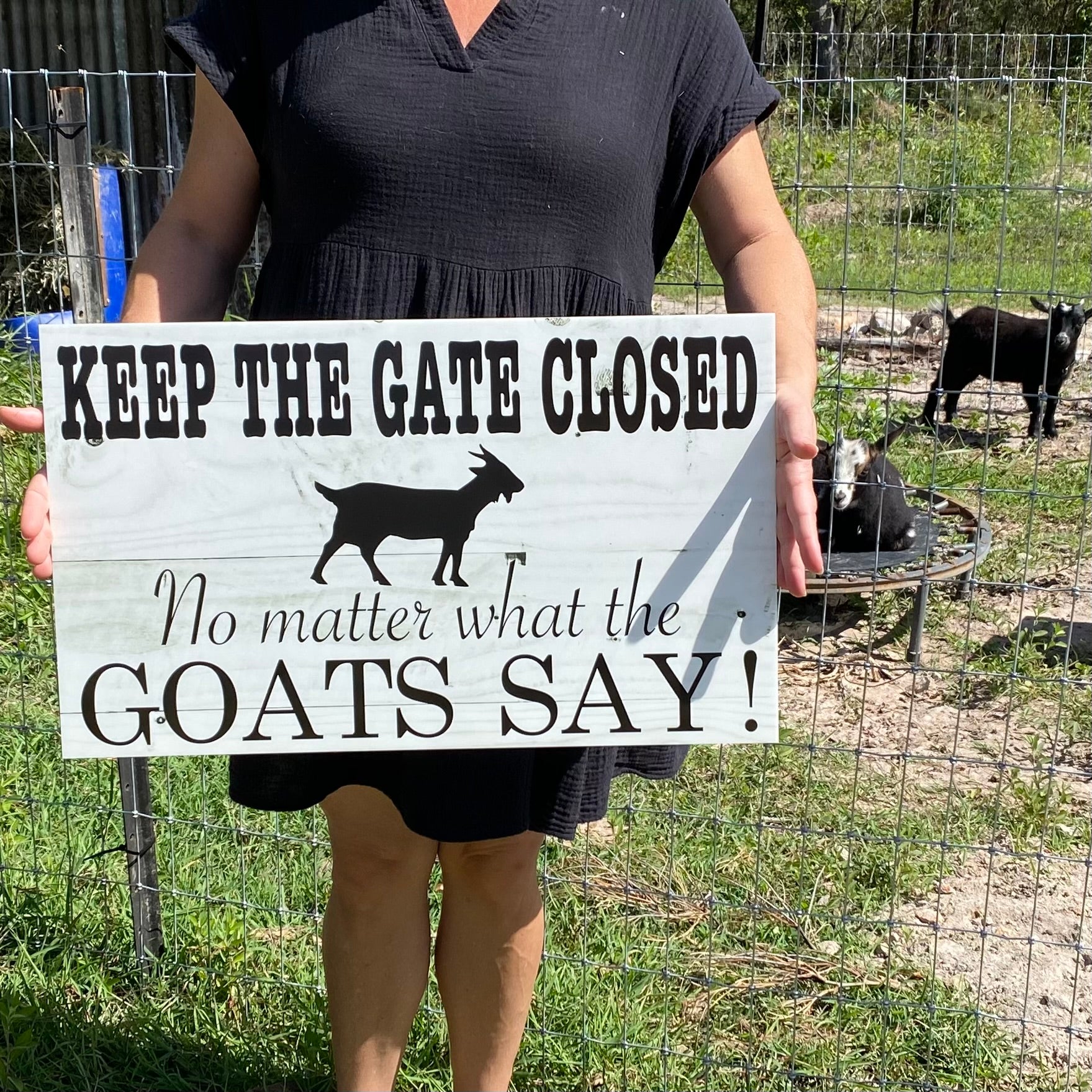 This sign is a must-have for all goat enthusiasts! Keep your gates closed no matter what the goats say with this humorous and delightful addition. Display it proudly and watch as it adds charm and functionality to your space.