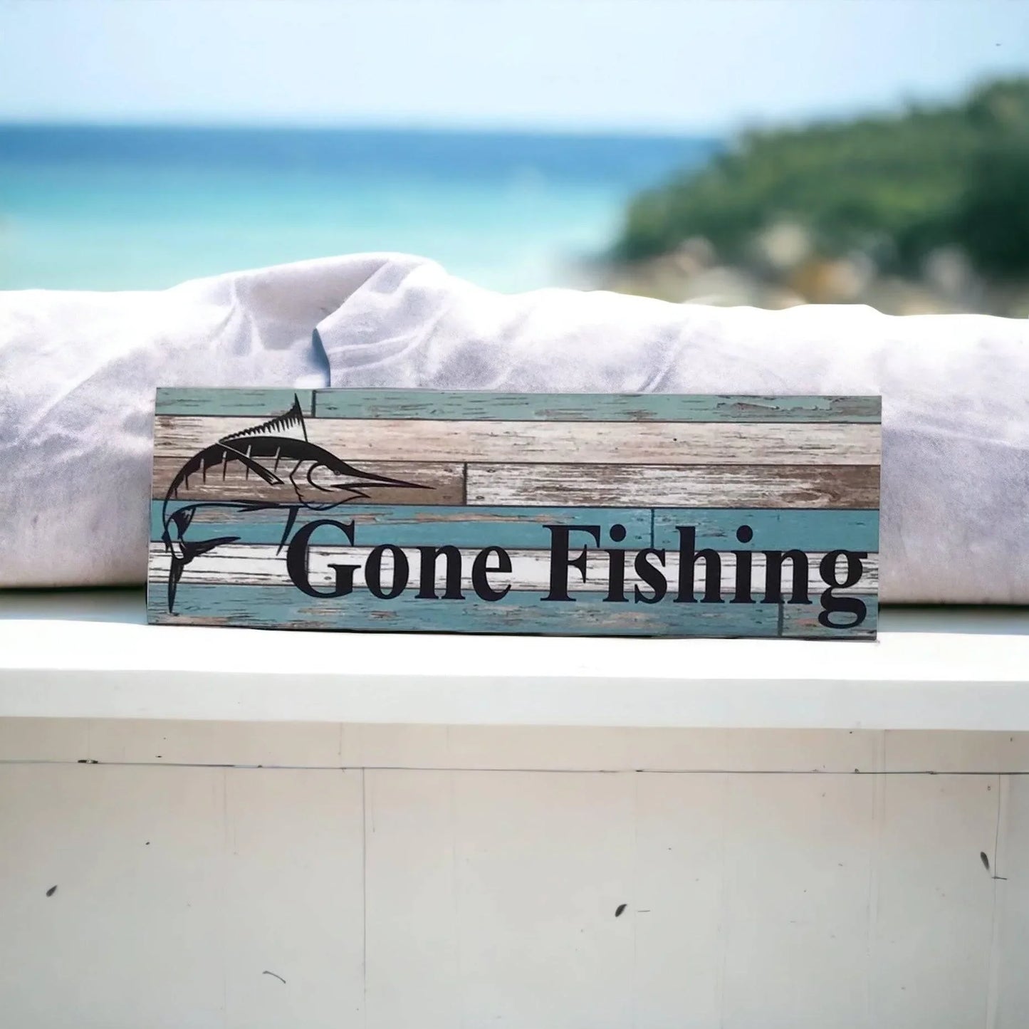 Gone Fishing with Marlin Fish Blue Sign