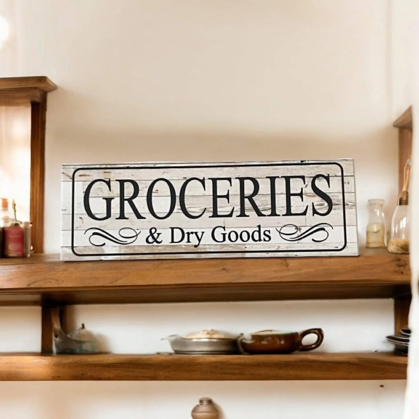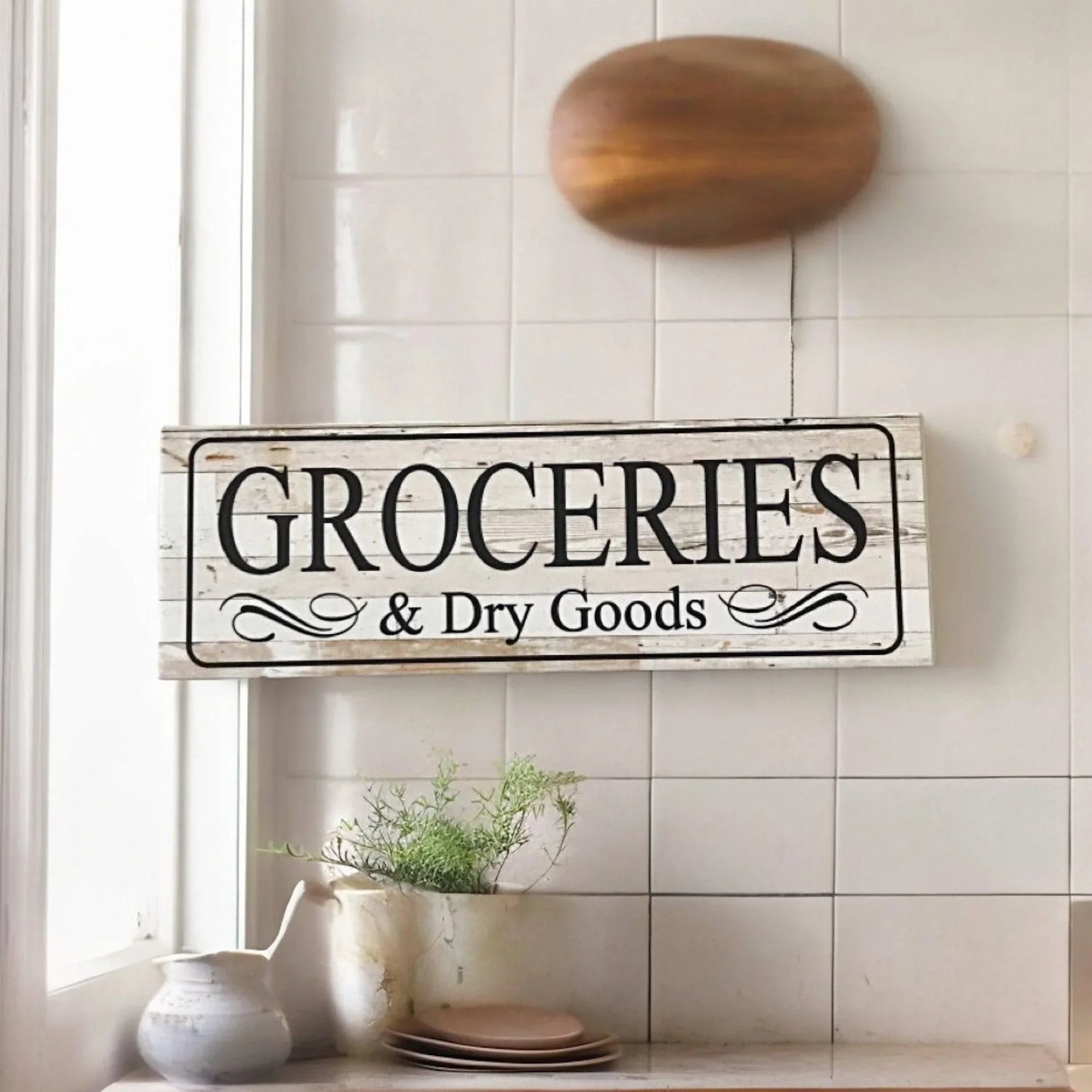 Transform your kitchen with our stunning Grocery Store Pantry Vintage Style Sign! Let the nostalgic design remind you of simpler times while adding a touch of vintage charm to your home decor. This sign is the perfect addition to any kitchen, pantry, or dining room.