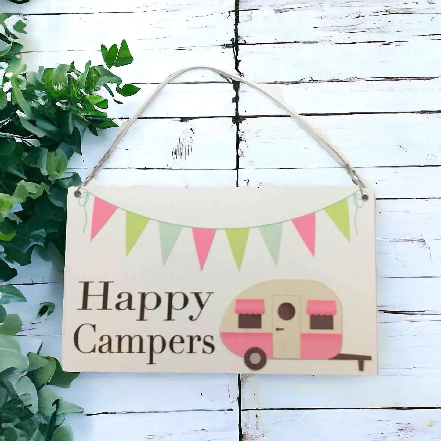 Happy Campers Sign Embrace the great outdoors and show off your love for camping with the Happy Campers Sign. Crafted from Acrylic, this sign will be reminder to travel. With its cute style and bold lettering, it's the perfect addition to any outdoor enthusiast's home.