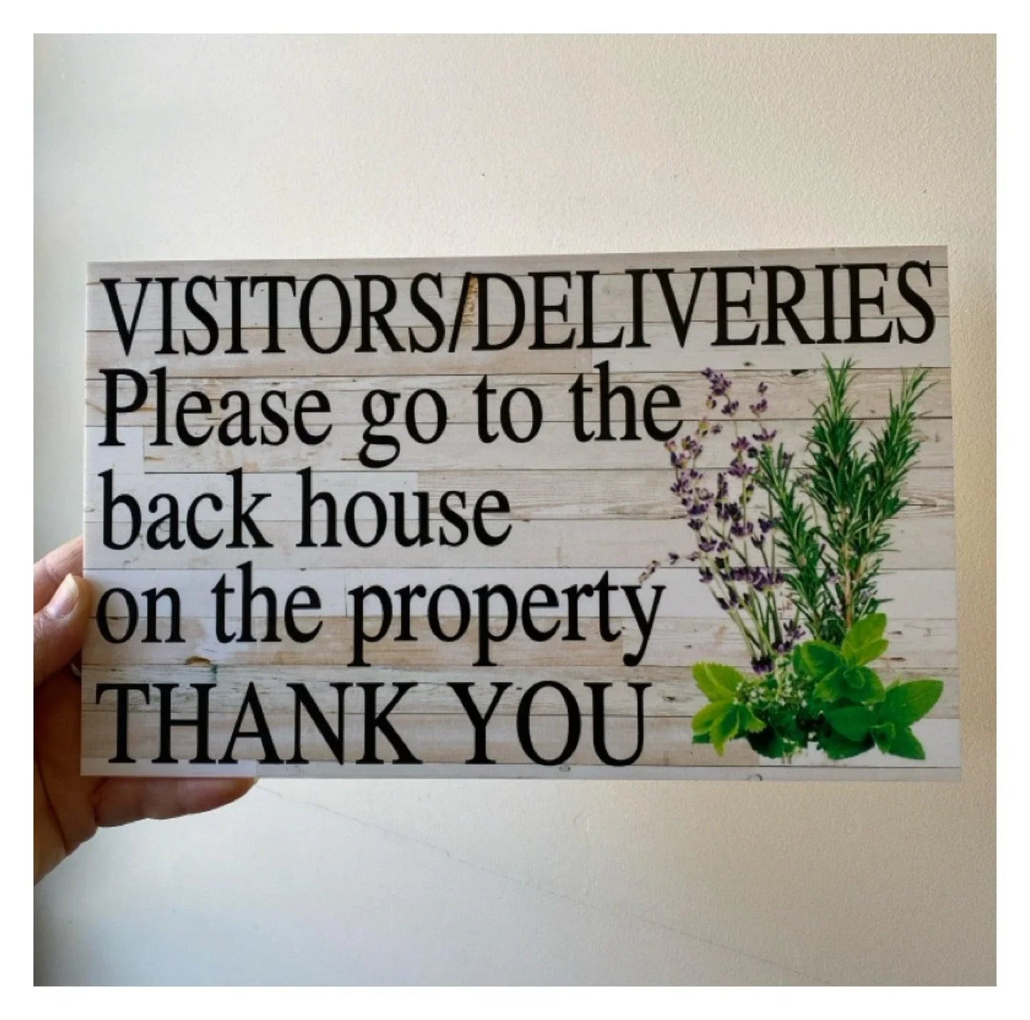 Photos are ideas of how you could use the sign. Attach using heavy duty double sided tape, glue to a stake or fence! We don’t recommend drilling our signs but do offer the hanging option so your sign is ready to go. If you require holes in a certain spot please make a note when you order.