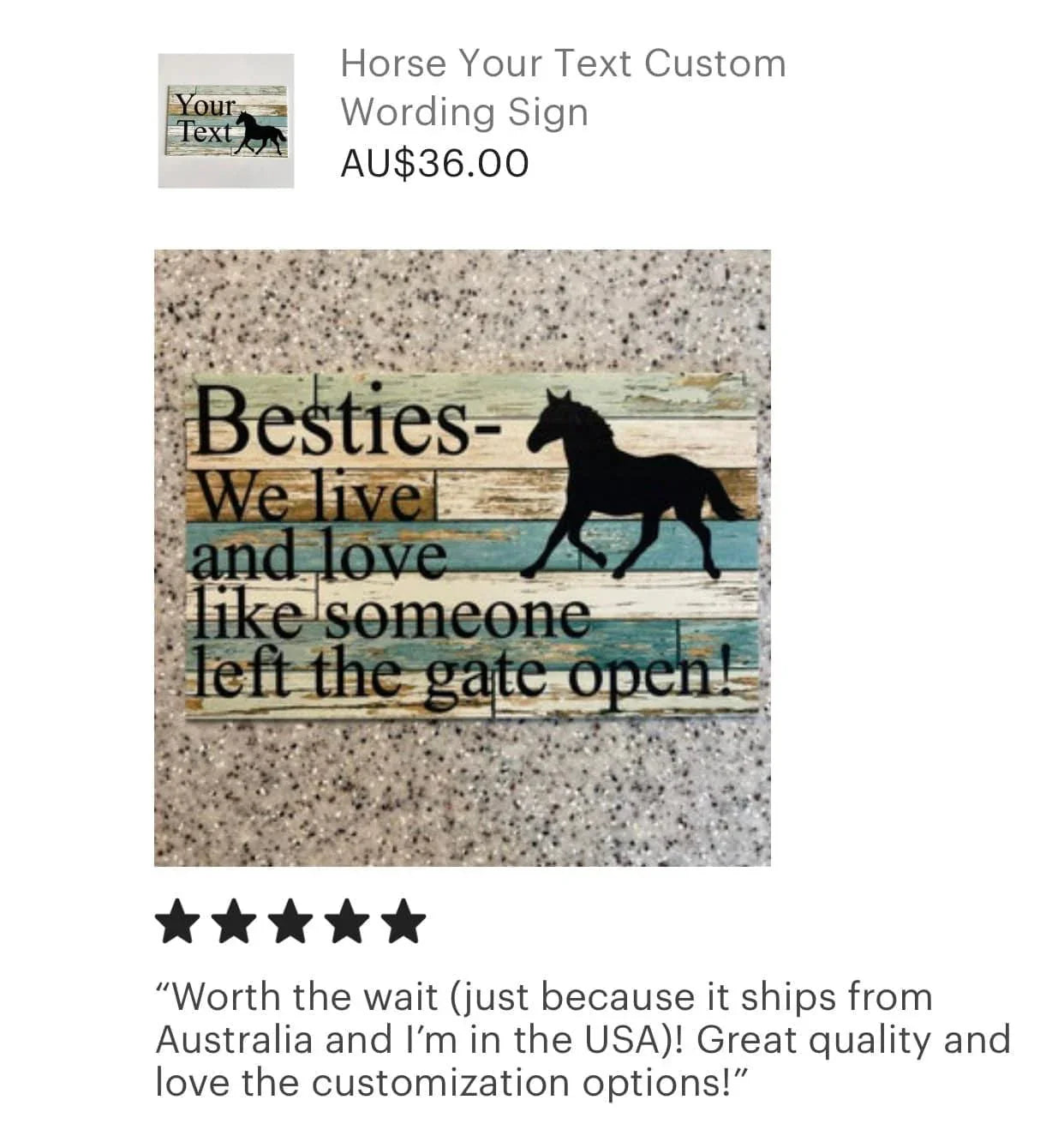 Exceptional customer service, quality and attention to detail, love the last sign we ordered, we will continue to order thanks so much for your wonderful products! Xx