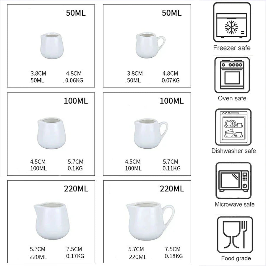 Jug Classic White Ceramic transform your daily living into a luxurious experience with these wonderful classic white jugs available in different sizes suitable for Modern Style, Hamptons Style Coastal Beach to Cottage Farmhouse Country Style kitchens. Made using ceramic material, you can enjoy serving 50ml, 100ml or 220ml of your milk favorite sauce or beverage with style. Indulge in the white design and elevate your serving collection with these exquisite pieces.