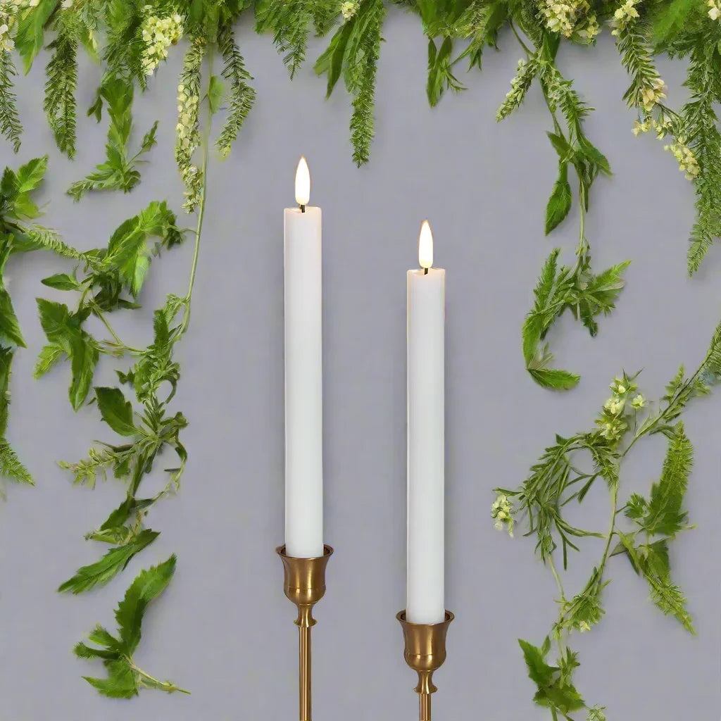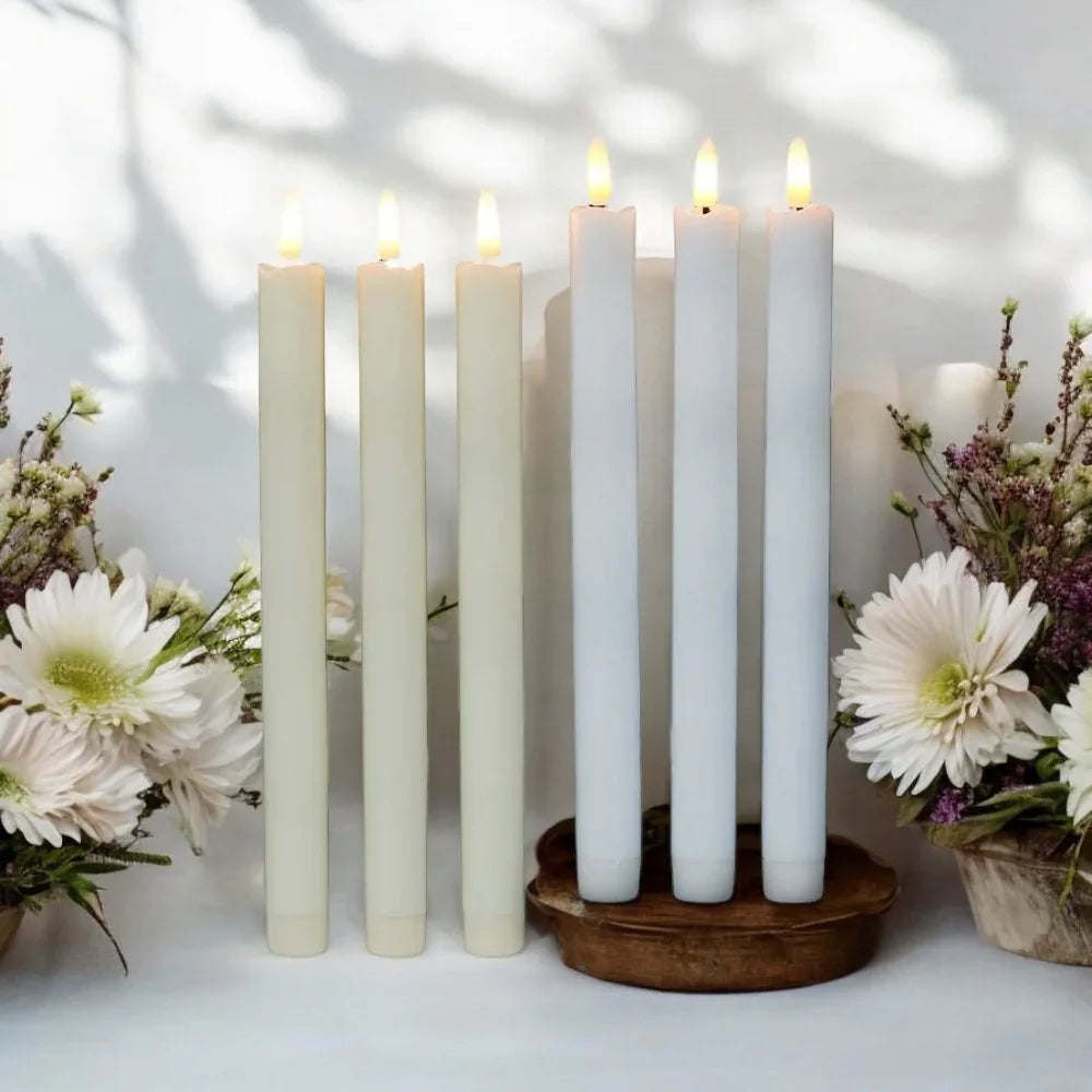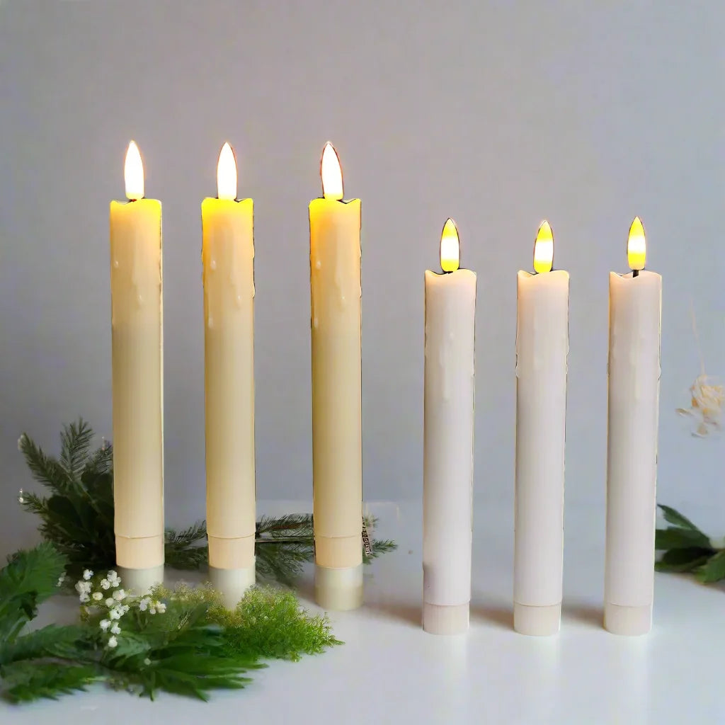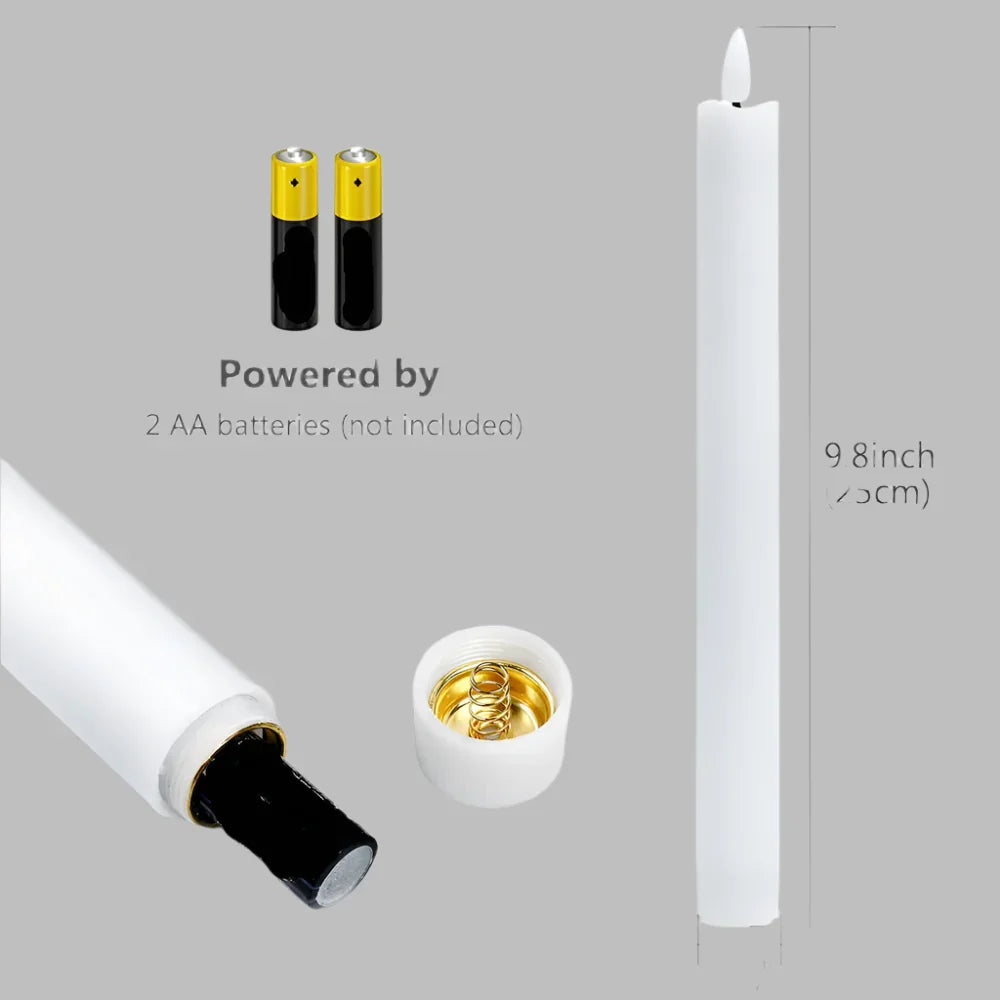 Spread warmth and beauty with this set of 2, 4 or 6 LED Flameless Taper Candle Lights. Each candle is approximately 25cm in size and requires only 2 AA batteries (not included). Bring the romantic ambiance of candlelit dinners, baths, and gatherings into any room or outdoor space without the risk of a live flame. Made from durable plastic, these candles provide the realistic look of traditional candles without the worry of melted wax or fire hazards. Transform any space into a cozy and safe haven with these stunning LED taper candles. Choose from 2, 4, 6 Candles with style and colour options for that perfect candle,