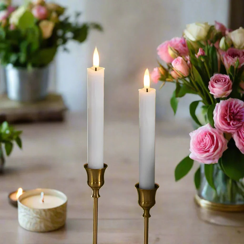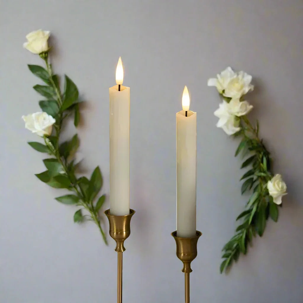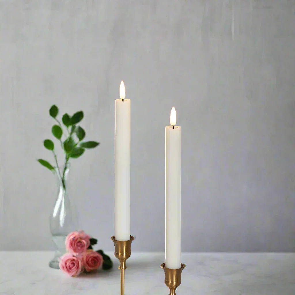 Spread warmth and beauty with this set of 2, 4 or 6 LED Flameless Taper Candle Lights. Each candle is approximately 25cm in size and requires only 2 AA batteries (not included). Bring the romantic ambiance of candlelit dinners, baths, and gatherings into any room or outdoor space without the risk of a live flame. Made from durable plastic, these candles provide the realistic look of traditional candles without the worry of melted wax or fire hazards. Transform any space into a cozy and safe haven with these stunning LED taper candles. Choose from 2, 4, 6 Candles with style and colour options for that perfect candle,