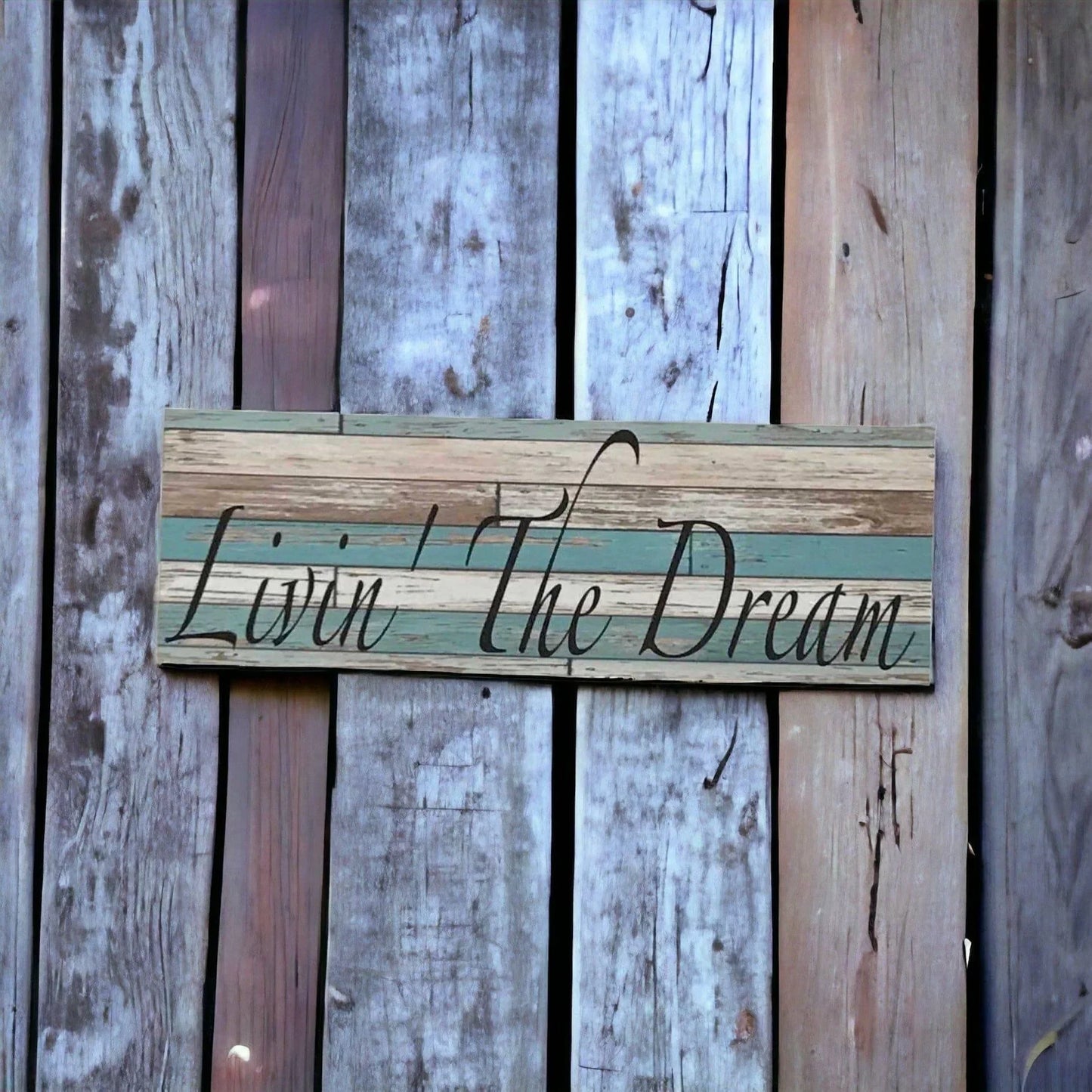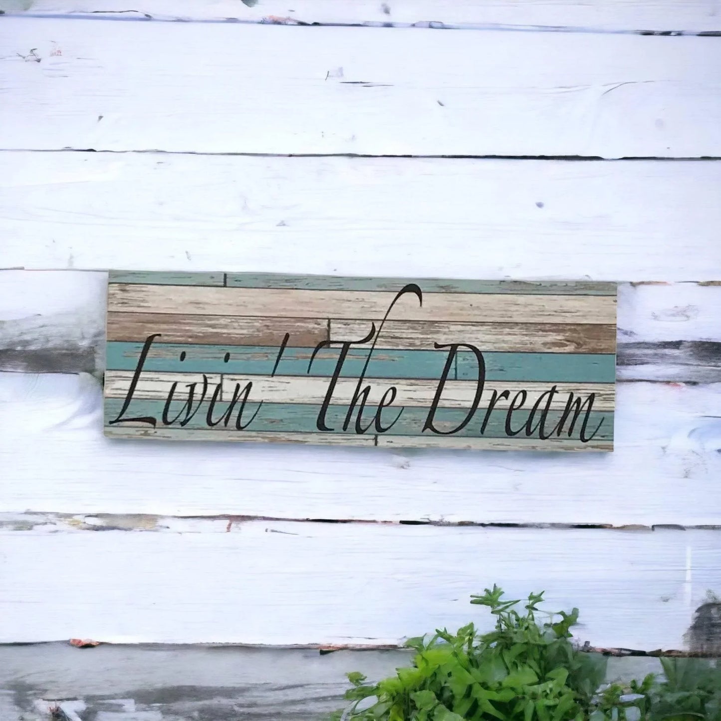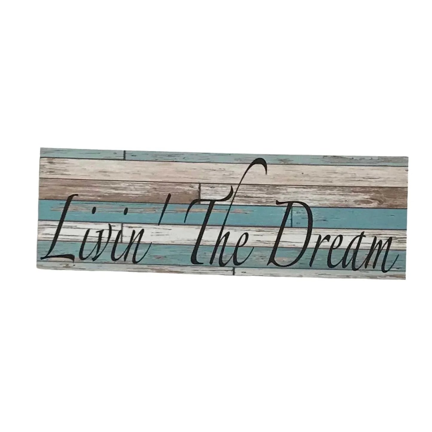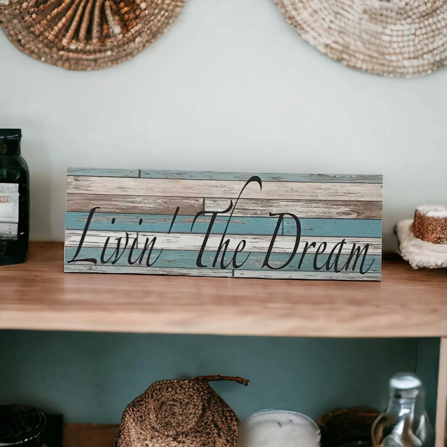 Embrace relaxation with this charming blue rustic timber style sign that celebrates living the dream. Perfect for adding a cozy, inspiring touch to any space indoors our outdoors.
