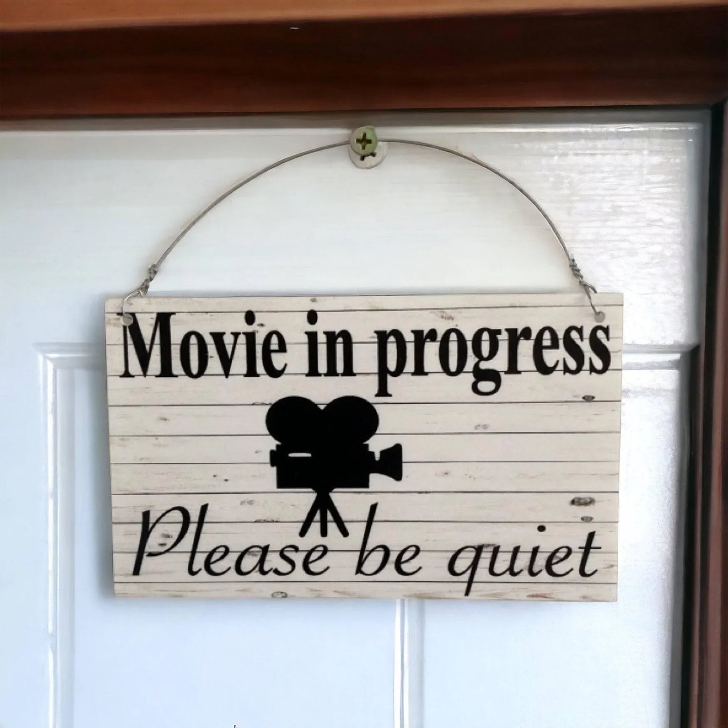 Experience the magic of movie-making with our Vintage "Movie In Progress" sign. Perfect for any film lover, this sign reminds you to keep the hallway quiet during your home screenings.