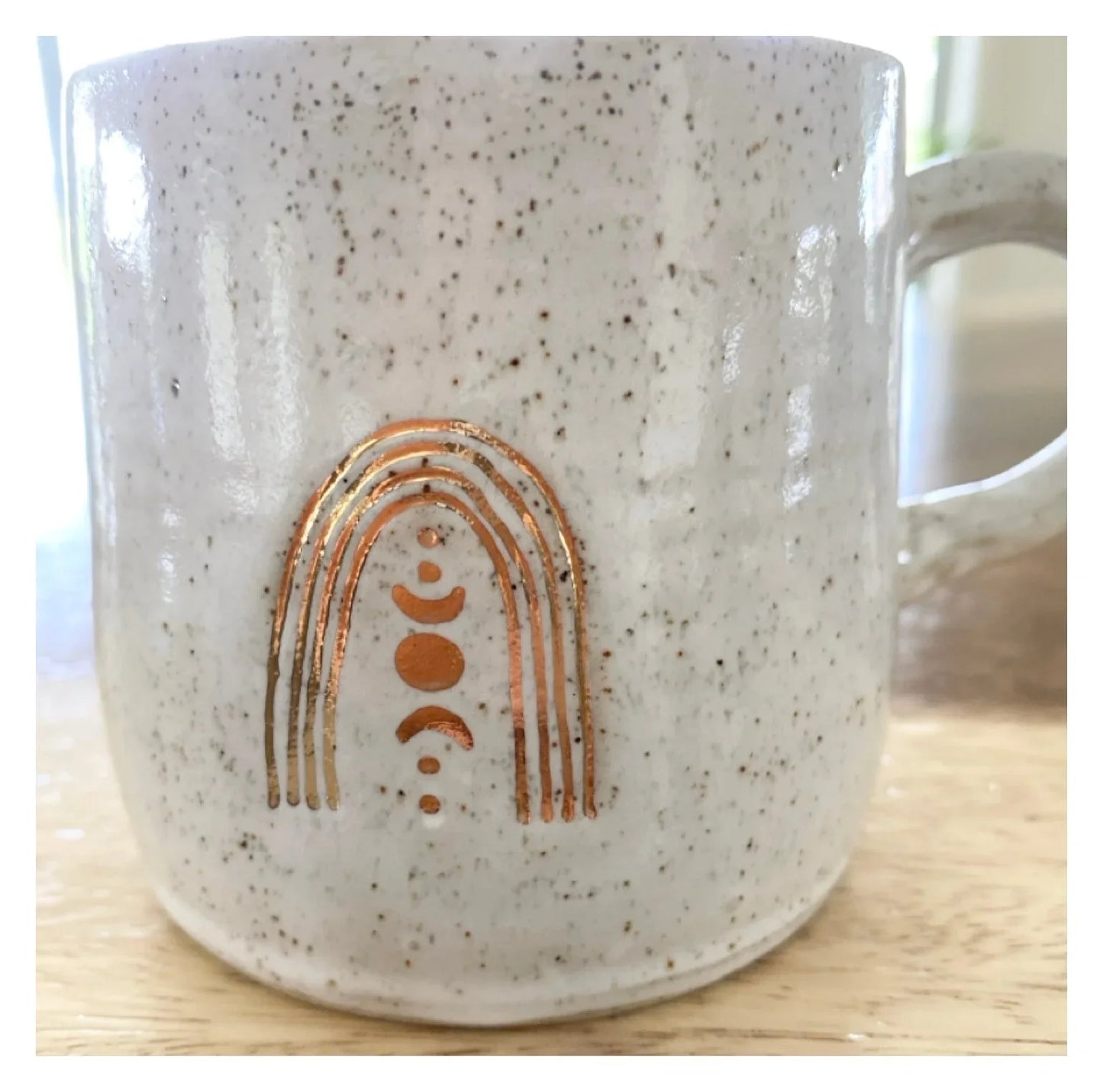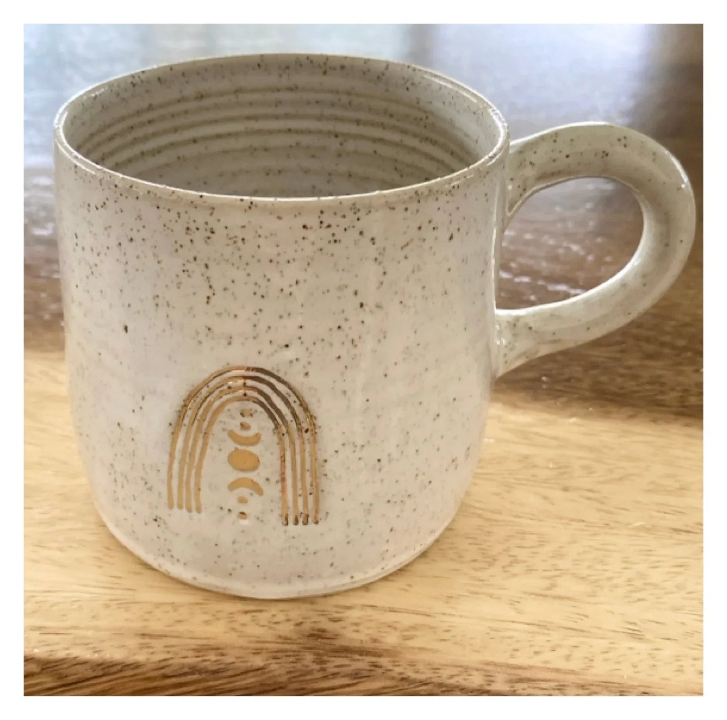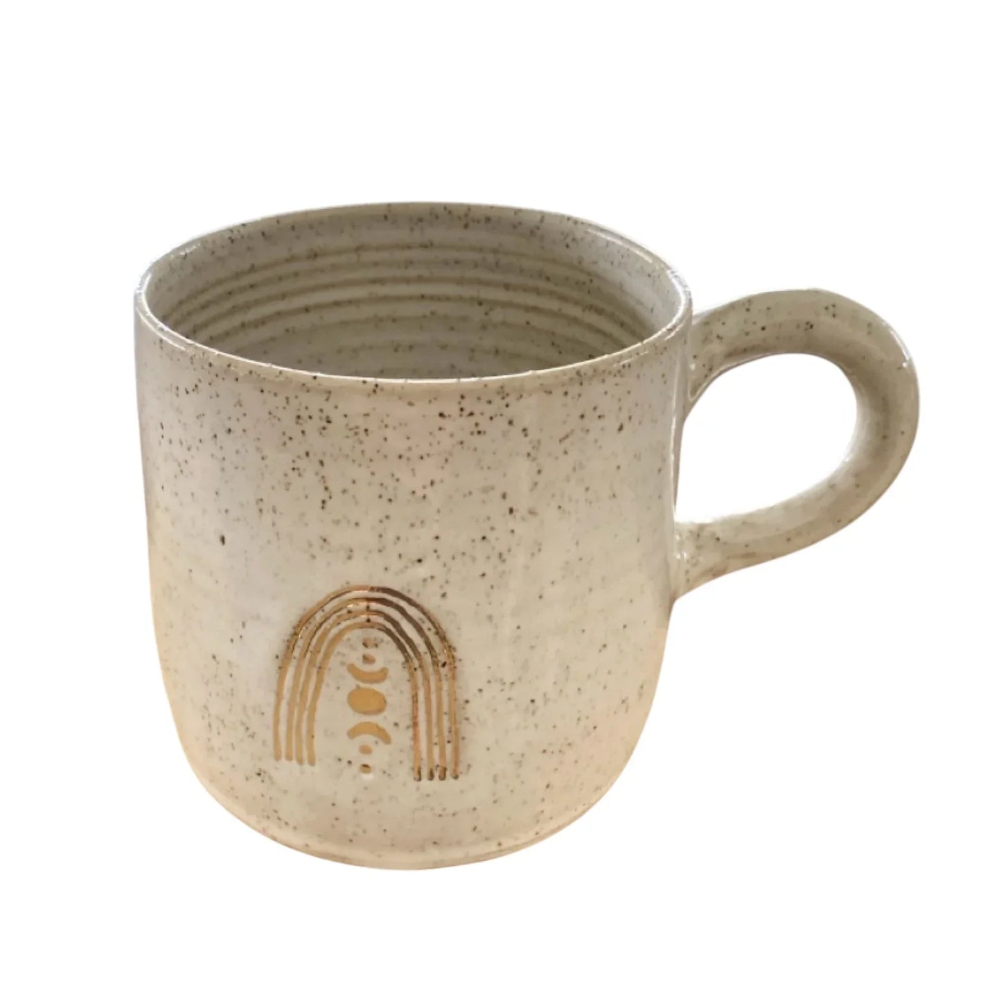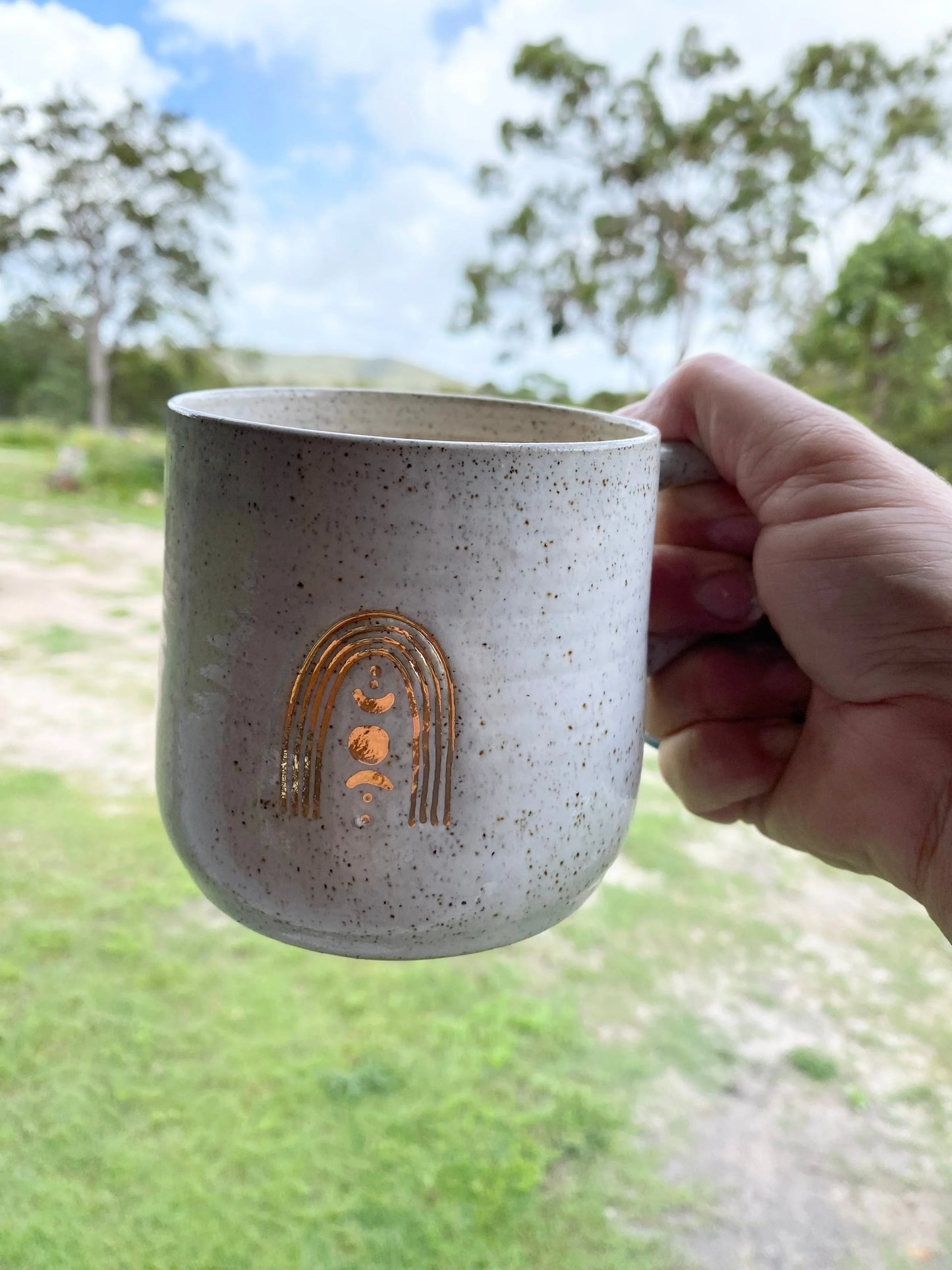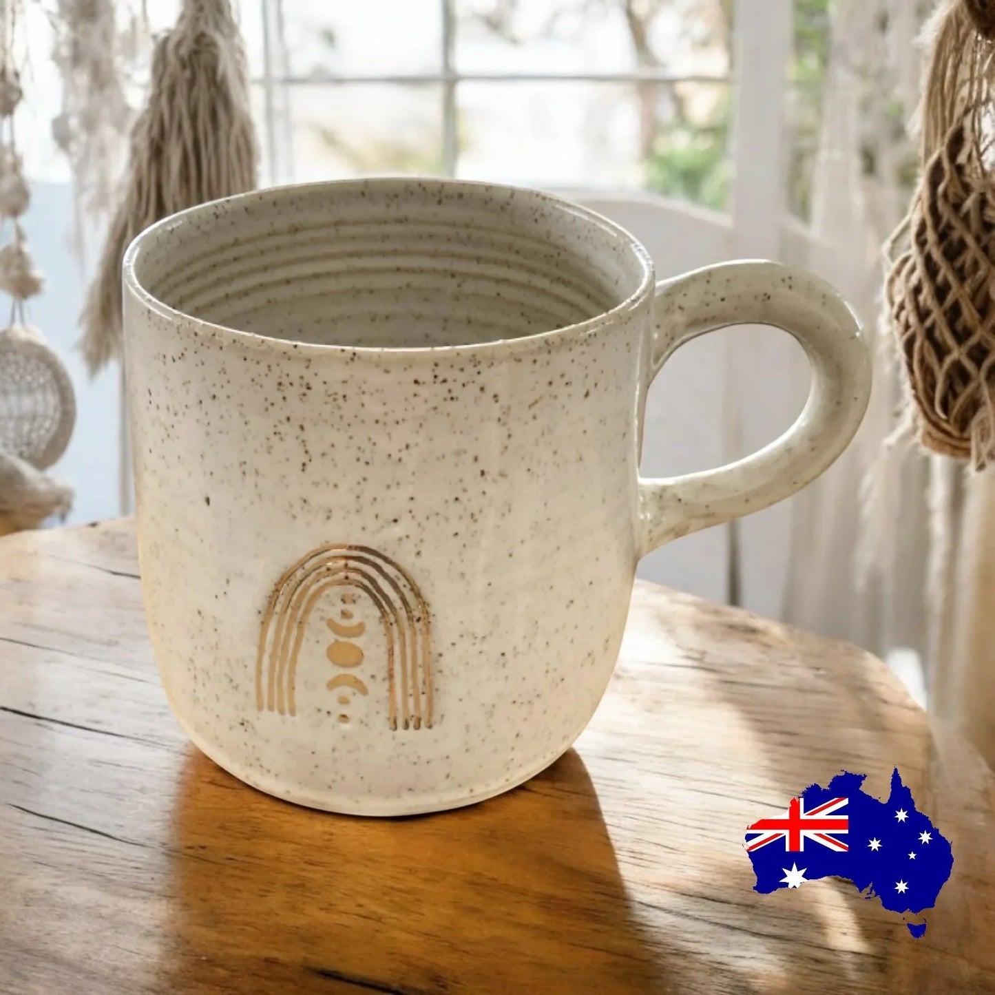 Indulge in your daily coffee tea cacao or any other favorite drink with our Aussie made, handcrafted clay pottery mug cup by Johanna from Wolf and Clay. Created from natural, sustainable materials, this exquisite and unique cup is perfect for home style, this mug also makes for a thoughtful gift for rainbow and Moon Phase lovers.  Holds approximately up to 375ml of liquid.