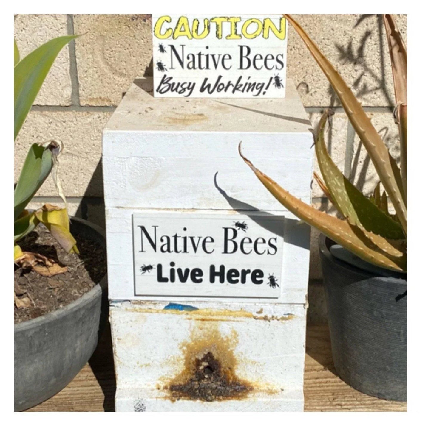 Native bees live here sign Transform your garden into a sanctuary for native bees with this easy to display sign. A great way to support pollinators while adding a charming touch to your outdoor space.