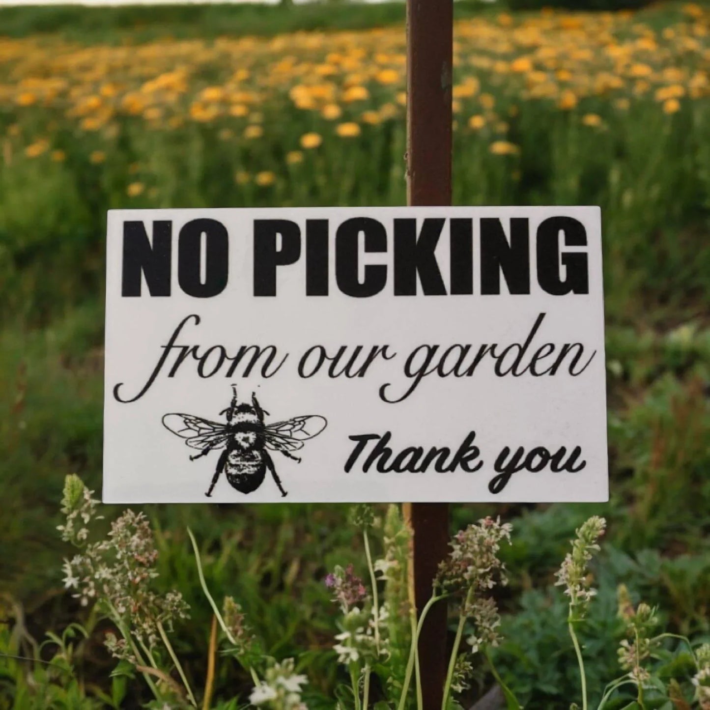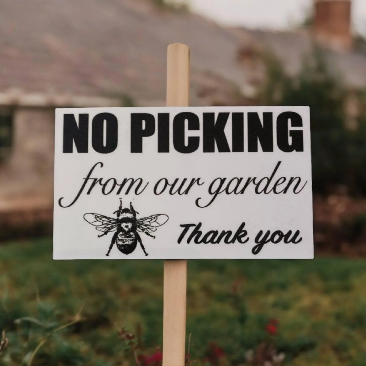 Our No Picking From Our Garden Gardeners Sign can be displayed in your garden, local community, or shared vegetable garden to politely discourage visitors from picking your produce and flowers.