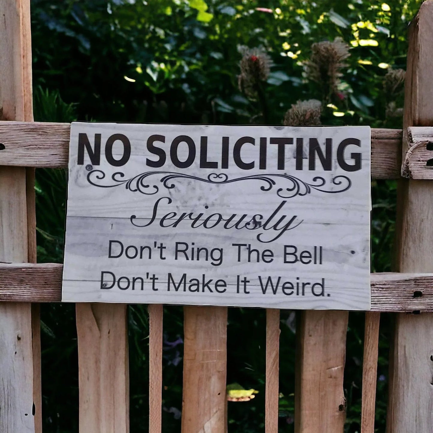 No Soliciting Seriously Rustic Sign Deter unwanted visitors in style with the No Soliciting Seriously Rustic Sign. Made of Acrylic for easy Outdoor use and featuring a classic design, this sign clearly communicates your wishes and adds a touch of charm to your property entrance.