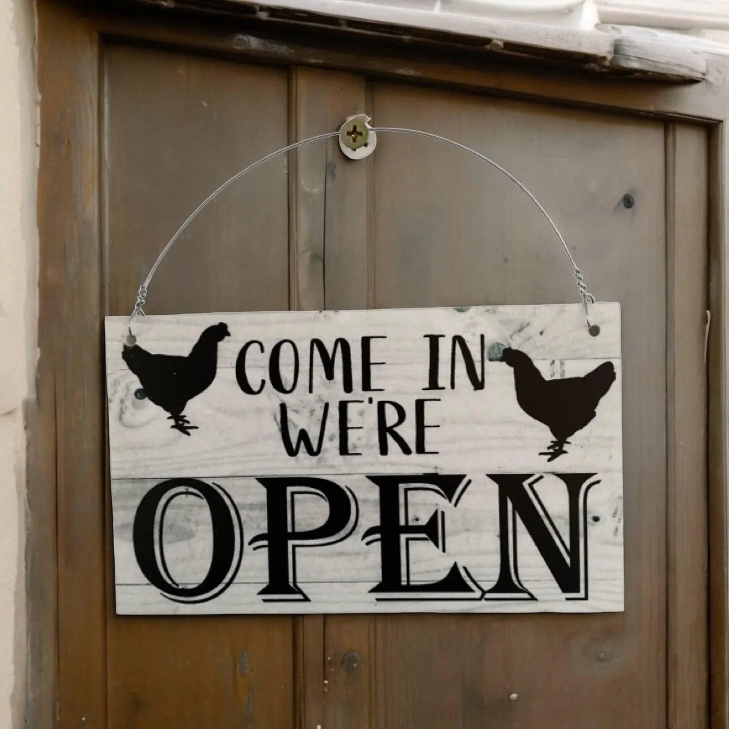 Welcome your customers with our stylish Open Closed Chicken Butcher Egg Hanging Sign - a must-have for any Butcher, Free Range Farm Shop, Selling of Eggs or any other Farmhouse Country Style Retail Shop business just to name a few! Let the sign do the talking and easily inform customers whether you're open or closed.
