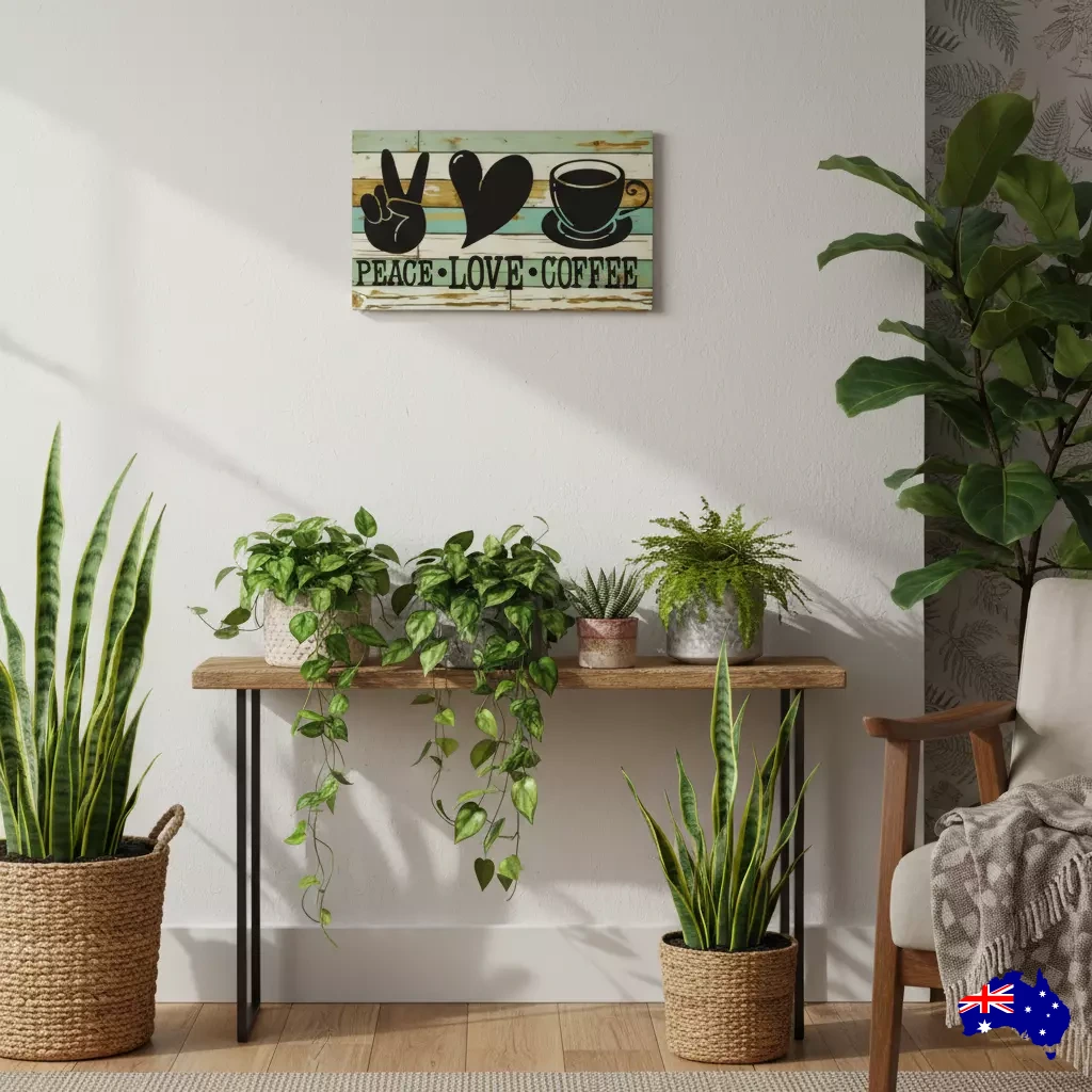 Bring harmony and warmth into your home with this meaningful sign. Celebrating the trio of peace, love, and coffee, it's a powerful reminder of what truly enriches our lives. Display it proudly at your entrance or throughout your space to create an inviting atmosphere that welcomes everyone who visits. Perfect for those who embrace mindfulness, cherish genuine connections, and savour life's comforting moments. This distinctive piece transforms any room into a sanctuary of positivity and authenticity.