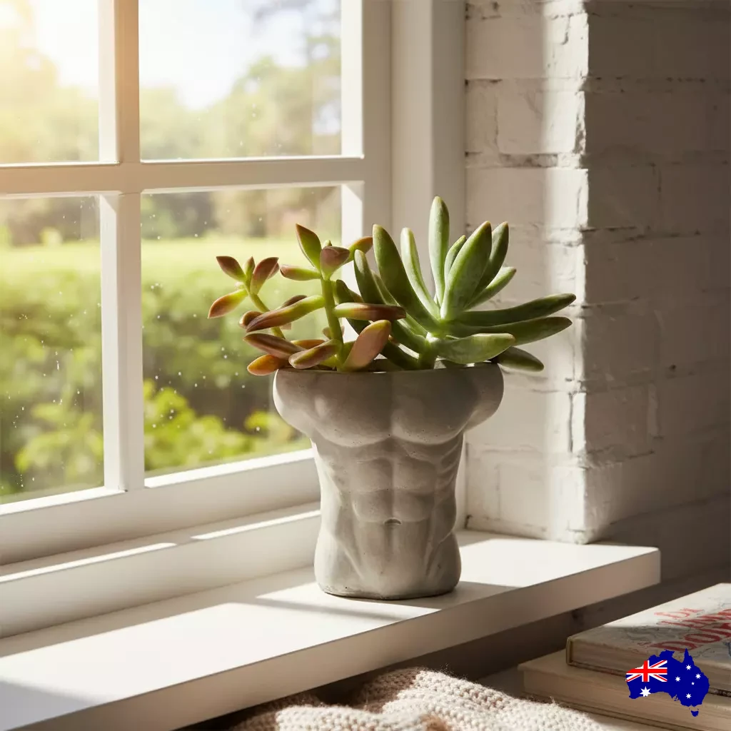 Display your treasured succulents, cacti, or air plants in this charming handmade concrete Man Bod vase or planter. Beyond its practical use as a plant home, it doubles as a flower vase, pen holder, toothbrush bathroom organizer, or standalone decorative accent that brings Australian artisanal character to any shelf or desk. Each one made is uniquely crafted by Renee with a rustic, imperfect finish that enhances its charm. Made to order, please allow time for its careful handmade creation. Approximate Size is 8.7cm x 7.8cm