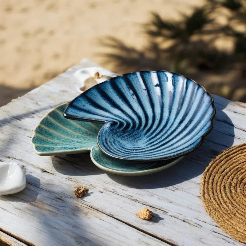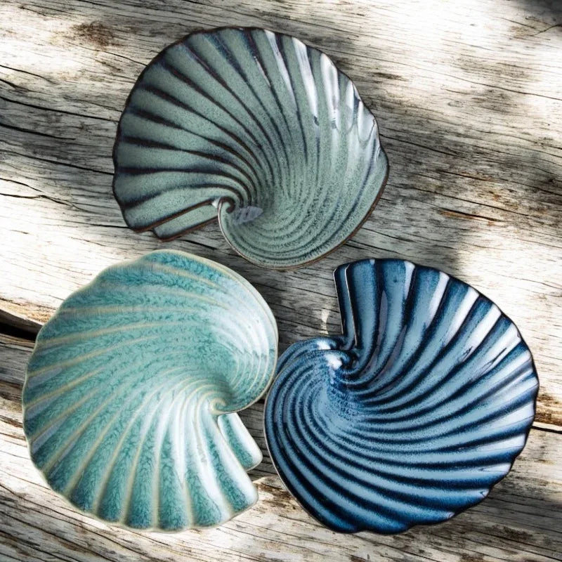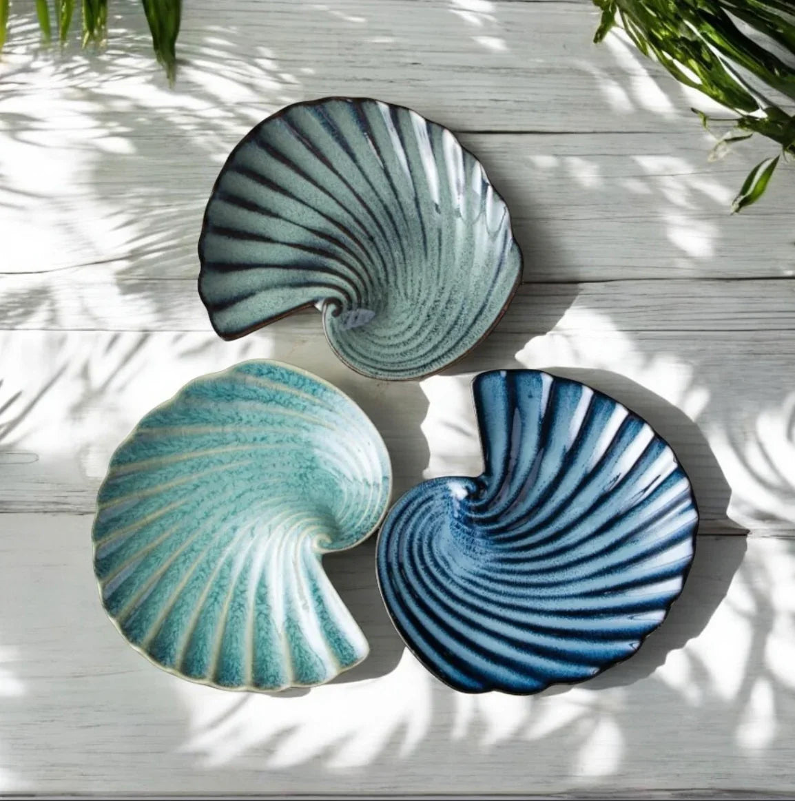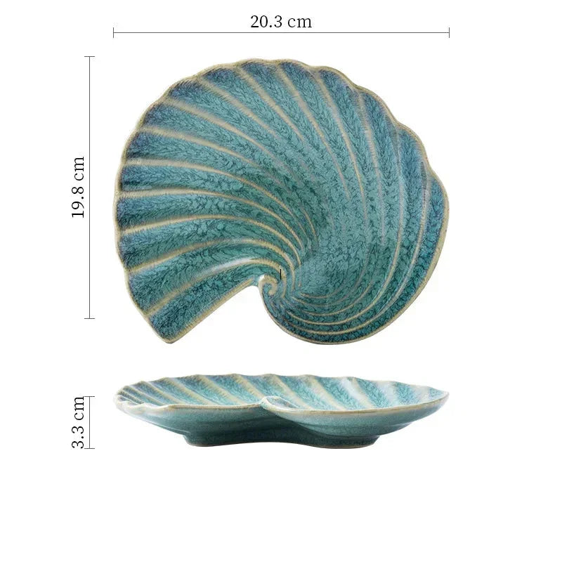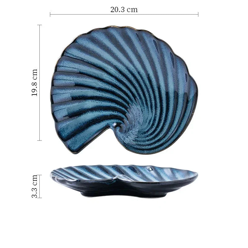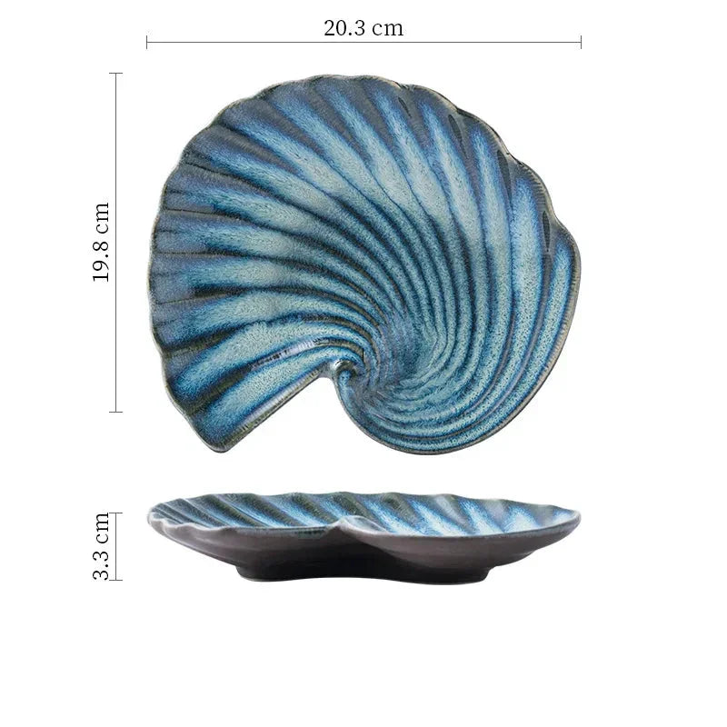 Elevate your dishes and add sophistication to your dinner table with this gorgeous blues aqua grey tones Plate Shell Coastal Beach House Kitchen serving platter or plate. Handcrafted from kiln glaze ceramic, this plate features a stunning shell-shaped design perfect for any coastal beach house. Use it to serve salads, fruits, desserts, or meats, or display your bits and bobs, such as soaps, in the bathroom. Approximate Sizes 20.3cm x 19.8cm.