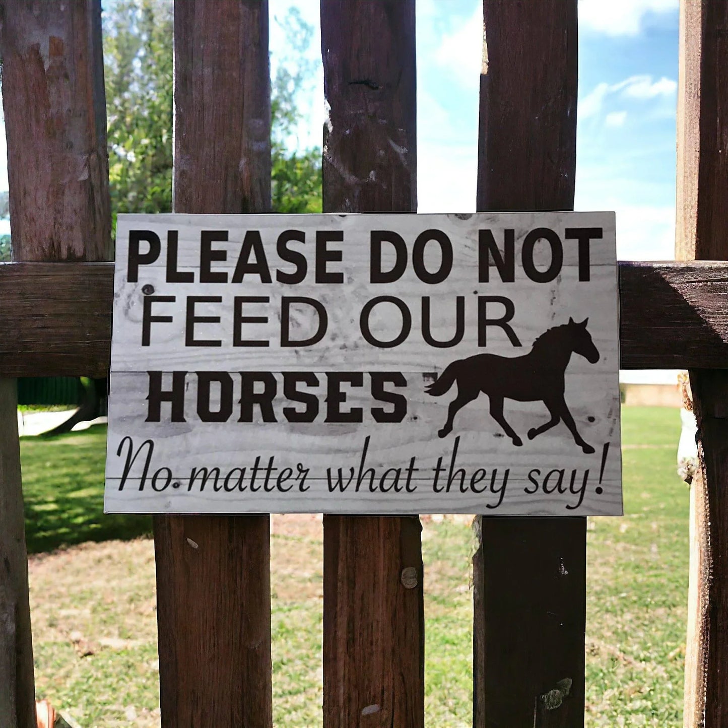 Displaying our "Please Do Not Feed Our Horses" sign on your fences can effectively promote the health and well-being of your beloved horses, by clearly conveying the message to not feed them.