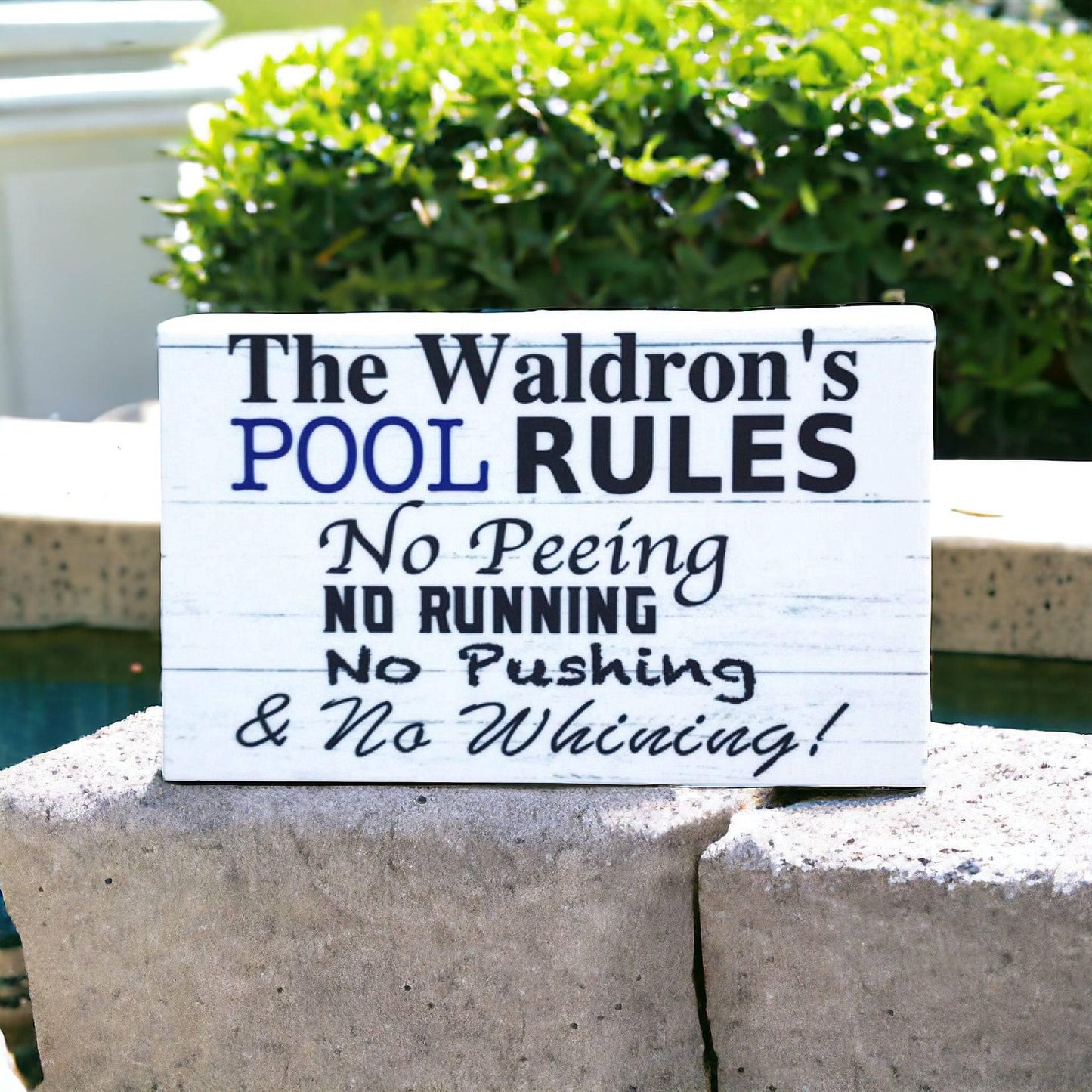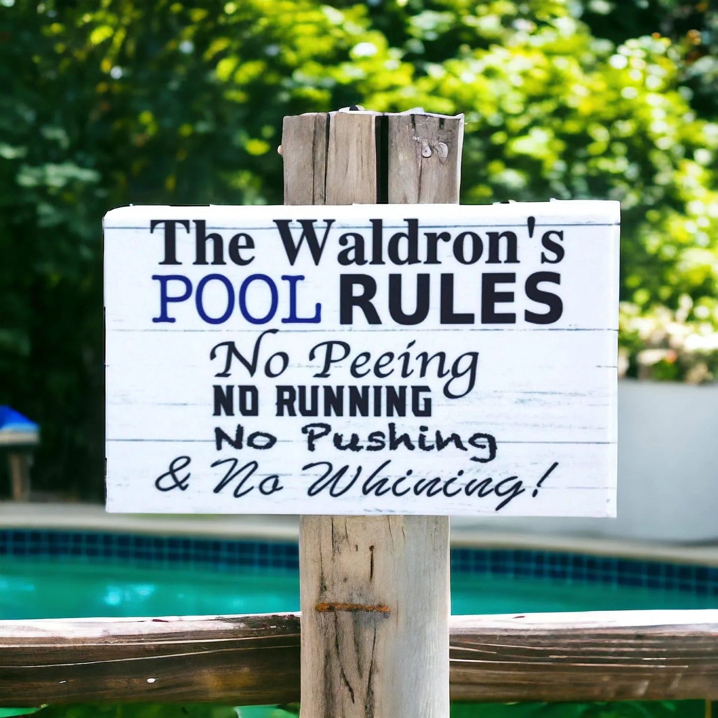 Pool Rules No Peeing No Pushing No Running No Whining Custom Name Sign Make sure everyone follows your family pool rules. It's a fun way to ensure safety and maintain a clean environment.